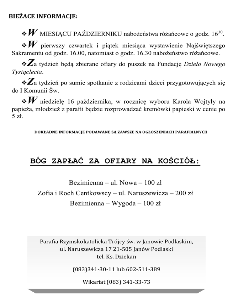 BIEŻACE INFORMACJE: W MIESIĄCU PAŹDZIERNIKU nabożeństwa różańcowe o godz. 1630. W pierwszy czwartek i piątek miesiąca wystawienie Najświętszego Sakramentu od godz. 16.00, natomiast o godz. 16.30 nabożeństwo różańcowe. Z a tydzień będą zbierane ofiary do puszek na Fundację Dzieło Nowego Tysiąclecia. Z a tydzień po sumie spotkanie z rodzicami dzieci przygotowujących się do I Komunii Św. W niedzielę 16 października, w rocznicę wyboru Karola Wojtyły na papieża, młodzież z parafii będzie rozprowadzać kremówki papieski w cenie po 5 zł. DOKŁADNE INFORMACJE PODAWANE SĄ ZAWSZE NA OGŁOSZENIACH PARAFIALNYCH BÓG ZAPŁAĆ ZA OFIARY NA KOŚCIÓŁ: Bezimienna – ul. Nowa – 100 zł Zofia i Roch Centkowscy – ul. Naruszewicza – 200 zł Bezimienna – Wygoda – 100 zł Parafia Rzymskokatolicka Trójcy św. w Janowie Podlaskim, ul. Naruszewicza 17 21-505 Janów Podlaski tel. Ks. Dziekan (083)341-30-11 lub 602-511-389 Wikariat (083) 341-33-73 Konto Parafialne: 2 październik 2016 r. Nr 40 W CIENIU KOLEGIATY PISMO PARAFII TRÓJCY ŚW. W JANOWIE PODLASKIM -do użytku wewnętrznego- XXVII NIEDZIELA W CIĄGU ROKU Apostołowie prosili Pana: Przymnóż nam wiary. Pan rzekł: Gdybyście mieli wiarę jak ziarnko gorczycy, powiedzielibyście tej morwie: Wyrwij się z korzeniem i przesadź się w morze, a byłaby wam posłuszna. Kto z was, mając sługę, który orze lub pasie, powie mu, gdy on wróci z pola: Pójdź i siądź do stołu? Czy nie powie mu raczej: Przygotuj mi wieczerzę, przepasz się i usługuj mi, aż zjem i napiję się, a potem ty będziesz jadł i pił? Czy dziękuje słudze za to, że wykonał to, co mu polecono? Tak mówcie i wy, gdy uczynicie wszystko, co wam polecono: Słudzy nieużyteczni jesteśmy; wykonaliśmy to, co powinniśmy wykonać. Łk 17, 5-10 FRAGMENT ROZWAŻANIA DO SŁOWA BOŻEGO Kiedy Apostołowie prosili Chrystusa: „Przymnóż nam wiary”, to prawdopodobnie nie wiedzieli, o co prosili. I to chyba chciał im uświadomić Jezus – jak wielką moc mogą otrzymać do swej dyspozycji. Oczywiście, siła ta w żadnym wypadku nie powinna służyć popisywaniu się sztuczkami typu: „Morwo, przesadź się w morze”. Chrystus to nie David Coperfield: nie chce nas zabawiać, lecz zbawiać. I tak samo Kościół: nie jest instytucją rozrywkową ani magiczną pałeczką, lecz środowiskiem życia duchowego i drogą do Boga. (…). Bóg daje ją każdemu, kto chce. Ale trzeba wyraźnie Bogu okazać swoją wolę przyjęcia daru wiary. Po prostu, człowiek musi zadecydować, że chce wiary, że potrzebuje Boga i Jego daru. (…). I dlatego człowiek ponosi odpowiedzialność za to, co zrobi z darem wiary: wykorzysta go czy zmarnuje. Ks. Mariusz Pohl PONIEDZIAŁEK – 3 październik 2016 7.00 1. + Jana i Jadwigę Dragulskich – greg. 2. + Zofię Zielińską (1r), Antoninę, Piotra, Teresę – Brat Stanisław 3. + Kazimierę Sobiesiek – Koleżanki siostry Zmarłej 17.00 1. + Jacka Ostępa 2. + Kazimierę Kauczor – Mąż i dzieci WTOREK – 4 październik 2016 Wspomnienie św. Franciszka z Asyżu 7.00 1. + Jana i Jadwigę Dragulskich – greg. 2. + Ryszarda (r), Barbarę, zr. Andrzejewiczów i Szewczuków - Rodzina 17.00 1. + Anielę (3r) – Rodzina 2. + Franciszka (r), Zofię, Aleksandra, Bronisławę, Helenę – Córka z wnuczką ŚRODA – 5 października 2016 Wspomnienie św. Faustyny Kowalskiej, dziewicy 7.00 1. + Jana i Jadwigę Dragulskich – greg. 2. + Jadwigę i Grzegorza Dunajko, zr. Dunajków, Tereszków i Lenartowiczów – Rodzina 17.00 1. + Władysławę Filipiuk (19r) – Mąż Henryk 2. + Jadwigę (r), Włodzimierza, Wacława, Krystynę – Teresa Wawryniuk CZWARTEK – 6 października 2016 I czwartek miesiąca 7.00 1. + Sabinę Kwiatkowską (1r) – Rodzina 2. + Jana i Jadwigę Dragulskich – greg. 17.00 1. + Józefa (r), Zbigniewa – Franciszka Hordyjewicz 2. + Kazimierę (16r), Jana, zr. Kapłanów i Kotlarczuków – Syn PIĄTEK – 7 październik 2016 Wspomnienie NMP Różańcowej, I piątek miesiąca 7.00 1. + Jana i Jadwigę Dragulskich – greg. 2. + Stanisława (r), Józefę, zr. Andrzejuków, Ziniewiczów, Kuców – Stanisława Andrzejuk 3. + Kazimierę Sobiesiek (9dz) 17.00 1. + Romualda Wawryniuka – Żona 2. + KRK z Janowa Podlaskiego zel. Haliny Chomiuk i zm. z ich rodzin 3. + Józefa Daniluka (9dz) SOBOTA – 8 październik 2016 7.00 1. + Jana i Jadwigę Dragulskich – greg. 2. + Karola Samsoniuka – Żona 3. + Antoninę Szewczuk (3r), Piotra, Teresę, Zofię – Syn Stanisław 17.00 1. Dz.-Bł. w 25 r. śl. Urszuli i Roberta 2. + Sabinę (r), Wiktora, zr. Brzezińskich – Dzieci NIEDZIELA – 9 październik 2016 XXVIII Niedziela w ciągu roku 8.00 1. + Józefa (3r), Bronisławę, Aleksandra, zr. Owerków i Bechtów – Żona 2. + Eugeniusza Gryglasa (r) – Rodzina 9.30 1. + Jana i Jadwigę Dragulskich – greg. 2. + Józefa Podskoka – Maria Podskok z rodziną 3. + KRK z Klonownicy Małej zel. Agnieszki Caruk i za zm. z ich rodzin 11.30 ZA PARAFIAN 1. + Mariannę (r), Zygmunta Podskoka, rodz. z obu str. – Zygmunt Podskok 2. + Jana Sokoluka (17r) – Żona i dzieci 17.00 1. + Nadzieję (r), Edwarda, Zbigniewa, Mariannę, Stanisława, zr. Samków - Rodzina 2. + Jadwigę (11r), Stanisława, Janinę, zr. Kwiatkowskich – Rodzina