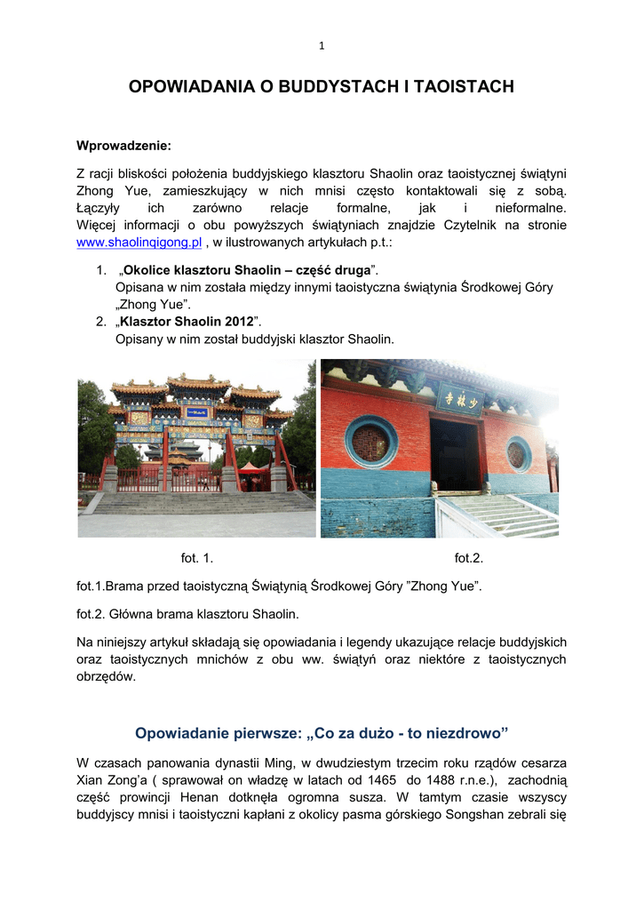 1 OPOWIADANIA O BUDDYSTACH I TAOISTACH Wprowadzenie: Z racji bliskości położenia buddyjskiego klasztoru Shaolin oraz taoistycznej świątyni Zhong Yue, zamieszkujący w nich mnisi często kontaktowali się z sobą. Łączyły ich zarówno relacje formalne, jak i nieformalne. Więcej informacji o obu powyższych świątyniach znajdzie Czytelnik na stronie www.shaolinqigong.pl , w ilustrowanych artykułach p.t.: 1. „Okolice klasztoru Shaolin – część druga”. Opisana w nim została między innymi taoistyczna świątynia Środkowej Góry „Zhong Yue”. 2. „Klasztor Shaolin 2012”. Opisany w nim został buddyjski klasztor Shaolin. fot. 1. fot.2. fot.1.Brama przed taoistyczną Świątynią Środkowej Góry ”Zhong Yue”. fot.2. Główna brama klasztoru Shaolin. Na niniejszy artykuł składają się opowiadania i legendy ukazujące relacje buddyjskich oraz taoistycznych mnichów z obu ww. świątyń oraz niektóre z taoistycznych obrzędów. Opowiadanie pierwsze: „Co za dużo - to niezdrowo” W czasach panowania dynastii Ming, w dwudziestym trzecim roku rządów cesarza Xian Zong’a ( sprawował on władzę w latach od 1465 do 1488 r.n.e.), zachodnią część prowincji Henan dotknęła ogromna susza. W tamtym czasie wszyscy buddyjscy mnisi i taoistyczni kapłani z okolicy pasma górskiego Songshan zebrali się 2 przed świątynią Króla Smoka modląc się deszcz. W trakcie modłów zaczęli się oni z sobą przekomarzać. Niestety, sprawy szybko wymknęły się z pod kontroli, i niewinne żarty przeszły w poważną polemikę, opartą o religijne dogmaty. W następstwie tego, obie strony poczuły się obrażone i podały sprawę do rozważenia i rozstrzygnięcia w sądzie. Gdy skarga dotarła przed oblicze sędziego powiatowego okręgu Yamen, ten jedynie niedbale zerknął na pismo i postanowił, że temat sporu nie jest wart, by zawracał nim sobie głowę. Nie miał on zamiaru tracić czas na „głupich mnichów”, mających czelność podać sprawę swoich dziecinnych żartów do rozpatrzenia przez sąd. W jego mniemaniu posunęli się w swych działaniach zdecydowanie za daleko. Mocno poirytowany powiedział do nich: „Jeśli wy - mnisi i kapłani nie potraficie z siebie nawzajem żartować, któż inny może to uczynić?”. Po tych słowach oddalił ich skargę, a mnisi rozeszli się do swoich świątyń. Jak widać na powyższym przykładzie, buddyjscy mnisi oraz taoistyczni kapłani traktując żarty z siebie nazbyt poważnie, doprowadzili do powstania oficjalnie usankcjonowanego religijnego konfliktu. Dobrze jest, gdy żartując z kogoś posiada się jednocześnie pewien dystans do własnej osoby, i potrafi śmiać również z samego siebie . Opowiadanie drugie: „Droga do macierzyństwa” Powiada się, że od początku panowania Północnej Dynastii Song w taoistycznej świątyni „Zhong Yue” corocznie odbywały się dwa festiwale: pierwszy w okresie trzeciego księżycowego miesiąca, a drugi w okresie dziesiątego księżycowego miesiąca. W czasie ich trwania, oprócz czczenia świątynnych bóstw i składania im darów, wielu okolicznych wiernych przychodziło do świątyni modląc się w intencji swych synów i córek oraz składając rozmaite obietnice, zobowiązując się je w przyszłości spełnić. Jeśli na przykład młoda kobieta nie była w stanie dać swemu mężowi męskiego potomka, jej matka i teściowa udawały się wraz z nią do świątyni „Zhong Yue” przynosząc do niej kadzidła. Po wejściu na jej teren zapalały je, i modląc się w powyższej intencji, trzymając w dłoniach tlące się kadzidła, udawały się do głównej bramy świątyni o nazwie „Pawilon Środka Nieba”. Tam, młoda kobieta pragnąca urodzić syna, przechodziła przez przebiegający jej wnętrzem tunel, kłaniając się głęboko z każdym krokiem, i „zginając ciało w łuk”. Z każdym wykonanym trzecim krokiem i pokłonem „zaliczała” ona jeden rytualny religijny cykl zwany „Li”. Poruszając się tym sposobem podążała ona aż posągu „Króla Środka Nieba”, stojącego we wnętrzu „Głównego Pawilonu” świątyni. 3 fot. 3. fot. 4. fot. 5. fot. 3: Brama główna świątyni zwana „Pawilonem Środka Nieba”. fot. 4: Tunel przebiegający przez ww. bramę, stanowiący wejście do świątyni. fot. 5: Figura cesarza Chongsheng – „Króla Środka Nieba”. Zgodnie z taoistycznym rytuałem, młoda kobieta powinna następnie zapalić kadzidło i modląc się, kilkakrotnie obejść ołtarz z posągiem „Króla Środka Nieba”, po czym wziąć z niego okrągłą glinianą lalkę, owinąć ją czerwonymi wełnianymi nićmi i ukryć pod odzieżą z przodu ciała. Po uczynieniu tego, zostaje ona dostrzeżona przez „Bóstwo Środkowej Góry”, jednak, aby jej prośby zostały przez nie usłyszane, musi zwrócić się w stronę posągu bóstwa „Króla Środka Nieba” mówiąc: „Nazywam się ( tak, a tak), zamieszkuję (na takiej, a takiej) ulicy, ( w takiej, a takiej) dzielnicy, we wsi (o takiej, a takiej nazwie), lub w mieście ( o następującej nazwie) , bądź też w okręgu (o takiej, a takiej nazwie). Dom, w którym mieszkam wygląda następująco( musi precyzyjnie opisać wygląd domu), posiada bramę od strony ulicy ( o takim, a takim ) wyglądzie, moja rodzina liczy ( tyle, a tyle członków), tworzą ją następujące osoby: ( należy wymienić i opisać każdą z nich, podając w jakim jest wieku). Na końcu powinna ona opisać samą siebie, podając swój wiek oraz problem z którym się zwraca do bóstwa; w tym przypadku, niemożność poczęcia męskiego potomka. W kolejnych słowach prosi ona „Bóstwo Środkowej Góry”, by używszy swej mocy pozwoliło jej począć i urodzić zdrowego syna oraz zapewnić mu długie i dostatnie życie. Po tych słowach zobowiązuje się ona do przekazania bóstwu świątyni po narodzinach syna w jego pierwsze urodziny dziękczynny dar, określając precyzyjnie, jaki on będzi
