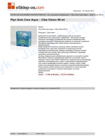 w ą Utworzono : 07 marzec 2017 PŁYNY DO SOCZEWEK KONTAKTOWYCH > Do soczewek kontaktowych > Płyn Solo Care Aqua – Ciba Vision 90 ml r ó t Płyn Solo Care Aqua – Ciba Vision 90 ml k ć Model : - Płyn Solo Care Aqua – Ciba Vision 90 ml Producent : Ciba Vision k y ś o SOLO-care AQUA - wielofunkcyjny płyn do soczewek kontaktowych bez czyszczenia i spłukiwania . Rewolucyjny system Hydrolock zawierający prowitaminę B5 zapewnia długotrwały efekt nawilżenia soczewek. Antybakteryjny pojemnik na soczewki z systemem MicroBlock zawierający jony srebra niszczy mikroorganizmy i bakterie. Dzięki systemowi Hydrolock utrzymasz dobre nawilżenie swoich soczewek przez cały dzień. Hydrolock to rewolucyjna formuła zawierająca prowitaminę B5, składnik nawilżający używany w terapii suchego oka oraz sorbitol, który zatrzymuje nawilżenie i zapobiega wysychaniu soczewek. Do płynu dołączony jest antybakteryjny pojemnik na soczewki z system Micro Block. Pierwszy antybakteryjny pojemnik na soczewki, tylko w zestawie z SOLO-care AQUA! Pojemnik ten wykonany jest ze specjalnego materiału zawierającego jony srebra o własnościach antybakteryjnych. Jony srebra zapobiegają wzrostowi bakterii, drożdży i pleśni, dzięki czemu oczy pozostają zdrowe a noszenie soczewek komfortowe. Przed użyciem należy zapoznać się z podanymi na ulotce wewnątrz opakowania instrukcjami i ważnymi informacjami na temat bezpieczeństwa. J - k a Cena : 17,00 zł Brutto ( 15,74 zł Netto) Dostępność: Produkt dostępny w naszym sklepie od 01 czerwiec 2010 kontakt : - [email protected] Strona 1/{nb}