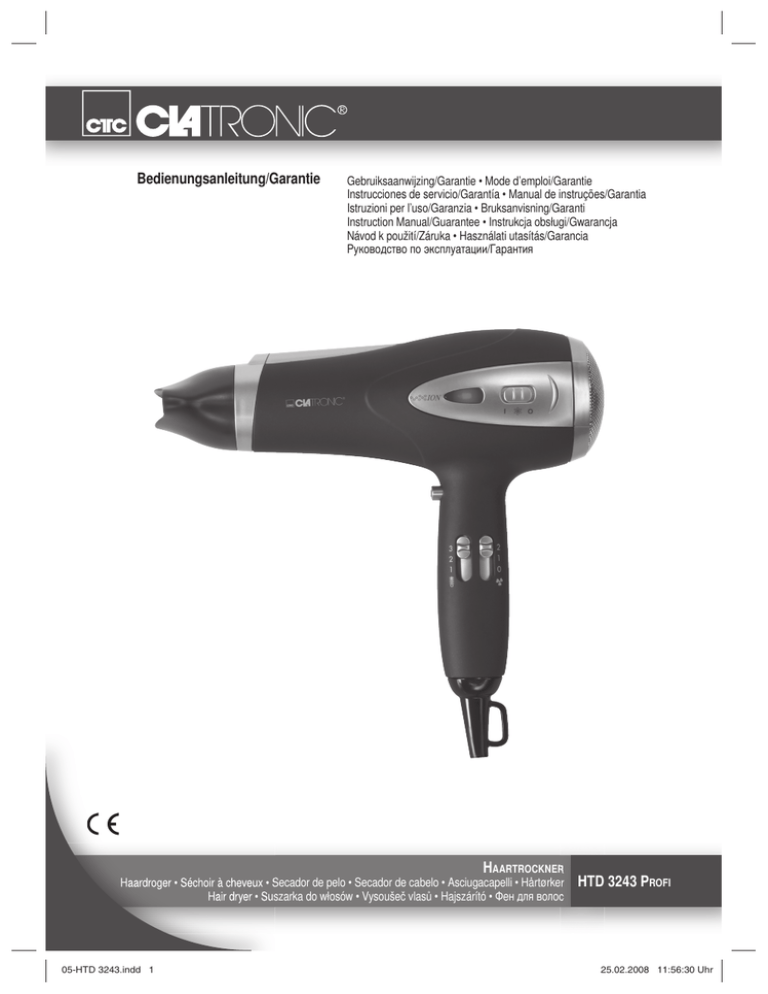 Bedienungsanleitung/Garantie Gebruiksaanwijzing/Garantie • Mode d’emploi/Garantie Instrucciones de servicio/Garantía • Manual de instruções/Garantia Istruzioni per l’uso/Garanzia • Bruksanvisning/Garanti Instruction Manual/Guarantee • Instrukcja obsługi/Gwarancja Návod k použití/Záruka • Használati utasítás/Garancia Руководство по эксплуатации/Гарантия HAARTROCKNER Haardroger • Séchoir à cheveux • Secador de pelo • Secador de cabelo • Asciugacapelli • Hårtørker Hair dryer • Suszarka do włosów • Vysoušeč vlasů • Hajszárító • Фен для волос 05-HTD 3243.indd 1 HTD 3243 PROFI 25.02.2008 11:56:30 Uhr DEUTSCH Allgemeine Sicherheitshinweise Lesen Sie vor Inbetriebnahme dieses Gerätes die Bedienungsanleitung sehr sorgfältig durch und bewahren Sie diese inkl. Garantieschein, Kassenbon und nach Möglichkeit den Karton mit Innenverpackung gut auf. Falls Sie das Gerät an Dritte weitergeben, geben Sie auch die Bedienungsanleitung mit. • Benutzen Sie das Gerät ausschließlich für den privaten und den dafür vorgesehenen Zweck. Dieses Gerät ist nicht für den gewerblichen Gebrauch bestimmt. Benutzen Sie es nicht im Freien. Halten Sie es vor Hitze, direkter Sonneneinstrahlung, Feuchtigkeit (auf keinen Fall in Flüssigkeiten tauchen) und scharfen Kanten fern. Benutzen Sie das Gerät nicht mit feuchten Händen. Bei feucht oder nass gewordenem Gerät sofort den Netzstecker ziehen. Schalten Sie das Gerät aus und ziehen Sie immer den Stecker aus der Steckdose (ziehen Sie am Stecker, nicht am Kabel) wenn Sie das Gerät nicht benutzen, Zubehörteile anbringen, zur Reinigung oder bei Störung. Betreiben Sie das Gerät nicht unbeaufsichtigt. Sollten Sie den Arbeitsplatz verlassen, schalten Sie das Gerät bitte immer aus, bzw. ziehen Sie den Stecker aus der Steckdose (ziehen Sie am Stecker, nicht am Kabel). Prüfen Sie Gerät und Kabel regelmäßig auf Schäden. Ein beschädigtes Gerät bitte nicht in Betrieb nehmen. Reparieren Sie das Gerät nicht selbst, sondern suchen Sie bitte einen autorisierten Fachmann auf. Um Gefährdungen zu vermeiden, ein defektes Netzkabel bitte nur vom Hersteller, unserem Kundendienst oder einer ähnlich qualifizierten Person durch ein gleichwertiges Kabel ersetzen lassen. Verwenden Sie nur Original-Zubehör. Beachten Sie bitte die nachfolgenden „Speziellen Sicherheitshinweise“. • • • • • • • • • • Inbetriebnahme • • • • • Position Position 1: 2: Position 3: Position Position Position niedrige Temperatur mäßige Temperatur für sanftes Trocknen und Formen. hohe Temperatur für schnelles Trocknen. 0: 1: 2: Aus sanfter Luftstrom starker Luftstrom COOL SHOT (Kaltluft) ❄ Um Kinder oder gebrechliche Personen vor den Gefahren elektrischer Geräte zu schützen, beachten Sie, dass dieses Gerät nur unter Aufsicht verwendet wird. Dieses Gerät ist kein Spielzeug. Lassen Sie kleine Kinder nicht damit spielen. Mit diesem Schalter unterbrechen Sie den Heizvorgang. Halten Sie die Taste entsprechend der gewünschten Intervalllänge in dieser Position fest. Beim Loslassen der Taste geht dieser automatisch wieder in die Ausgangsstellung zurück. Ausschalten • Symbole auf dem Produkt Auf dem Produkt finden Sie Symbole mit Warn- oder Informationscharakter: Warnung vor elektrischem Schlag! Dieses Gerät nicht in der Nähe von Badewannen, Waschbecken oder andern Gefäßen benutzen, die Wasser enthalten. Um den Aufsatz zu wechseln, ziehen Sie diesen ab und setzen Sie den neuen Aufsatz auf, so dass er einrastet. Stecken Sie den Netzstecker in eine vorschriftsmäßig installierte Schutzkontakt- Steckdose 230 V, 50 Hz. Stellen Sie die gewünschte Gebläsestufe ( Schalter) ein: WARNUNG! Lassen Sie kleine Kinder nicht mit Folie spielen. Es besteht Erstickungsgefahr! Spezielle Sicherheitshinweise für dieses Gerät Mit der Frisierdüse lassen sich durch Bündelung des Luftstroms einzelne Haarpartien gezielt trocknen. Mit dem Diffuser trocknen Sie ideal, ohne Volumenverlust, gelocktes Haar. Stellen Sie die gewünschte Heizstufe am Griff ( Schalter) ein: Zur Sicherheit Ihrer Kinder lassen Sie keine Verpackungsteile (Plastikbeutel, Karton, Styropor, etc.) erreichbar liegen. • Wickeln Sie das Netzkabel vollständig ab. Setzen Sie eine Düse auf. • Kinder und gebrechliche Personen • Warnung: Die Düsen werden bei Betrieb heiß! Wird der Haartrockner im Badezimmer verwendet, ziehen Sie nach Gebrauch den Netzstecker, da die Nähe von Wasser eine Gefahr darstellt. Dies gilt auch, wenn der Haartrockner ausgeschaltet ist. Achten Sie darauf, dass das Ansauggitter frei von Fusseln oder Haaren bleibt. Brandgefahr! Als zusätzlicher Schutz wird die Installation einer Fehlerstrom-Schutzeinrichtung (RCD) mit einem Bemessungsauslösestrom von nicht mehr als 30 mA im BadezimmerStromkreis empfohlen. Lassen Sie sich bitte von einem autorisierten Elektroinstallateur beraten. • • Schieben Sie den rechten Schalter ( ) nach dem Gebrauch auf Position „0“ und ziehen Sie den Netzstecker. Lassen Sie das Gerät vor dem Wegräumen abkühlen! Hängen Sie das Gerät an der Aufhängeöse auf. Ionisierungsfunktion – Reduzierung von elektrisch aufgeladenen Haaren Zusätzlich ist das Gerät mit einem Ionisator ausgestattet, der beim Einschalten Negativ-Ionen mit der ausströmenden Luft abgibt. Dieses Verfahren unterstützt die schonende Trocknung der 2 05-HTD 3243.indd 2 25.02.2008 11:56:32 Uhr Besonders schonend ist dieses Verfahren für strapaziertes Haar. Schieben Sie den „ “ Schalter auf Position I, schalten Sie die Funktion ein. Die Kontrollleuchte leuchtet grün auf. Zum Abschalten stellen Sie den Schalter auf 0. Netzkabel • • • Wickeln Sie das Netzkabel nur locker auf. Binden Sie es nicht straff um das Gerät, dies kann auf Dauer zu einem Kabelbruch führen. Kontrollieren Sie das Netzkabel regelmäßig auf Schäden. Reinigung und Pflege • • • Ziehen Sie vor jeder R