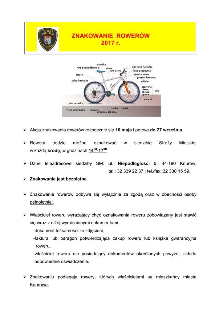 ZNAKOWANIE ROWERÓW 2017 r. Akcja znakowania rowerów rozpocznie się 10 maja i potrwa do 27 września. Rowery będzie moŜna oznakować w siedzibie StraŜy Miejskiej w kaŜdą środę, w godzinach 1400-1700 Dane teleadresowe siedziby SM: ul. Niepodległości 5; 44-190 Knurów; tel.: 32 339 22 37 ; tel./fax.:32 330 15 59. Znakowanie jest bezpłatne. Znakowanie rowerów odbywa się wyłącznie za zgodą oraz w obecności osoby pełnoletniej. Właściciel roweru wyraŜający chęć oznakowania roweru zobowiązany jest stawić się wraz z niŜej wymienionymi dokumentami : -dokument toŜsamości ze zdjęciem, -faktura lub paragon potwierdzająca zakup roweru lub ksiąŜka gwarancyjna roweru, -właściciel roweru nie posiadający dokumentów określonych powyŜej, składa odpowiednie oświadczenie. Znakowaniu podlegają rowery, których właścicielami są mieszkańcy miasta Knurowa.
