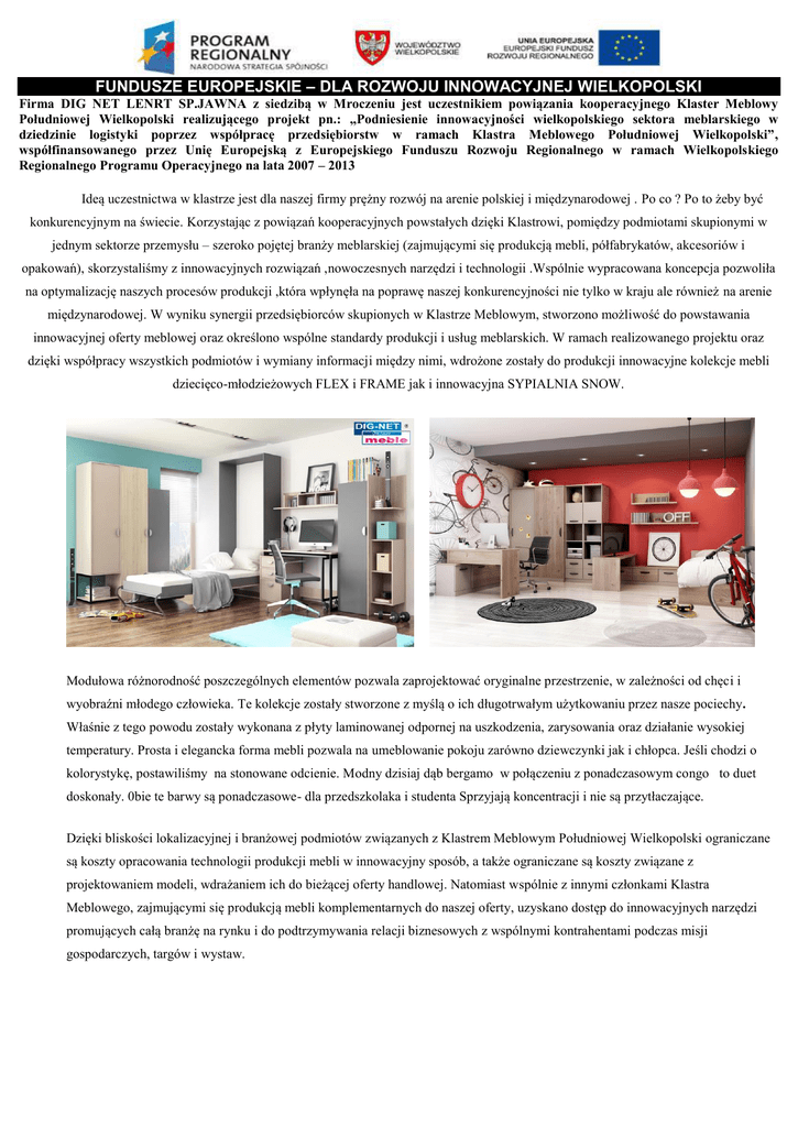 FUNDUSZE EUROPEJSKIE – DLA ROZWOJU INNOWACYJNEJ WIELKOPOLSKI Firma DIG NET LENRT SP.JAWNA z siedzibą w Mroczeniu jest uczestnikiem powiązania kooperacyjnego Klaster Meblowy Południowej Wielkopolski realizującego projekt pn.: „Podniesienie innowacyjności wielkopolskiego sektora meblarskiego w dziedzinie logistyki poprzez współpracę przedsiębiorstw w ramach Klastra Meblowego Południowej Wielkopolski”, współfinansowanego przez Unię Europejską z Europejskiego Funduszu Rozwoju Regionalnego w ramach Wielkopolskiego Regionalnego Programu Operacyjnego na lata 2007 – 2013 Ideą uczestnictwa w klastrze jest dla naszej firmy prężny rozwój na arenie polskiej i międzynarodowej . Po co ? Po to żeby być konkurencyjnym na świecie. Korzystając z powiązań kooperacyjnych powstałych dzięki Klastrowi, pomiędzy podmiotami skupionymi w jednym sektorze przemysłu – szeroko pojętej branży meblarskiej (zajmującymi się produkcją mebli, półfabrykatów, akcesoriów i opakowań), skorzystaliśmy z innowacyjnych rozwiązań ,nowoczesnych narzędzi i technologii .Wspólnie wypracowana koncepcja pozwoliła na optymalizację naszych procesów produkcji ,która wpłynęła na poprawę naszej konkurencyjności nie tylko w kraju ale również na arenie międzynarodowej. W wyniku synergii przedsiębiorców skupionych w Klastrze Meblowym, stworzono możliwość do powstawania innowacyjnej oferty meblowej oraz określono wspólne standardy produkcji i usług meblarskich. W ramach realizowanego projektu oraz dzięki współpracy wszystkich podmiotów i wymiany informacji między nimi, wdrożone zostały do produkcji innowacyjne kolekcje mebli dziecięco-młodzieżowych FLEX i FRAME jak i innowacyjna SYPIALNIA SNOW. Modułowa różnorodność poszczególnych elementów pozwala zaprojektować oryginalne przestrzenie, w zależności od chęci i wyobraźni młodego człowieka. Te kolekcje zostały stworzone z myślą o ich długotrwałym użytkowaniu przez nasze pociechy. Właśnie z tego powodu zostały wykonana z płyty laminowanej odpornej na uszkodzenia, zarysowania oraz działanie wysokiej temperatury. Prosta i elegancka forma mebli pozwala na umeblowanie pokoju zarówno dziewczynki jak i chłopca. Jeśli chodzi o kolorystykę, postawiliśmy na stonowane odcienie. Modny dzisiaj dąb bergamo w połączeniu z ponadczasowym congo to duet doskonały. 0bie te barwy są ponadczasowe- dla przedszkolaka i studenta Sprzyjają koncentracji i nie są przytłaczające. Dzięki bliskości lokalizacyjnej i branżowej podmiotów związanych z Klastrem Meblowym Południowej Wielkopolski ograniczane są koszty opracowania technologii produkcji mebli w innowacyjny sposób, a także ograniczane są koszty związane z projektowaniem modeli, wdrażaniem ich do bieżącej oferty handlowej. Natomiast wspólnie z innymi członkami Klastra Meblowego, zajmującymi się produkcją mebli komplementarnych do naszej oferty, uzyskano dostęp do innowacyjnych narzędzi promujących całą branżę na rynku i do podtrzymywania relacji biznesowych z wspólnymi kontrahentami podczas misji gospodarczych, targów i wystaw. Sypialnia to domowy azyl, miejsce ukojenia, harmonii, relaksu. Niezależnie od tego, jaki styl aranżacji wybierzemy - nowoczesny, romantyczny, orientalny, retro, czy zupełną awangardę - to jedno musi być pewne - powinna być jak z marzeń! Dla wszystkich, którzy lubią być trendy. Geometryczne kształty, prosta forma i... i nic więcej. Taki jest styl nowoczesny. Nie znajdziemy tu klasycznej lampki nocnej, nostalgicznej toaletki, rzeźbionych mebli, tradycyjnej firany w oknie. Duża przestrzeń, proste meble i gra nasyconych kolorów – tak wygląda nowoczesna sypialnia. Wydawałoby się, że skromnie, że nudno? Nic bardziej mylnego.