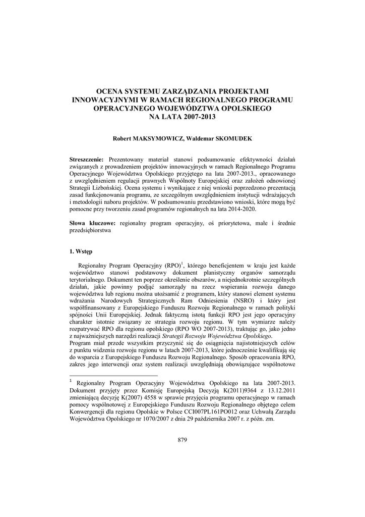 OCENA SYSTEMU ZARZĄDZANIA PROJEKTAMI INNOWACYJNYMI W RAMACH REGIONALNEGO PROGRAMU OPERACYJNEGO WOJEWÓDZTWA OPOLSKIEGO NA LATA 2007-2013 Robert MAKSYMOWICZ, Waldemar SKOMUDEK Streszczenie: Prezentowany materiał stanowi podsumowanie efektywności działań związanych z prowadzeniem projektów innowacyjnych w ramach Regionalnego Programu Operacyjnego Województwa Opolskiego przyjętego na lata 2007-2013., opracowanego z uwzględnieniem regulacji prawnych Wspólnoty Europejskiej oraz założeń odnowionej Strategii Lizbońskiej. Ocena systemu i wynikające z niej wnioski poprzedzono prezentacją zasad funkcjonowania programu, ze szczególnym uwzględnieniem instytucji wdrażających i metodologii naboru projektów. W podsumowaniu przedstawiono wnioski, które mogą być pomocne przy tworzeniu zasad programów regionalnych na lata 2014-2020. Słowa kluczowe: regionalny program operacyjny, oś priorytetowa, małe i średnie przedsiębiorstwa 1. Wstęp Regionalny Program Operacyjny (RPO)1, którego beneficjentem w kraju jest każde województwo stanowi podstawowy dokument planistyczny organów samorządu terytorialnego. Dokument ten poprzez określenie obszarów, a niejednokrotnie szczególnych działań, jakie powinny podjąć samorządy na rzecz wspierania rozwoju danego województwa lub regionu można utożsamić z programem, który stanowi element systemu wdrażania Narodowych Strategicznych Ram Odniesienia (NSRO) i który jest współfinansowany z Europejskiego Funduszu Rozwoju Regionalnego w ramach polityki spójności Unii Europejskiej. Jednak faktyczną istotą funkcji RPO jest jego operacyjny charakter istotnie związany ze strategia rozwoju regionu. W tym wymiarze należy rozpatrywać RPO dla regionu opolskiego (RPO WO 2007-2013), traktując go, jako jedno z najważniejszych narzędzi realizacji Strategii Rozwoju Województwa Opolskiego. Program miał przede wszystkim przyczynić się do osiągnięcia najistotniejszych celów z punktu widzenia rozwoju regionu w latach 2007-2013, które jednocześnie kwalifikują się do wsparcia z Europejskiego Funduszu Rozwoju Regionalnego. Sposób opracowania RPO, zakres jego interwencji oraz system realizacji uwzględniają obowiązujące wspólnotowe 1 Regionalny Program Operacyjny Województwa Opolskiego na lata 2007-2013. Dokument przyjęty przez Komisję Europejską Decyzją K(2011)9364 z 13.12.2011 zmieniającą decyzję K(2007) 4558 w sprawie przyjęcia programu operacyjnego w ramach pomocy wspólnotowej z Europejskiego Funduszu Rozwoju Regionalnego objętego celem Konwergencji dla regionu Opolskie w Polsce CCI007PL161PO012 oraz Uchwałą Zarządu Województwa Opolskiego nr 1070/2007 z dnia 29 października 2007 r. z późn. zm. 879 i krajowe ramy prawne, obowiązujące dokumenty programowe, jak również podstawowe zasady dotyczące m.in. komplementarności, spójności, earmarkingu funduszy2, koordynacji, zgodności, wieloletniego programowania, subsydiarności, proporcjonalności, podziału zarządzania, dodatkowości, koncentracji, oceny, społeczeństwa obywatelskiego, niedyskryminacji i równości szans mężczyzn i kobiet, partnerstwa oraz zrównoważonego rozwoju. W konstrukcji programu RPO WO 2007-2013 można wyodrębnić cele, wśród których najistotniejszymi są dążenie do uzyskania wzrostu konkurencyjności oraz zapewnienie spójności społecznej, gospodarczej i przestrzennej w celu podniesienia atrakcyjności regionu, jako potencjalnego miejsca do inwestowania, pracy i zamieszkania. Zgodnie z obowiązującymi zasadami programowania, realizacja celów programu oraz wdrażanie uzyskiwanych efektów musiały odbywać się głównie w zgodzie z przepisami unijnego tzw. Rozporządzenia „wykonawczego”3 oraz Ustawy o zasadach prowadzenia polityki rozwoju4. Na podstawie zebranych doświadczeń z zakresu implementacji programu w sferę działalności gospodarczej podjęto próbę oceny jego efektywności, ze szczególnym uwzględnieniem roli instytucji wdrażających i skuteczności przyjętej metodologii naboru projektów. Na podstawie uzyskanych wyników oceny zaproponowano wnioski, które mogą stanowić podstawę tworzenia nowych, bądź modyfikacji obecnych zasad programów regionalnych na kolejne lata, tj. na lata 2014-2020. 2. Ogólna charakterystyka osi priorytetowych projektu RPO WO 2007-2013 Na mocy art. 26 ust. 1 ww. ustawy Zarząd województwa opolskiego, jako instytucja zarządzająca projektem, został zobowiązany do przygotowania dokumentu uszczegóławiającego zapisy programu operacyjnego w postaci osi priorytetowych. Opis osi priorytetowych RPO WO na lata 2007-2013, ze względu na zawarte w nim informacje stanowi kompendium wiedzy dla wszystkich potencjalnych beneficjentów. Natomiast głównym celem uszczegółowienia zapisów programu było przybliżenie możliwości współfinansowania zadań w ramach projektu. Korzystając z wytycznych w zakresie szczegółowego opisu osi priorytetowych programu operacyjnego, wydanych w marcu 2007r. przez Ministra Rozwoju Regionalnego można określić kilka bardzo istotnych dla procesu zarządzania projektami innowacyjnymi obszarów uszczegółowienia. Należą do nich: zakres, zasady wdrażania i monitorowania oraz poziom finansowania działań i poddziałań, które będą realizowane w ramach osi priorytetowych RPO WO 2007-2013, 2 Earmarking funduszy to wyodrębnienie środków polityki spójności przyczyniających się do realizacji priorytetów z Lizbony (konsekwencja powiązania celów polityki spójności z priorytetami lizbońskimi). 3 Rozporządzenie Komisji (WE) nr 1828/2006 z dnia 8 grudnia 2006 r. ustanawiające szczegółowe zasady wykonania rozporządzenia Rady (WE) nr 1083/2006 oraz rozporządzenia (WE) nr 1080/2006 Parlamentu Europejskiego i Rady, Dz.U. L 371 z 27.12.2006; 4 Ustawa z dnia 6 grudnia 2006 r. o zasadach prowadzenia polityki rozwoju (Dz.U z 2009 r. Nr 84, poz 712 z późn. zm.) 880 system wyboru projektów opracowany m.in. na podstawie Wyt