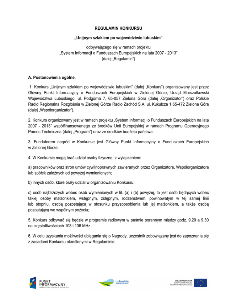 REGULAMIN KONKURSU „Unijnym szlakiem po województwie lubuskim” odbywającego się w ramach projektu „System Informacji o Funduszach Europejskich na lata 2007 - 2013” (dalej „Regulamin”) A. Postanowienia ogólne. 1. Konkurs „Unijnym szlakiem po województwie lubuskim” (dalej „Konkurs”) organizowany jest przez Główny Punkt Informacyjny o Funduszach Europejskich w Zielonej Górze, Urząd Marszałkowski Województwa Lubuskiego, ul. Podgórna 7, 65-057 Zielona Góra (dalej „Organizator”) oraz Polskie Radio Regionalna Rozgłośnia w Zielonej Górze Radio Zachód S.A. ul. Kukułcza 1 65-472 Zielona Góra (dalej „Współorganizator”). 2. Konkurs organizowany jest w ramach projektu „System Informacji o Funduszach Europejskich na lata 2007 - 2013” współfinansowanego ze środków Unii Europejskiej w ramach Programu Operacyjnego Pomoc Techniczna (dalej „Program”) oraz ze środków budżetu państwa. 3. Fundatorem nagród w Konkursie jest Główny Punkt Informacyjny o Funduszach Europejskich w Zielonej Górze. 4. W Konkursie mogą brać udział osoby fizyczne, z wyłączeniem: a) pracowników oraz stron umów cywilnoprawnych zawieranych przez Organizatora, Współorganizatora lub spółek zależnych od powyżej wymienionych; b) innych osób, które brały udział w organizowaniu Konkursu; c) osób najbliższych wobec osób wymienionych w lit. (a) i (b) powyżej, to jest osób będących wobec takiej osoby małżonkiem, wstępnym, zstępnym, rodzeństwem, powinowatym w tej samej linii lub stopniu, osobą pozostającą w stosunku przysposobienia lub jej małżonkiem, a także osobą pozostającą we wspólnym pożyciu; 5. Konkurs odbywać się będzie w programie radiowym w paśmie porannym między godz. 9.20 a 9.30 na częstotliwościach 103 i 106 MHz. 6. W celu uzyskania możliwości ubiegania się o Nagrody, uczestnik zobowiązany jest do zapoznania się z zasadami Konkursu określonymi w Regulaminie. B. Czas trwania Konkursu. Konkurs odbywać się będzie w dni robocze, w terminie od 16 sierpnia 2011 roku do 9 września 2011 roku (dalej „Czas trwania Konkursu”). C. Komisja Konkursowa. Celem zapewnienia prawidłowej organizacji i przebiegu Konkursu, a w szczególności w celu dokonania oceny prawidłowości zgłoszeń do Konkursu oraz dokonania wyboru zwycięzców Konkursu, Organizator powoła Komisję Konkursową. W skład Komisji Konkursowej wejdą osoby oddelegowane przez Organizatora oraz Współorganizatora. D. Nagrody. 1. W Konkursie przewidziane są następujące nagrody (dalej „Nagroda”): a) 4 (cztery) zestawy nagród, które będą do wygrania w dniach 16 – 19 sierpnia 2011 roku, w postaci karty prezentowej Empik na zakup przewodników turystycznych, materiałów informacyjnych o Unii Europejskiej i Funduszach Europejskich oraz kubka termicznego, każdy o wartości ok. 100,00 (słownie: sto) złotych. b) 5 (pięć) zestawów nagród, które będą do wygrania w dniach 22 – 26 sierpnia 2011 roku, w postaci śpiworów turystycznych, materiałów informacyjnych o Unii Europejskiej i Funduszach Europejskich oraz kubka termicznego, każdy o wartości ok. 100,00 (słownie: sto) złotych, c) 5 (pięć) nagród, które będą do wygrania w dniach 29 sierpnia – 2 września 2011 roku, w postaci plecaków, materiałów informacyjnych o Unii Europejskiej i Funduszach Europejskich oraz kubka termicznego, każdy o wartości ok. 100,00 (słownie: sto) złotych, d) 5 (pięć) zestawów nagród, które będą do wygrania w dniach 5 – 9 września 2011 roku, w postaci kijków do nordic wal king, materiałów informacyjnych o Unii Europejskiej i Funduszach Europejskich oraz kubka termicznego, każdy o wartości ok. 100 (słownie: sto) złotych Dodatkowo w okresie trwania konkursu Organizator przyzna jedną nagrodę niespodziankę ufundowaną przez Urząd Marszałkowski Województwa Lubuskiego. 2. Jakiekolwiek roszczenia uczestników dotyczące rodzaju, rozmiaru, ilości, jakości, standardu i innych właściwości Nagród są wyłączone. 3. Każdemu uczestnikowi Konkursu przysługuje jednorazowe prawo do wygrania Nagrody. 4. Uczestnikom Konkursu nie przysługują roszczenia o wypłatę pieniężnej równowartości Nagrody, o których mowa w pkt. D Regulaminu. 5. Jakiekolwiek roszczenia uczestników Konkursu z tytułu nieotrzymania Nagród, które nie zostały im przyznane, są wykluczone. E. Warunki uczestnictwa i przebieg Konkursu. 1. Konkurs polega na tym, że w każdym dniu trwania Konkursu, w godzinach od 9.20 do 9.30 prowadzący audycję podadzą na antenie Programu Radia Zachód, do czterech podpowiedzi prowadzących do prawidłowego wykonania zadania konkursowego, o którym mowa w pkt. E 2 Regulaminu. Podpowiedzi te będą zawierać informacje na temat projektów współfinansowanych z Funduszy Europejskich. 2. Zadaniem słuchaczy będzie zadzwonić na jeden z podanych przez prowadzącego numerów telefonów i odgadnąć, na podstawie podpowiedzi, o których mowa w pkt. E 1 Regulaminu, o jakim projekcie mowa (wystarczy powiedzieć np. basen w Zielonej Górze) 3. Każda próba telefonicznej odpowiedzi stanowi zgłoszenie do Konkursu, a osoba dzwoniąca staje się uczestnikiem Konkursu (dalej „Uczestnik”) i czyni to we własnym imieniu. 4. Zwycięzcą Konkursu w danym dniu zostaje Uczestnik, który jako pierwszy podał prawidłową odpowiedź (dalej „Zwycięzca”) oraz podał swoje dane teleadresowe. 5. Uczestnik konkursu tylko raz w tygodniu ( niezależnie od wyniku) może uczestniczyć w konkursie. 6. Uczestnik konkursu może tylko raz otrzymać nagrodę, czyli Zwycięzca nie może brać już udziału w konkursie. F. Wydanie Nagród 1. Odbiór nagrody, o której mowa w pkt. D 1 następuje osobiście w godzinach 8:00 – 16:00 w siedzibie jednego z czterech Punktów Sieci PIFE Województwa Lubuskiego, tj.: a) w Głównym Punkcie Informacyjnym o Funduszach Europejskich w Zielonej Górze, Urząd Marszałkowski Województwa Lubuskiego, ul. Pod