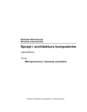Radosław Maciaszczyk Mirosław Łazoryszczak Sprzęt i architektura komputerów Laboratorium Temat: Mikroprocesory i elementy asemblera Katedra Architektury Komputerów i Telekomunikacji 1. M I KROPROCES ORY I EL E M EN TY A SEM BL ERA 1.1. ARCHITEKTURA MIKROPROCESORA 8086 Schemat blokowy mikroprocesora 8086 przedstawia rys. 1. Moduł współpracy z magistralą Jednostka wykonawcza magistrala wewnętrzna 1 2 3 4 5 6 magistrala systemowa kolejka instrukcji FR CS bufory sterowanie IP ALU AH AL BH BL CH CL DH DL DS SP ES BP SS sterowanie SI DI Rys. 1 Schemat blokowy mikroprocesora 8086 Procesor 8086 jest procesorem 16-bitowym. Posiada bowiem 16-bitowe rejestry oraz 16-bitową magistralę danych. Magistrala adresowa jest 20bitowa, co pozwala na uzyskanie 1MB przestrzeni adresowej. Budowa rejestru znaczników (FR – flag register) – SF – znacznik znaku – ZF – znacznik zera – PF – znacznik parzystości – AF – przeniesienie pomocnicze – CF – przeniesienie – OF – nadmiar – IF – interrupt – DF – znacznik kierunku – TF – znacznik pułapki Rejestry robocze: – AX [AH, AL]– akumulator – BX [BH, BL]– rejestr bazowy – CX [CH, CL]– rejestr zliczający – DX [DH, DL]– rejestr danych – – – – SP – wskaźnik stosu BP – wskaźnik bazy DI – rejestr adresu przeznaczenia SI – rejestr adresu operandu źródłowego Rejestry segmentowe: – CS – segment programu – DS – segment danych – SS – segment stosu – ES – segment dodatkowy Tryb adresowania – sposób wyznaczania adresu argumentu lub wyniku – natychmiastowe (MOV AX, 20 – w rejestrze AX zostanie zapisana liczba 20) – rejestrowe (MOV AX, BX – w rejestrze AX zostanie zapisana zawartość rejestru BX) – bezpośrednie (MOV AX, [40] – w rejestrze AX zostanie zapisana zawartość komórki pamięci o adresie 40) – pośrednie (MOV AX, [CX] – w rejestrze AX zostanie zapisana zawartość komórki pamięci o adresie, który znajduje się w rejestrze CX) – bazowe (MOV AX, [BP]) – indeksowe (MOV AX, [SI]) – bazowo indeksowe (MOV AX, [SI+BP]) Możemy wyróżnić następujące instrukcje procesora: – arytmetyczno – logiczne – przesłań – skoków, obsługi pętli – wywołań i powrotów z podprogramów – obsługi rejestrów segmentowych – operacje na ciągach słów – rozkazy we/wy 1.2. PRZYKŁADY PROGRAMOWA NIA MIKROPROCESORA 8086 Przykład 1 Napisać program obliczający wartość następującego wyrażenia: A*C + B*D, gdzie: A = 13 B = 43 C = -4 D = 19 Rozwiązanie Najpierw należy zamienić poszczególne wartości na liczby hexadecymalne. Liczby ujemne powinny być zapisane za pomocą kodu U2. Program nie ma charakteru ogólnego, ponieważ wielkość i ilość rejestrów została dopasowana do danych liczb. A = 0Dh B = 2Bh C = FCh D = 13h Kod programu 1: MOV 2: MOV 3: IMUL AL,0D AH,FC AH 4: MOV BX,AX 5: MOV 6: MOV 7: MUL AL,2B AH,13 AH 8: ADD AX,BX ;Umieszczamy liczbę A w rejestrze AL ;Do rejestru AH wpisujemy liczbę C ;Mnożymy (ze znakiem) zawartość rejestru AL przez ;liczbę z rejestru AH, wynik umieszczony będzie ;w rejestrze AX ;Przechowujemy wynik pierwszego mnożenia ;w rejestrze BX ;Wpisujemy liczbę B do rejestru AL ;W rejestrze AH umieszczamy liczbę D ;Mnożymy (bez znaku) zawartość rejestru AL przez ;liczbę z rejestru AH, wynik umieszczony będzie ;w rejestrze AX ;Do wyniku pierwszego mnożenia dodajemy wynik ;drugiego mnożenia. Wynik dodawania (i całego ;wyrażenia) znajdzie się w rejestrze AX Realizacja Uruchomić VirtualBOX oraz maszyne wirtualną DOS. Przejść do katalogu AFD (cd AFD). Uruchomić program AFD.EXE. Napisać w oknie poleceń: L NOP.BIN Napisać w oknie poleceń: A (przejście do trybu wpisywania komend) Przepisać podany kod (od adresu 103) Przeprowadzić symulację naciskając krokowe uruchomienie (klawisz F1). Podać wynik oraz jakie flagi zmieniły się w ostatnim kroku programu. Dlaczego ? Przykład 2 Napisać program obliczający sumę ośmiu kolejnych bajtów zapisanych w pamięci począwszy od adresu DS:SI czyli 0700h:0000h Rozwiązanie W programie należy zastosować instrukcję pętli (LOOP). Ma ona charakter skoku bezwarunkowego, przy czym z rozkazem tym związany jest rejestr CX pełniący funkcję licznika pętli, dekrementowanego automatycznie po każdym wykonaniu instrukcji LOOP. Suma 8 bajtów wykracza poza zakres rejestru połówkowego, wobec tego wynik musi być umieszczony w rejestrze 16-bitowym. Kod programu 1: 2: 3: 4: MOV XOR XOR XOR CX,08 AX,AX SI,SI BX,BX ;Ustawiamy licznik pętli na 8 ;Zerujemy rejestry AX, SI, BX (poniżej) 5: MOV BL,[SI] 6: ADD AX,BX 7: INC SI 8: LOOP 5 ;Wczytujemy do rejestru BL pierwszy bajt z pamięci ;(rejestr SI wskazuje na pierwszy bajt tablicy). ;Ponieważ sumowane składniki są bajtami, musimy ;zatem pobierać pojedyncze bajty z pamięci. Stąd ;użycie rejestru BL. Gdyby użyto rejestru 16;bitowego jako miejsca przeznaczenia, wówczas ;procesor odczytałby całe słowo (dwa bajty) zamiast ;bajtu ;Wykonanie dodawania. Rejestr BH pozostaje ;wyzerowany, więc do akumulatora zawierającego ;cząstkowe wyniki dodawana jest zawartość rejestru ;BL ;Zwiększenie zawartości rejestru SI o 1, tak aby w ;kolejnym przebiegu pętli możliwy był odczyt ;kolejnego bajtu pamięci ;Wykonanie skoku do linii 5(stała loop1), automatyczna ;dekrementacja rejestru CX i sprawdzenie, czy jego ;zawartość jest większa od 0 Realizacja Przepisać kod. Przejść do adresu wskazywanego przez rejestr DS:SI. Krokowo wykonać program i sprawdzić jak zmieniają się rejestry procesora. Wyliczyć ręcznie sumę i porównać z uzyskanym wynikiem. Przykład 3 Napisać program obliczający sumę dwóch wektorów 8 elementowych, zadeklarowanych w kodzie programu, współrzedne tych wektorów zostaną wyznaczone po asemblacji. Założyć, że wynik będzie 16 bitowy. Rozwiązanie Najpierw należy zadeklarować dwa wektory wejściowe oraz wektor wynikowy. Poczynając od adresu DS:00 wpisać 