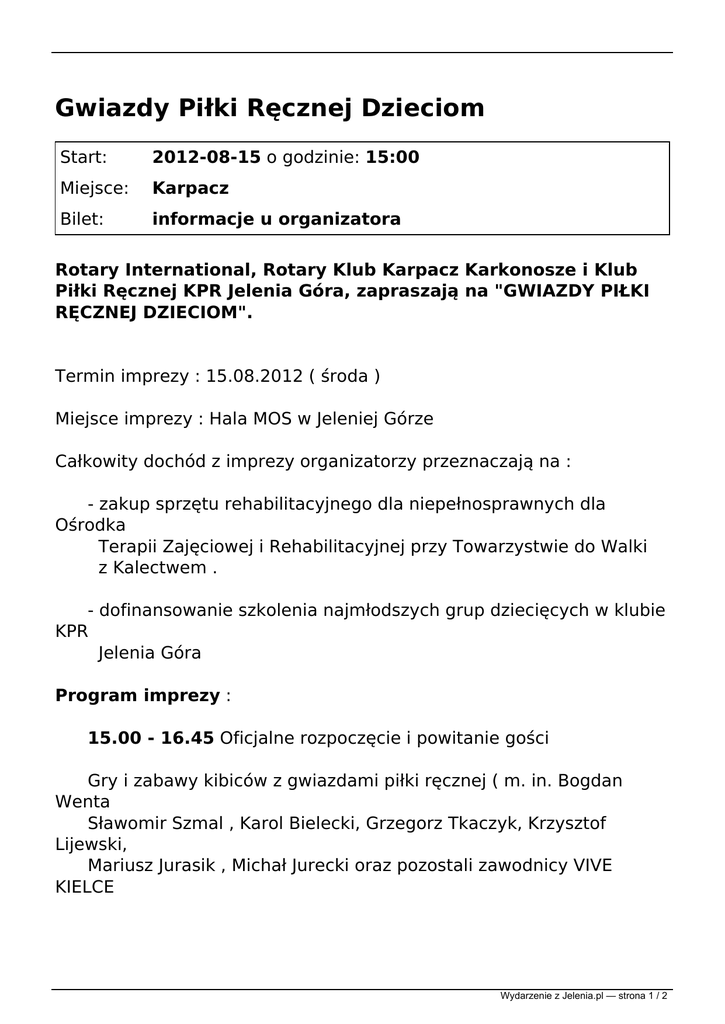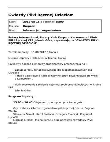 Gwiazdy Piłki Ręcznej Dzieciom Start: 2012-08-15 o godzinie: 15:00 Miejsce: Karpacz Bilet: informacje u organizatora Rotary International, Rotary Klub Karpacz Karkonosze i Klub Piłki Ręcznej KPR Jelenia Góra, zapraszają na "GWIAZDY PIŁKI RĘCZNEJ DZIECIOM". Termin imprezy : 15.08.2012 ( środa ) Miejsce imprezy : Hala MOS w Jeleniej Górze Całkowity dochód z imprezy organizatorzy przeznaczają na : - zakup sprzętu rehabilitacyjnego dla niepełnosprawnych dla Ośrodka Terapii Zajęciowej i Rehabilitacyjnej przy Towarzystwie do Walki z Kalectwem . - dofinansowanie szkolenia najmłodszych grup dziecięcych w klubie KPR Jelenia Góra Program imprezy : 15.00 - 16.45 Oficjalne rozpoczęcie i powitanie gości Gry i zabawy kibiców z gwiazdami piłki ręcznej ( m. in. Bogdan Wenta Sławomir Szmal , Karol Bielecki, Grzegorz Tkaczyk, Krzysztof Lijewski, Mariusz Jurasik , Michał Jurecki oraz pozostali zawodnicy VIVE KIELCE Wydarzenie z Jelenia.pl — strona 1 / 2 Licytacje pamiątek okolicznościowych ( m. in. oryginalna koszulka męskiej Reprezentacji Polski w piłce ręcznej z autografami , koszulki firmy Hummel oryginalne piłki meczowe firmy Selekt z autografami zawodników ) Prezentacja nowego zespołu Superligi PGNiG kobiet KPR Jelenia Góra na sezon 2012/2013 17.30 - 19.00 Mecz sparingowo - pokazowy męskiej piłki ręcznej między zespołami Vive Targi Kielce i MKS Zagłębie Lubin. Zespoły wystąpią w najmocniejszych składach. Link do oryginalnej publikacji: http://jelenia.pl/Gwiazdy_Pilki_Recznej_Dzieciom_501.html Wygenerowano: 07/03/2017 02:02:44 © Jelenia.pl Wydarzenie z Jelenia.pl — strona 2 / 2 Powered by TCPDF (www.tcpdf.org)