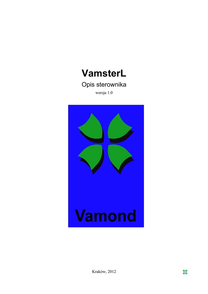 VamsterL Opis sterownika wersja 1.0 Kraków, 2012 1. Wstęp VamsterL jest jedną ze sprzętowych odmian Vamstera klasy N. Zaprojektowany został z myślą o zabudowie na szynie DIN. Wyposażony w dużą ilość wejść / wyjść oraz możliwość sterowania zewnętrznymi ekspanderami we/wy stanowi wygodne rozwiązanie dla bardziej zaawansowanych aplikacji. Terminologia: VamsterL© - sterownik na szynę DIN, jedna z odmian Vamstera klasy N VamgrafN©- aplikacja do graficznego tworzenia programów dla Vamsterów VamLoaderN© – dodatkowa aplikacja pozwalająca ładować do Vamstera wygenerowane przez VamgrafN i zapisane w wersji binarnej. Vamond© - producent VamsteraL, VamgrafaN i VamLoaderaN programy Wszelkie nazwy i symbole procesorów, programów, systemów i firm, nie będące własnością firmy Vamond, zostały użyte wyłącznie w celach identyfikacyjnych i informacyjnych. Bez pisemnej zgody firmy Vamond żadna część tego dokumentu nie może być publikowana, cytowana i kopiowana w celach komercyjnych. Właścicielem nazw: VamgrafN, Vamster, VamLoaderN oraz poniższego znaku graficznego jest firma Vamond. Dodatkowe informacje dostępne są na stronie firmy Vamond www.vamond.pl Tam również można pobrać dodatkową dokumentację i przykłady oraz nowe wersje VamgrafaN. Wszelkie uwagi prosimy zgłaszać za pośrednictwem e-mali na adres: [email protected] Vamond 31-617 Kraków os. Złotego Wieku 29/30 www.vamond.pl [email protected] Strona: 2 2. Opis VamsteraL VamsterL jest jedną z odmian sprzętowych Vamsterów klasy N (z komunikacją po RS-232). Zaprojektowano go z myślą o zabudowie na szynie DIN. Na etapie produkcji został wyposażony w bootloader i system obsługujący programy tworzone w VamgrafieN. Przeznaczeniem VamsteraL jest działanie jako samodzielny sterownik realizujący programu zaprojektowany przez użytkownika w VamgrafieN. Wyposażony w dużą ilość wejść / wyjść oraz możliwość sterowania zewnętrznymi ekspanderami we/wy stanowi wygodne rozwiązanie dla bardziej skomplikowanych aplikacji. Zasada działania VamsteraL jest identyczna jak pozostałych Vamsterów i została dokładnie opisana w dokumentacji Vamgrafa. 2.1. Podstawowe cechy VamsteraL • • • • • • • • • • • • duży, czytelny wyświetlacz LCD (4x20 znaków) z podświetlaniem obsługa zewnętrznej klawiatury 4-przyciskowej 8 wejść cyfrowych TTL (0-5V) 8 wyjść cyfrowych (mogą pracować jako wyjścia cyfrowe lub PWM) z buforem ULN 2 wejścia czujników temperatury DS18B20 obsługa odbiornika podczerwieni (36kHz – standard RC5, Sony, Hitachi) wbudowany sprzętowy zegar RTC z buforowanym zasilaniem obsługa buzzera (generowanie komunikatów dźwiękowych) obsługa RS232 (do programowania i komunikacji) przy tworzeniu programu na PC szeroki wybór gotowych elementów VamgrafaN do programowania nie wymaga osobnego programatora ładownie programów odbywa się za pośrednictwem łącza RS232. Można również stosować ogólnodostępne konwertery USB-RS232. Strona: 3 2.2. Bootloader i ładowanie programu VamsterL na etapie produkcji został wyposażony w bootloader, czyli specjalny program umożliwiający przesłanie plików (programów) do Vamstera bez korzystania z zewnętrznych programatorów. W trakcie ładowania programów (plików) do Vamstera zapewniona jest kontrola ewentualnych błędów transmisji (sumy CRC etc.). Narzędziem do tworzenia programów dla VamsteraL jest VamgrafN (również produkcji Vamond). Programy stworzone w Vamgrafie mają swój własny format i zawartość. Tworzą plik z rozszerzeniem ".vgr" Dodatkowo pliki programu mogą zostać zapisywane do plików o rozszerzeniu ".vmb" a takie pliki (programy) można transmitować do Vamstera przy pomocy VamLoaderaN. VamLoaderN jest niezależnym, dodatkowym narzędziem umożliwiającym wygodne przesłanie programów zapisanych w plikach ".vmb" bez konieczności instalacji środowiska VamgrafN. Uwaga! Ponieważ istnieje kilka typów Vamsterów, plik programu tworzonego w VamgrafieN jest przeznaczony tylko dla jednego z nich. W przypadku jeżeli program ładowany do Vamstera nie jest przeznaczony dla podłączonego typu Vamstera, aplikacje VamgrafN lub VamLoaderN zgłoszą komunikat: Program nie jest przeznaczony dla podłączonego Vamstera. Program nie może być załadowany. Ładowanie programu jest przerywane. Strona: 4 3. Zagadnienia programowe Działanie VamsteraL VamsterL nie odbiega w swoim działaniu od innych Vamsterów klasy N (z komunikacją po RS-232). Dokładnie zostało to opisane w dokumentacji VamgrafaN. 3.1. Start VamsteraL Po włączeniu zasilania (lub resecie) wszystkie piny wejść Vamstera znajdują się w stanie wysokiej impedancji, wyjścia ustawiane są w stan nieaktywny. VamsterL uruchamia bootloadera, który próbuje porozumieć się z programem ładującym. Jeżeli program ładujący nie jest aktywny VamsterL uruchomia program użytkownika (jeżeli nie załadowano takiego programu lub program nie został załadowany poprawnie, wykonywany jest reset i cały cykl rozpoczyna się od nowa) Następnie Vamster wykonuje kolejno (po zakończeniu działania bootloadera): • odczytuje konfigurację programu (używane wejścia, wyjścia itp.) • wyjścia ustawiane są w stan nieaktywny (dla wyjść cyfrowych niski (L) stan logiczny, dla PWM wypełnienie = 0, dla wyjść RS: liczbowe = 0, binarne = L). • zeruje swoje wewnętrzne zmienne w tym datę i czas systemową • odczytuje wyliczone wcześniej w VamgrafieN początkowe wartości wszystkich zmiennych programu • generuje zdarzenie "Start systemu" o wysokiej (H) wartości logicznej (o ile jest używane w programie) a następnie je przetwarza • uruchamia timery, zegary, generatory oraz wyświetlacz • jeżeli używany jest moduł sprzętowego zegara RTC generuje zdarzenia (o ile są używane w programie) dla daty i czasu systemowego o wartościach odczytanych z modułu RTC a następnie przetwarza te zdarzenia. • ustawiane s