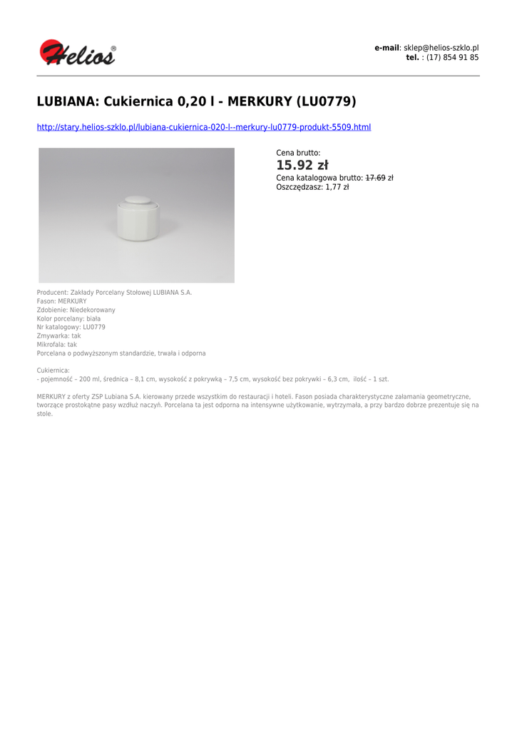 e-mail: [email protected] tel. : (17) 854 91 85 LUBIANA: Cukiernica 0,20 l - MERKURY (LU0779) http://stary.helios-szklo.pl/lubiana-cukiernica-020-l--merkury-lu0779-produkt-5509.html Cena brutto: 15.92 zł Cena katalogowa brutto: 17.69 zł Oszczędzasz: 1,77 zł Producent: Zakłady Porcelany Stołowej LUBIANA S.A. Fason: MERKURY Zdobienie: Niedekorowany Kolor porcelany: biała Nr katalogowy: LU0779 Zmywarka: tak Mikrofala: tak Porcelana o podwyższonym standardzie, trwała i odporna Cukiernica: - pojemność – 200 ml, średnica – 8,1 cm, wysokość z pokrywką – 7,5 cm, wysokość bez pokrywki – 6,3 cm, ilość – 1 szt. MERKURY z oferty ZSP Lubiana S.A. kierowany przede wszystkim do restauracji i hoteli. Fason posiada charakterystyczne załamania geometryczne, tworzące prostokątne pasy wzdłuż naczyń. Porcelana ta jest odporna na intensywne użytkowanie, wytrzymała, a przy bardzo dobrze prezentuje się na stole.