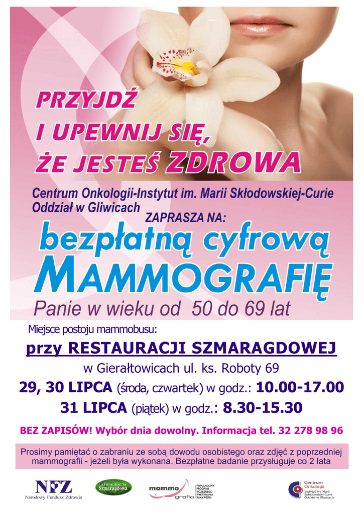 Miejsce postoju mammobusu: Miejsce postoju mammobusu: przy RESTAURACJI SZMARAGDOWEJ w Gierałtowicach ul. ks. Roboty 69 29, 30 LIPCA (środa, czwartek) w godz.: 10.00-17.00 31 LIPCA (piątek) w godz.: 8.30-15.30 BEZ ZAPISÓW! Wybór dnia dowolny. Informacja tel. 32 278 98 96