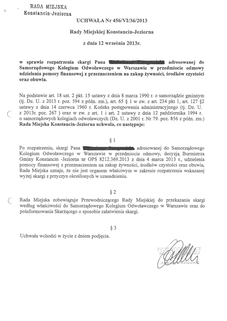 TADA MIEJSKA Ronstano in-Jeziorna UCHWAŁA Nr 456/VI/36/2013 Rady Miejskiej Konstancin-Jeziorna z dnia 12 września 2013r. w sprawie rozpatrzenia skargi Pana adresowanej do Samorządowego Kolegium Odwoławczego w Warszawie w przedmiocie odmowy udzielenia pomocy finansowej z przeznaczeniem na zakup żywności, środków czystości oraz obuwia. Na podstawie art. 18 ust. 2 pkt. 15 ustawy z dnia 8 marca 1990 r. o samorządzie gminnym (tj. Dz. U. z 2013 r. poz. 594 z późn. zm.), art. 65 1 W Zw. Z art. 234 pkt 1, art. 127 2 ustawy z chiia 14 czerwca 1960 r. Kodeks postępowania administracyjnego (tj. Dz. U. z 2013r. poz. 267 ) oraz w zw. z art. 1 i art. 2 ustawy z dnia 12 października 1994 r. o samorządowych kolegiach odwoławczych (Dz. U. z 2001 r. Nr 79. poz. 856 z późn. zm.) Rada Miejska Konstancin-Jeziorna uchwala, co następuje: Po rozpatrzeniu, skargi Pana adresowanej do Samorządowego Kolegium Odwoławczego w Warszawie w przedmiocie odmowy, decyzją Burmistrza Gminy Konstanciri -Jeziorna nr OPS 8212.369.2013 z dnia 4 marca 2013 r., udzielenia pomocy finansowej z przeznaczeniem na zakup żywności, środków czystości oraz obuwia, Rada Miejska uznaje, że nie jest organem właściwym w zakresie rozpatrzenia wskazanej wyżej skargi z przyczyn określonych w uzasadnieniu. -. -. - Rada Miejska zobowiązuje Przewodniczącego Rady Miejskiej do przekazania skargi według właściwości do Samorządowego Kolegium Odwoławczego w Warszawie oraz do poinformowania Skarżącego o sposobie załatwienia skargi. Uchwała wchodzi w życie z dniem podjęcia. UZASADNIENIE do uchwały Nr 456/V1136/2013 Rady Miejskiej Konstancin-Jeziorna z dnia 12 września 2013r. Pismem z dnia 10 maja 2013 r. (znak: K0A11606/Op/13) Samorządowe Kolegium Odwoławcze w Warszawie, działając na podstawie art. 231 Kodeksu postępowania administracyjnego, przekazało na rzecz Rady Miejskiej w Konstancinie-Jeziornie pismo Pana adresowane do Samorządowego Kolegium Odwoławczego w Warszawie i doręczone do Kolegium w dniu 9 kwietnia 2013 r., zatytułowane „skarga”. —- W toku badania skargi Rada Miejska Konstancin-Jeziorna ustaliła, iż: Wnioskiem z dnia 7 stycznia 2013 r. Pan wystąpił do Ośrodka Pomocy L Społecznej w Konstancinie-Jeziornie o udzielenie pomocy finansowej z przeznaczeniem na zakup żywności, środków czystości oraz obuwia. W rezultacie, przeprowadzonego przez organ pierwszej instancji postępowania administracyjnego, wydana została decyzja OPS 8212.369.2013 Burmistrza Gminy Konstancin-Jeziorna z dnia 4 marca 2013 r. w przedmiocie odmowy udzielenia pomocy, o którą wnioskował Pan Jh hi Organ pierwszej instancji wskazał w pouczeniu do decyzji, iż Stronie niezadowolonej z treści decyzji przysługuje prawo odwołania do Samorządowego Kolegium Odwoławczego w Warszawie, w terminie 14 dni od dnia doręczenia decyzji. Pismem, zatytułowanym „Skarga” a doręczonym Samorządowemu Kolegium Odwoławczemu w Warszawie w dniu 9 kwietnia 2013 r., 1 odwołał się do Samorządowego Kolegium Odwoławczego w Warszawie od ww decyzji OPS 8212.369.2013 z dnia 4 marca 2013 r. W następstwie złożonego odwołania Samorządowe Kolegium Odwoławcze w Warszawie wezwało, pismem z dnia 15 kwietnia 2013 r. (znak sprawy: K0K1946/Op/13), Ośrodek Pomocy Społecznej w Konstancinie-Jeziornie do niezwłocznego przesłania akt sprawy wraz z oryginałem odwołania -- ( Pismem z dnia 22 kwietnia 2013 r. Ośrodek Pomocy Społecznej w Konstancinie-Jeziomie wykonał wezwanie i przesłał akta sprawy do Samorządowego Kolegium Odwoławczego w Warszawie. W odpowiedzi, pismem z dnia 10 maja 201 3r., Samorządowe Kolegium Odwoławcze w Warszawie, przekazało skargę Pana t_ do Rady Miejskiej w Konstancinie-Jeziomie celem jej rozpoznania przez Radę. Z uzasadnienia ww pisma Samorządowego Kolegium Odwoławczego wynika, iż zakwalifikowało ono skargę jjako skargą na kierownika jednostki organizacyjnej z pominięciem okoliczności, że sprawa Lest rozpatrywana w trybie postępowania administracyjnego. Rada Miejska Konstancin-Jeziorna podczas obrad XXXV sesji w dniu 27 czerwca 2013r. zapoznała się z przekazanymi przez Samorządowe Kolegium Odwoławcze w Warszawie dokumentami tj. aktami sprawy i podjęła wniosek o przekazaniu sprawy radcy prawnemu Urzędu Miasta i Gminy Konstancin-Jeziorna w celu wydania opinii, o czym zostało powiadomione Samorządowe Kolegium Odwoławcze w Warszawie pismem z dnia 1 lipca 2013r. BRM.0004.123.2013. - ( W celu wyjaśnienia wezwano, pismem z dnia 26 lipca 2013 r. (znak:BRM.0004.142.2013), -J j do wskazania czy jego skarga stanowi odwołanie od decyzji czy też jest skargą złożona w trybie art. 227 Kodeksu postępowania administracyjnego. Pismo P odebrał w dniu 31 lipca 2013 r. i do dnia dzisiejszego nie przedstawił swojego stanowiska w tym zakresie. Po zapoznaniu się z całością dokumentacji w sprawie, Rada Miejska Konstancin-Jezioma, stwierdza, iż nie jest organem właściwym do rozpatrzenia i załatwienia sprawy skargi JL l_L.ważywszy, iż: Zgodnie z art. 104 1 Kodeksu postępowania administracyjnego organy administracji publicznej co do zasady załatwiają sprawę przez wydanie decyzji. Przy czym, w myśl art. 19 Kodeksu postępowania administracyjnego, organy z urzędu przestrzegają swojej właściwości rzeczowej i miejscowej. Sprawa udzielenia bądź odmowy udzielenia pomocy nansowej z przeznaczeniem na zakup żywności, środków czystości oraz obuwia wymaga wydania stosownej decji administracyjnej,p uprzednim przeprowadzeniu po stepowania administracyjnego przez organ pierwszej instancji. W rozpoznawanej sprawie takie postępowanie zostało przeprowadzone przez Ośrodek Pomocy Społecznej w Konstancinie-Jeziornie i w konsekwencji wydano decyzję OPS 82 12.369.2013 z dnia 4 marca 2013 r. Na chwilę obecną postępowanie administracyjne jest w toku, zakończony został OL jego pierwszy etap, tj. wydano decyzję przez Organ pierwszej instancji, zaś L--IL stosownie do pouc