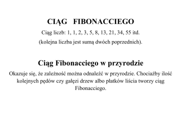 CIĄG FIBONACCIEGO Ciąg liczb: 1, 1, 2, 3, 5, 8, 13, 21, 34, 55 itd. (kolejna liczba jest sumą dwóch poprzednich). Ciąg Fibonacciego w przyrodzie Okazuje się, że zależność można odnaleźć w przyrodzie. Chociażby ilość kolejnych pędów czy gałęzi drzew albo płatków liścia tworzy ciąg Fibonacciego. Reprezentanci reguły Fibonacciego. Dzieląc dowolną liczbę ciągu Fibonacciego przez liczbę ją poprzedzającą otrzymamy 1,61804 - złota proporcja lub boska proporcja - φ. LICZBY FIBONACCIEGO A LUDZKIE CIAŁO Odległość od biodra do podłogi /odległość od kolana do podłogi = φ Odległość od czubka głowy do podłogi /odległość od pępka do podłogi = φ Odległość od czubka głowy do pępka /odległość od ramienia do pępka = φ Odległość między ramieniem a czubkiem palców /odległość między łokciem a czubkiem palców= φ Odległość od łokcia do nadgarstka /odległość od nadgarstka do czubka palców= φ Odległość od ramienia do łokcia /odległość od pachy do łokcia = liczba φ Najbardziej efektownym przejawem istnienia złotej proporcji w świecie zwierząt są muszle, których kształt układa się zgodnie z przebiegiem tzw. Spirali Fibonacciego. Przyglądając się tej spirali i muszli ślimaka, od razu zauważamy wyraźne podobieństwo.