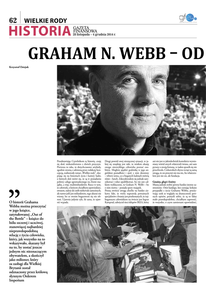 62 WIELKIE RODY HISTORIA 28 listopada – 4 grudnia 2014 r. GRAHAM N. WEBB – OD Krzysztof Osiejuk O historii Grahama Webba można przeczytać w jego książce, zatytułowanej „Out of the Bottle” – książce do bólu szczerej i uczciwej, stanowiącej najbardziej nieprawdopodobną relację z życia człowieka, który, jak wszystko na to wskazywało, skazany był na to, by zostać jeszcze jednym nic nieznaczącym obywatelem, a skończył jako milioner, który za zasługi dla Wielkiej Brytanii został odznaczony przez królową słynnym Orderem Imperium Przedstawiając Czytelnikom tę historię, czuję się dość niekomfortowo z dwóch przyczyn. Pierwsza to taka, że dotychczasowe artykuły, zgodnie zresztą z założoną przez redakcję koncepcją, realizowały temat „Wielkie rody”, skupiając się na historiach życia i kariery ludzi, o których dziś mówi się, że są w posiadaniu połowy całego zgromadzonego na Ziemi majątku, a więc multimiliarderów. Rzecz w tym, że człowiek, o którym chciałbym opowiedzieć, owszem, należy do osób niebywale zamożnych, ale nawet jeśli jest miliarderem, tego akurat nie wiemy, bo ze swoim bogactwem się nie obnosi. Ujawnia jedynie tyle, ile uzna, że ujawnić wypada. Drugi powód owej niezręcznej sytuacji, w jakiej się znajduję jest taki, że miałem okazję owego niezwykłego człowieka poznać osobiście. Mogłem spędzić godzinkę w jego angielskiej posiadłości i zjeść z nim skromny – wbrew temu, co o bogatych ludziach mówią różni – lunch. Zdecydowałem się jednak zaryzykować i tekst opublikować, bo nie jest całkiem wykluczone, że Graham N. Webb – bo o nim mowa – posiada spory majątek. Proszę zwrócić uwagę choćby na bardzo ciekawy fakt, że wielu naprawdę poważnych specjalistów z branży jest przekonanych, że najbogatszym człowiekiem na świecie jest Ingvar Kamprad, założyciel sieci sklepów IKEA, który ani nie jest w jakimkolwiek kontekście wymieniany wśród owych właścicieli świata, ani sam pytany o swoją fortunę, w żaden sposób się nie przechwala. Ciekawskich zbywa wciąż tą samą uwagą, że on przecież nie ma nic, bo właścicielem jest nie on, ale fundacja. Gnuśny, głupi i leniwy Muszę jednak zrobić pewne bardzo istotne zastrzeżenie. Otóż każdego, kto czytając kolejne przypadki z życia Grahama Webba, przeżywając szok ze względu na drastyczność pewnych opisów, pomyśli sobie, że są to fakty mało prawdopodobne, chciałbym zapewnić, że wszystko, o czym zamierzam opowiedzieć, WIELKIE RODY 63 28 listopada – 4 grudnia 2014 r. HISTORIA FRYZJERA DO MILIONERA słyszałem osobiście z ust samego Webba. Wiele z tych historii można przeczytać w jego książce, zatytułowanej „Out of the Bottle” – książce do bólu szczerej i uczciwej, stanowiącej najbardziej nieprawdopodobną relację z życia człowieka, który, jak wszystko na to wskazywało, skazany był na to, by zostać jeszcze jednym nic nieznaczącym obywatelem, a skończył jako milioner, który za zasługi dla Wielkiej Brytanii został odznaczony przez królową słynnym Orderem Imperium. Wprowadzenie do książki Webba jest czymś na kształt motta. Otóż zanim zanurzymy się w tych niezwykłych opowieściach, znajdujemy dwa porażające cytaty. Oba pochodzą z doku- Graham Webb i Franki Valli mentów wydanych przez jedną i tę samą instytucję, mianowicie szkołę, do której Webb uczęszczał jako dziecko, i z której został wyrzucony za lenistwo i głupotę. Oto pierwszy z nich, wystawiony w roku 1961, stwierdzający: „Nie wykazuje najmniejszego zaangażowania. Jest gnuśny, głupi, przeraźliwie leniwy, w dodatku najwyraźniej bardzo zadowolony z tego co sobą reprezentuje i zdecydowany w tym stanie pozostać”. Druga, wydana przy okazji wręczania mu dyplomu honorowego w roku 2000, przez tę samą szkolę, głosi: Sir George Martin z Grahamem Webbem 64 WIELKIE RODY HISTORIA 28 listopada – 4 grudnia 2014 r. Mijały lata, a Webb zgodnie z zasadą, którą swego czasu tak pięknie sformułował: „Jeśli planujesz podpalić świat, musisz mieć pewność, że masz w sobie wystarczająco dużo ognia”, rozwijał swój biznes „Grahamowi N. Webbowi, za wybitne osiągnięcia życiowe, w uznaniu dla jego służby na rzecz brytyjskiego rynku, handlu i edukacji”. To oczywiście już samo w sobie wystarczy, by zadumać się nad niejednym losem i niejedną karierą, czy to spełnioną czy złamaną. A oto losy jednego z tych, którzy w mniejszym lub większym stopniu rządzą tym światem. Pomocnik fryzjera Graham N. Webb urodził się w 1947 r. w Londynie, w zwykłej średnio zamożnej rodzinie, z niezdiagnozowanym rozszczepem kręgosłupa, który sprawiał, że przez większość życia cierpiał na nietrzymanie moczu. Czy to nieszczęście wpłynęło na jego życie nie wiemy, ale możemy się domyślać, że musiało mieć znaczący wpływ. Tym co wiemy na pewno jest fakt, że w życiu pozaszkolnym Webb był dzieckiem i zaradnym, i pracowitym, i przede wszystkim grzecznym – od wczesnych lat potrafił zarabiać na swoje potrzeby, imając się WIELKIE RODY 65 28 listopada – 4 grudnia 2014 r. HISTORIA Kiedy kosmetyki GW opanowały Wielką Brytanię, Webb postanowił podbić Stany Zjednoczone i założył potężną organizację pod nazwą Graham Webb International. przeróżnych, odpowiednich dla londyńskiego dziecka zajęć. W wieku 15 lat, a więc najniższym, kiedy brytyjskie dziecko przestaje już być objęte obowiązkiem edukacyjnym, został wyrzucony ze szkoły z opinią nie do pozazdroszczenia. Po pierwsze przede wszystkim nie wypadało, a po drugie jemu samemu zależało na tym, by nie pozostawać na utrzymaniu rodziców Webb zaczął składać kolejne podania. Jak dziś wspomina, w sumie owych aplikacji było 62 – wszystkie zostały odrzucone bez dyskusji. Wreszcie jego mama znalazła w prasie odpowiednie ogłoszenie i uznała, że najlepiej dla niego będzie obj
