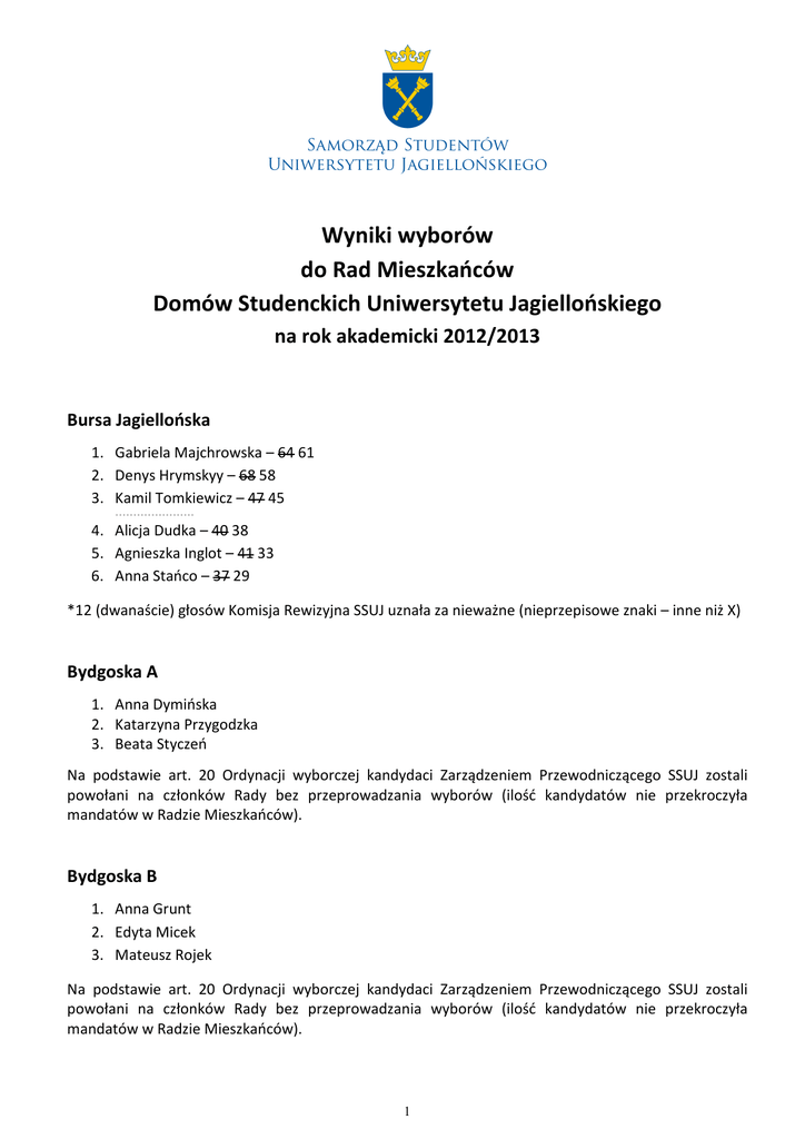 Wyniki wyborów do Rad Mieszkańców Domów Studenckich Uniwersytetu Jagiellońskiego na rok akademicki 2012/2013 Bursa Jagiellońska 1. Gabriela Majchrowska – 64 61 2. Denys Hrymskyy – 68 58 3. Kamil Tomkiewicz – 47 45 ---------------------- 4. Alicja Dudka – 40 38 5. Agnieszka Inglot – 41 33 6. Anna Stańco – 37 29 *12 (dwanaście) głosów Komisja Rewizyjna SSUJ uznała za nieważne (nieprzepisowe znaki – inne niż X) Bydgoska A 1. Anna Dymińska 2. Katarzyna Przygodzka 3. Beata Styczeń Na podstawie art. 20 Ordynacji wyborczej kandydaci Zarządzeniem Przewodniczącego SSUJ zostali powołani na członków Rady bez przeprowadzania wyborów (ilość kandydatów nie przekroczyła mandatów w Radzie Mieszkańców). Bydgoska B 1. Anna Grunt 2. Edyta Micek 3. Mateusz Rojek Na podstawie art. 20 Ordynacji wyborczej kandydaci Zarządzeniem Przewodniczącego SSUJ zostali powołani na członków Rady bez przeprowadzania wyborów (ilość kandydatów nie przekroczyła mandatów w Radzie Mieszkańców). 1 Bydgoska C 1. Grzegorz Rozpędzki – 69 2. Weronika Pniok – 45 3. Bartosz Bulanda – 40 ---------------------- 4. 5. 6. 7. Władysław Babkiewicz – 35 Piotr Wojciech Dynak – 27 Karol Ślusarski – 16 Paweł Nastula – 12 Kamionka 1. Arkadiusz Fal 2. Szymon Jellonek Na podstawie art. 20 Ordynacji wyborczej kandydaci Zarządzeniem Przewodniczącego SSUJ zostali powołani na członków Rady bez przeprowadzania wyborów (ilość kandydatów nie przekroczyła mandatów w Radzie Mieszkańców). Piast 1. 2. 3. 4. 5. 6. 7. Dawid Bambynek – 154 Renis Hodo – 136 Michał Dymiński – 130 Magdalena Dembiczak – 119 Justyna Zujević – 113 Krzysztof Kotlarek – 102 Konrad Czarnecki – 87 ---------------------- 8. Witold Gurak – 61 9. Katarzyna Turalska – 44 10. Agnieszka Gurbiel – 32 Prokocim CMUJ A 1. Paweł Jasnos – 127 2. Michał Łapuć – 104 3. Mateusz – Kwit – 102 ---------------------- 4. Wojciech Jasnos – 96 2 Prokocim CMUJ B 1. Jędrzej Jastrzębski – 105 2. Monika Moś – 100 3. Krzysztof Drąg – 64 ---------------------- 4. Kacper Błaszczyk - 54 Prokocim CMUJ C 1. Tadeusz Bogacki – 126 2. Karolina Słapek – 86 3. Jakub Pieniążek – 80 ---------------------- 4. Jakub Foder - 76 Żaczek 1. 2. 3. 4. 5. 6. 7. Adrian Mosurek – 137 Paweł Chruściel – 134 Mateusz Zawada – 132 Justyna Kulas – 113 Mariusz Krasucki – 107 Wojciech Chochołowicz – 106 Piotr Sypek – 95 ---------------------- 8. Paula Dybowska – 50 ----------------------------------------------------------------------------------------------------------------------- Bydgoska D Wniesiony został protest wyborczy. Po zapoznaniu się z nim, a także po przeanalizowaniu dokumentacji dostarczonej przez Komisję Wyborczą, Komisja Rewizyjna SSUJ stwierdza szereg istotnych uchybień i uznaje wybory w Domu Studenckim Bydgoska D za nieważne. 3 Nawojka 1. 2. 3. 4. 5. Kamil Kozieł – 148 Cyprian Chmielewski – 126 Anna Jaković – 124 Żaneta Orska – 105 Marta Orzechowska – 63 ---------------------- 6. Justyna Sojka – 50 7. Karolina Hanusek – 40 8. Paweł Kaźmierski – 38 9. Tomasz Guzik – 35 10. Sebastian Jaszcz – 24 11. Mario – 1 *Wniesiono protest wyborczy. Nie został on uznany. Nie można stwierdzić ważności wyborów w Domu Studenckim Nawojka do momentu bezskutecznego upływu terminu do wniesienia odwołania do Prorektora UJ ds. dydaktyki lub do czasu rozstrzygnięcia przez niego o ważności wyborów 4