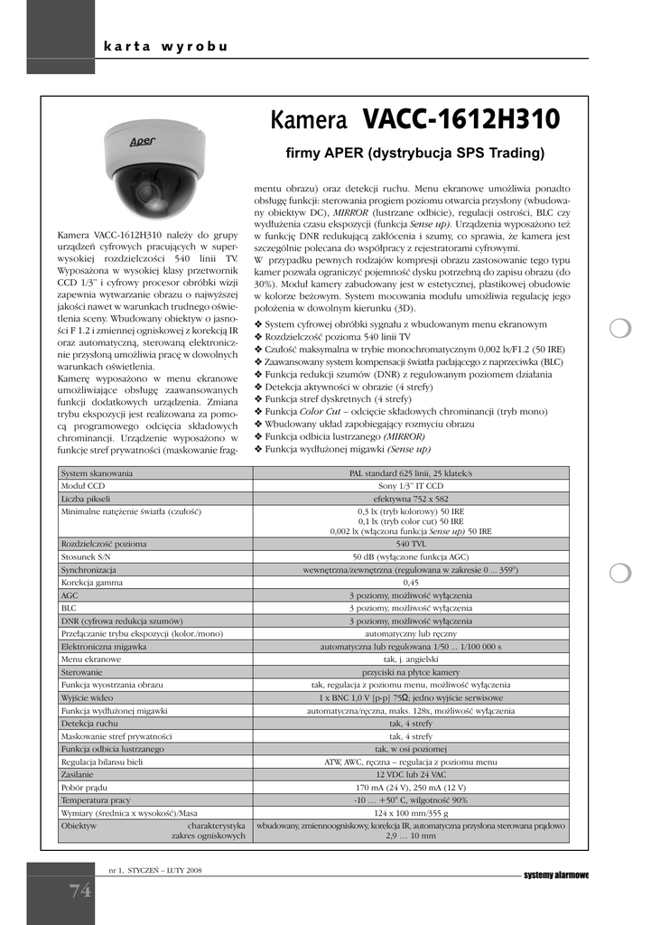 karta wyrobu Kamera VACC-1612H310 firmy APER (dystrybucja SPS Trading) Kamera VACC-1612H310 należy do grupy urządzeń cyfrowych pracujących w superwysokiej rozdzielczości 540 linii TV. Wyposażona w wysokiej klasy przetwornik CCD 1/3” i cyfrowy procesor obróbki wizji zapewnia wytwarzanie obrazu o najwyższej jakości nawet w warunkach trudnego oświetlenia sceny. Wbudowany obiektyw o jasności F 1.2 i zmiennej ogniskowej z korekcją IR oraz automatyczną, sterowaną elektronicznie przysłoną umożliwia pracę w dowolnych warunkach oświetlenia. Kamerę wyposażono w menu ekranowe umożliwiające obsługę zaawansowanych funkcji dodatkowych urządzenia. Zmiana trybu ekspozycji jest realizowana za pomocą programowego odcięcia składowych chrominancji. Urządzenie wyposażono w funkcje stref prywatności (maskowanie fragSystem skanowania Moduł CCD Liczba pikseli Minimalne natężenie światła (czułość) Rozdzielczość pozioma Stosunek S/N Synchronizacja Korekcja gamma AGC BLC DNR (cyfrowa redukcja szumów) Przełączanie trybu ekspozycji (kolor./mono) Elektroniczna migawka Menu ekranowe Sterowanie Funkcja wyostrzania obrazu Wyjście wideo Funkcja wydłużonej migawki Detekcja ruchu Maskowanie stref prywatności Funkcja odbicia lustrzanego Regulacja bilansu bieli Zasilanie Pobór prądu Temperatura pracy Wymiary (średnica x wysokość)/Masa Obiektyw charakterystyka zakres ogniskowych nr 1, STYCZEŃ – LUTY 2008 74 mentu obrazu) oraz detekcji ruchu. Menu ekranowe umożliwia ponadto obsługę funkcji: sterowania progiem poziomu otwarcia przysłony (wbudowany obiektyw DC), MIRROR (lustrzane odbicie), regulacji ostrości, BLC czy wydłużenia czasu ekspozycji (funkcja Sense up). Urządzenia wyposażono też w funkcję DNR redukującą zakłócenia i szumy, co sprawia, że kamera jest szczególnie polecana do współpracy z rejestratorami cyfrowymi. W przypadku pewnych rodzajów kompresji obrazu zastosowanie tego typu kamer pozwala ograniczyć pojemność dysku potrzebną do zapisu obrazu (do 30%). Moduł kamery zabudowany jest w estetycznej, plastikowej obudowie w kolorze beżowym. System mocowania modułu umożliwia regulację jego położenia w dowolnym kierunku (3D). v System cyfrowej obróbki sygnału z wbudowanym menu ekranowym v Rozdzielczość pozioma 540 linii TV v Czułość maksymalna w trybie monochromatycznym 0,002 lx/F1.2 (50 IRE) v Zaawansowany system kompensacji światła padającego z naprzeciwka (BLC) v Funkcja redukcji szumów (DNR) z regulowanym poziomem działania v Detekcja aktywności w obrazie (4 strefy) v Funkcja stref dyskretnych (4 strefy) v Funkcja Color Cut – odcięcie składowych chrominancji (tryb mono) v Wbudowany układ zapobiegający rozmyciu obrazu v Funkcja odbicia lustrzanego (MIRROR) v Funkcja wydłużonej migawki (Sense up) PAL standard 625 linii, 25 klatek/s Sony 1/3” IT CCD efektywna 752 x 582 0,3 lx (tryb kolorowy) 50 IRE 0,1 lx (tryb color cut) 50 IRE 0,002 lx (włączona funkcja Sense up) 50 IRE 540 TVL 50 dB (wyłączone funkcja AGC) wewnętrzna/zewnętrzna (regulowana w zakresie 0 ... 359°) 0,45 3 poziomy, możliwość wyłączenia 3 poziomy, możliwość wyłączenia 3 poziomy, możliwość wyłączenia automatyczny lub ręczny automatyczna lub regulowana 1/50 ... 1/100 000 s tak, j. angielski przyciski na płytce kamery tak, regulacja z poziomu menu, możliwość wyłączenia 1 x BNC 1,0 V [p-p] 75Ω; jedno wyjście serwisowe automatyczna/ręczna, maks. 128x, możliwość wyłączenia tak, 4 strefy tak, 4 strefy tak, w osi poziomej ATW, AWC, ręczna – regulacja z poziomu menu 12 VDC lub 24 VAC 170 mA (24 V), 250 mA (12 V) -10 … +50° C, wilgotność 90% 124 x 100 mm/355 g wbudowany, zmiennoogniskowy, korekcja IR, automatyczna przysłona sterowana prądowo 2,9 … 10 mm m m