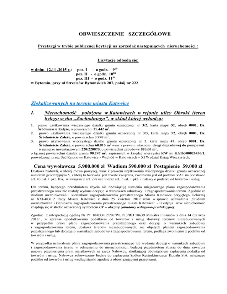 OBWIESZCZENIE SZCZEGÓŁOWE Przetargi w trybie publicznej licytacji na sprzedaż następujących nieruchomości : Licytacje odbędą się: poz. I - o godz. 900 poz. II - o godz. 1000 poz. III - o godz. 1100 w Bytomiu, przy ul Strzelców Bytomskich 207, pokój nr 222 w dniu: 12.11 .2015 r.: Zlokalizowanych na terenie miasta Katowice I. Nieruchomość położona w Katowicach w rejonie ulicy Obroki (teren byłego szybu „Zachodniego”, w skład której wchodzą: prawo użytkowania wieczystego działki gruntu oznaczonej nr 3/2, karta mapy 52, obręb 0001, Dz. Śródmieście Załęże, o powierzchni 25.442 m2, 2. prawo użytkowania wieczystego działki gruntu oznaczonej nr 3/3, karta mapy 52, obręb 0001, Dz. Śródmieście Załęże, o powierzchni 3.990 m2, 3. prawo użytkowania wieczystego działki gruntu oznaczonej nr 5, karta mapy 47, obręb 0001, Dz. Śródmieście Załęże, o powierzchni 60.815 m2 wraz z prawem własności drogi dojazdowej do pompowni, o numerze inwentarzowym 220/220070, o powierzchni zabudowy 820,00 m2, o łącznej powierzchni działek gruntu 90.247 m2, zapisanych w księdze wieczystej KW nr KA1K/00026456/1, prowadzonej przez Sąd Rejonowy Katowice - Wschód w Katowicach – XI Wydział Ksiąg Wieczystych, 1. Cena wywoławcza 5.900.000 zł Wadium 590.000 zł Postąpienie 59.000 zł Dostawa budowli, o której mowa powyżej, wraz z prawem użytkowania wieczystego działki gruntu oznaczonej numerem geodezyjnym 5, z którą ta budowla jest trwale związana, zwolniona jest od podatku VAT na podstawie art. 43 ust. 1 pkt. 10a, w związku z art. 29a ust. 8 oraz art. 7 ust. 1 pkt. 7 ustawy o podatku od towarów i usług. Dla terenu, będącego przedmiotem zbycia nie obowiązują ustalenia miejscowego planu zagospodarowania przestrzennego oraz nie zostały wydane decyzje o warunkach zabudowy i zagospodarowania terenu. Zgodnie ze studium uwarunkowań i kierunków zagospodarowania przestrzennego Miasta Katowice przyjętego Uchwałą nr XXI/483/12 Rady Miasta Katowice z dnia 25 kwietnia 2012 roku w sprawie uchwalenia „Studium uwarunkowań i kierunków zagospodarowania przestrzennego miasta Katowice” - II edycja w/w nieruchomość znajdują się w strefie oznaczonej symbolem UP – obszary zabudowy usługowo-produkcyjnej. Zgodnie z interpretacją ogólną Nr PT 10/033/12/207/WLI/13/RD 58639 Ministra Finansów z dnia 14 czerwca 2013r., w sprawie opodatkowania podatkiem od towarów i usług dostawy terenów niezabudowanych w przypadku braku planu zagospodarowania przestrzennego oraz decyzji o warunkach zabudowy i zagospodarowania terenu, dostawa terenów niezabudowanych, nie objętych planem zagospodarowania przestrzennego lub decyzją o warunkach zabudowy i zagospodarowania terenu, podlega zwolnieniu z podatku od towarów i usług. W przypadku uchwalenia planu zagospodarowania przestrzennego lub wydania decyzji o warunkach zabudowy i zagospodarowania terenu w odniesieniu do nieruchomości, będącej przedmiotem zbycia do dnia zawarcia umowy przeniesienia praw majątkowych na rzecz Nabywcy, skutkującej obowiązkiem zapłacenia podatku od towarów i usług, Nabywca zobowiązany będzie do zapłacenia Spółce Restrukturyzacji Kopalń S.A. należnego podatku od towarów i usług według stawki zgodnie z obowiązującymi przepisami. Ponadto w przypadku kontroli skarbowej i uznania, iż dostawa (zbycie) prawa użytkowania wieczystego działek gruntu, będących przedmiotem zbycia, podlega opodatkowaniu podatkiem od towarów i usług, Nabywca zobowiązany będzie do zapłacenia Spółce Restrukturyzacji Kopalń S.A., należnego podatku od towarów i usług według obowiązującej stawki. W obrębie działki nr 3/2 znajduje się wylot zlikwidowanego przez zasypanie szybu „Zachodni” zabezpieczony betonową płytą. Przy umowie przeniesienia prawa użytkowania wieczystego nieruchomości nabywca będzie zobowiązany oświadczyć, iż wie o tej okoliczności i stan ten w pełni akceptuje. W obrębie działek o nr 3/2, 3/3 i 5, została zrealizowana likwidacja budynków byłej KWK „Kleofas” oraz osadników wód dołowych. W związku z tym pod powierzchnią terenu mogą wystąpić pozostałości konstrukcji fundamentów i nieczynnej infrastruktury technicznej, a właściwości geomechaniczne gruntu mogą być pogorszone. Przy umowie przeniesienia prawa użytkowania wieczystego nieruchomości nabywca będzie zobowiązany oświadczyć, iż wie o tej okoliczności i stan ten w pełni akceptuje. W południowej części działki nr 5 zlokalizowane są ogródki działkowe, użytkowane na podstawie umów dzierżawy. Przy umowie przeniesienia prawa użytkowania wieczystego nieruchomości nabywca będzie zobowiązany oświadczyć, iż wie o tej okoliczności i stan ten w pełni akceptuje. Nr wadium MM/I/12.11.2015 II. Nieruchomość gruntowa niezabudowana położona w Katowicach w rejonie alei Roździeńskiego, w skład której wchodzą: 1) prawo użytkowania wieczystego działki gruntu oznaczonej numerem geodezyjnym 67, arkusz mapy 35, obręb 0002, Dz. Bogucice – Zawodzie o powierzchni 87 m2, 2) prawo użytkowania wieczystego działki gruntu oznaczonej numerem geodezyjnym 71/2, arkusz mapy 35, obręb 0002, Dz. Bogucice – Zawodzie o powierzchni 539 m2, 3) prawo użytkowania wieczystego działki gruntu oznaczonej numerem geodezyjnym 77/2, arkusz mapy 35, obręb 0002, Dz. Bogucice – Zawodzie o powierzchni 228 m2, 4) prawo użytkowania wieczystego działki gruntu oznaczonej numerem geodezyjnym 78/2, arkusz mapy 35, obręb 0002, Dz. Bogucice – Zawodzie o powierzchni 266 m2, 5) prawo użytkowania wieczystego działki gruntu oznaczonej numerem geodezyjnym 83, arkusz mapy 35, obręb 0002, Dz. Bogucice – Zawodzie o powierzchni 981 m2, zapisaną w księdze wieczystej KW nr KA1K/00057559/9 prowadzonej przez Sąd Rejonowy Katowice Wschód w Katowicach – XI Wydział Ksiąg Wieczystych, o łącznej powierzchni 2.101 m2. Cena wywoławcza 150.000 zł Wadium 15.000 zł Postąpienie 1.500 zł D