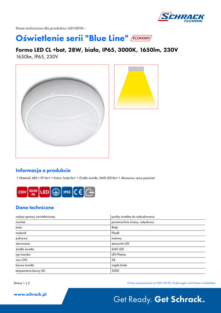 Dane techniczne dla produktu: LID13018-- Oświetlenie serii "Blue Line" Formo LED CL +bat, 28W, biała, IP65, 3000K, 1650lm, 230V 1650lm, IP65, 230V Informacja o produkcie •Materiał: ABS + PC<br>•Kolorr: biały<br>•Źródło światła: SMD LED<br>•Akcesoria: szary pierścień Dane techniczne rodzaj oprawy oświetleniowej punkty świetlne do nabudowania montaż powierzchnia ściany, natynkowy kolor Biały materiał Plastik pokrywa matowy sterowanie sterownik LED źródło światła SMD LED typ trzonka LED Platine moc (W) 28 barwa światła ciepła biała temperatura barwy (K) 3000 Strona 1 z 2 www.schrack.pl Online zamieszczone na 2017-03-07, Änderungen und Irrtümer vorbehalten Get Ready. Get Schrack. Dane techniczne - kontynuacja strumień świetlny (lm) 1650 ilość lamp 1 stopień szczelności IP65 Klasy efektywności energetycznej A zawiera żródła światła tak ØxW mm 343x110 rysunek wymiarowy: Formo LED CL +bat, 28W, biała, IP65, 3000K, 1650lm, 230V Lista produktów OPIS Dostępny Formo LED CL +bat, 28W, biała, IP65, 3000K, 1650lm, 230V 1650lm, IP65, 230V STORE W magazynie, gotowy do dostawy w dniu zamówienia Strona 2 z 2 www.schrack.pl STORE Nr katalogowy LID13018 W magazynie, czas realizacji 24 h w Online zamieszczone na 2017-03-07, Änderungen und Irrtümer vorbehalten Get Ready. Get Schrack.