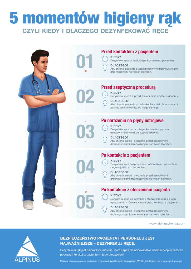 5 momentów higieny rąk czyli kiedy i dlaczego dezynfekować ręce 01 02 Przed kontaktem z pacjentem KIEDY? Dezynfekuj ręce przed każdym kontaktem z pacjentem. DLACZEGO? Aby chronić pacjenta przed szkodliwymi drobnoustrojami przenoszonymi na twoich dłoniach. Przed aseptyczną procedurą KIEDY? Dezynfekuj ręce tuż przed wykonaniem czystej procedury. DLACZEGO? Aby chronić pacjenta przed szkodliwymi drobnoustrojami pochodzącymi również od niego samego. 03 Po narażeniu na płyny ustrojowe 04 Po kontakcie z pacjentem 05 Po kontakcie z otoczeniem pacjenta KIEDY? Dezynfekuj ręce po możliwym kontakcie z płynami ustrojowymi (również po zdjęciu rękawic). DLACZEGO? Aby chronić siebie i otoczenie przed szkodliwymi drobnoustrojami przenoszonymi na twoich dłoniach. KIEDY? Dezynfekuj ręce bezpośrednio po kontakcie z pacjentem i jego najbliższym otoczeniem. DLACZEGO? Aby chronić siebie i otoczenie przed szkodliwymi drobnoustrojami przenoszonymi na twoich dłoniach. KIEDY? Dezynfekuj ręce po interakcji z otoczeniem oraz po jego opuszczeniu – również w razie braku kontaktu z pacjentem. DLACZEGO? Aby chronić siebie i otoczenie przed szkodliwymi drobnoustrojami przenoszonymi na twoich dłoniach. www.alpinuschemia.com BEZPIECZEŃSTWO PACJENTA I PERSONELU JEST NAJWAŻNIEJSZE – DEZYNFEKUJ RĘCE. Dezynfekcja rąk jest najprostszą metodą, która zapewnia odpowiednie warunki bezpieczeństwa podczas interakcji z pacjentem i jego otoczeniem. Materiał przygotowany na podstawie wytycznych World Health Organization (WHO), dot. higieny rąk w opiece zdrowotnej.