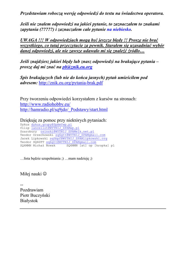 Przedstawiam roboczą wersję odpowiedzi do testu na świadectwa operatora. Jeśli nie znałem odpowiedzi na jakieś pytanie, to zaznaczałem to znakami zapytania (?????) i zaznaczałem całe pytanie na niebiesko. UWAGA !!! W odpowiedziach mogą być jeszcze błędy !! Proszę nie brać wszystkiego, co tutaj przeczytacie za pewnik. Starałem się uzasadniać wybór danej odpowiedzi, ale nie zawsze udawało mi się znaleźć źródło… Jeśli znajdziesz jakieś błędy lub znasz odpowiedzi na brakujące pytania – proszę daj mi znać na [email protected] Spis brakujących (lub nie do końca jasnych) pytań umieściłem pod adresem: http://znik.eu.org/pytania-brak.pdf Przy tworzeniu odpowiedzi korzystałem z kursów na stronach: http://www.radiohobby.eu/ http://hamradio.pl/sq9jdo/_Podstawy/start.html Dziękuję za pomoc przy niektórych pytaniach: Dykus [email protected] filip lancellot@WYTNIJ_SPAMwp.pl Szarobury osinski@WYTNIJ_SPAMelk.net.pl Teodor Orzechowski sq6gtt@WYTNIJ_SPAMgmail.com Jacek Lipkowski sq5bpf@WYTNIJ_SPAMlipkowski.org Teodor SQ6GTT sq6gtt@WYTNIJ_SPAMgmail.com SQ6MMN Michał Nowak SQ6MMN [at] op [kropka] pl …lista będzie uzupełniania ;) …mam nadzieję ;) Miłej nauki ☺ -Pozdrawiam Piotr Buczyński Białystok WIADOMOŚCI TECHNICZNE Z ZAKRESU RADIOELEKTRONIKI dla świadectw klasy A, B, C i D 1. Czy opór elektryczny przewodu zależy od materiału z którego jest wykonany? A. zależy B. nie zależy C. zależy od izolacji przewodu http://pl.wikipedia.org/wiki/Rezystancja Rezystancja przewodnika o jednakowym przekroju poprzecznym do kierunku przepływu prądu jest proporcjonalna do długości przewodnika, odwrotnie proporcjonalna do przekroju i zależy od materiału, co wyraża wzór: 2. Izolatorami nazywamy materiały które: A. nie przewodzą prądu elektrycznego B. przewodzą słabo C. przewodzą prąd przy wysokim napięciu http://pl.wikipedia.org/wiki/Izolator_elektryczny Izolator elektryczny - materiał, który nie przewodzi prądu elektrycznego (np. dielektryk). Izolatorami są np.: szkło, porcelana, specjalna guma, pewne rodzaje plastików, suche drewno, olej transformatorowy, suche powietrze, próżnia. 3. Który przewód o tej samej długości i przekroju będzie miał największą oporność? A. wykonany z aluminium B. wykonany z żelaza C. wykonany z miedzi http://pl.wikipedia.org/wiki/Rezystywno%C5%9B%C4%87 Tabela rezystywności niektórych substancji (w temp. 20 stopni Celsjusza): materiał rezystywność (Ωm) miedź 1,7 x 10-8 złoto 2,44 x 10-8 aluminium 2,82 x 10-8 żelazo 10 x 10-8 Żelazo ma największą rezystywność wśród wskazanych metali, więc zgodnie ze wzorem: , taki przewód będzie miał największą rezystancje. 4. Który z materiałów ma własności półprzewodnikowe? A. złoto B. german C. platyna http://pl.wikipedia.org/wiki/P%C3%B3%C5%82przewodnik Półprzewodnikami są krzem, german, arsenek galu, i kilka innych pierwiastków. Złoto i platyna to metale, a więc całkiem dobre przewodniki. 5. Żarówka 12 V pobiera z baterii 0,1 A. Jaką oporność ma żarówka? A. oporność 120 om B. oporność 12 om C. oporność 1,2 kom Zgodnie z prawem Oma mamy: U = R⋅I R= U 12V = = 120Ω I 0,1A 6. Żarówka ma moc 24 W i pobiera z akumulatora 2 A. Jakie jest napięcie akumulatora? A. napięcie wynosi 24 V B. napięcie wynosi 12 V C. napięcie wynosi 48 V P =U ⋅I P 24W U= = = 12V 2A I 7. Źródła chemiczne prądu dają prąd: A. stały B. zmienny C. pulsujący Przykładem źródła chemicznego może być bateria lub akumulator – są to źródła prądu stałego. 8. Akumulator ma pojemność 20 Ah. Jak długo będzie świecić z niego żarówka pobierająca 4 A? A. 5 godzin B. 4 godziny C. 80 godzin C = I ⋅t C 20 Ah t= = = 5h I 4A 9. Ile bateryjek 4,5 V potrzebujemy połączyćw szereg, by uzyskać baterię anodową o napięciu 90 V? A. 15 szt. B. 10 szt. C. 20 szt. Przy połączeniu szeregowym sumujemy napięcia, więc 90V/4,5V = 20 10. Ładunki elektryczne w przestrzeni przyciągają się jeżeli: A. są jednoimienne B. są różnoimienne C. są nieskończenie daleko http://pl.wikipedia.org/wiki/%C5%81adunek_elektryczny Ładunki tego samego rodzaju odpychają się, a różnego przyciągają. 11. Materiały ferromagnetyczne to materiały które przewodzą pole magnetyczne: A. lepiej niż powietrze B. tak jak powietrze C. gorzej niż powietrze -> źródło ?? 12. Jaki kierunek przyjmuje pole magnetyczne wokół przewodnika z prądem? A. jest prostopadłe do przewodu B. jest do niego równoległe C. jest ukośne do przewodu http://www.walter-fendt.de/ph14pl/mfwire_pl.htm 13. Jeżeli składowa elektryczna fali jest prostopadła do ziemi to fala ma polaryzację? A. poziomą B. pionową C. kołową http://pl.wikipedia.org/wiki/Polaryzacja_fali (…) Z faktu tego wynika polaryzacja fal radiowych wytwarzanych przez anteny. Antena w postaci dipola wytwarza falę spolaryzowaną zgodnie z ustawieniem dipola. Radiofonia na falach długich i średnich używa polaryzacji pionowej (zmiany natężenia pola elektrycznego mają pionowy kierunek) ze względu na wykorzystanie pionowego masztu jako anteny. Telewizja w transmisji naziemnej używa polaryzacji poziomej, tak by można było odbierać jedną anteną wszystkie stacje telewizyjne (były wyjątki). Służby techniczne pracujące na zakresie fal decymetrowych, by ograniczyć wzajemne zakłócenia telewizji i służb stosują polaryzację pionową. W telewizji satelitarnej polaryzację stosuje się do zwiększenia liczby kanałów dostępnych w tym samym paśmie. Antena wytwarzająca falę spolaryzowaną kołowo składa się z dwóch dipoli ustawionych prostopadle i zasilanych drganiami z przesunięciem fazowym o 90 stopni. Fale radiowe w wyniku wielokrotnego rozproszenia tracą swoją polaryzację. 14. Czy prędkość fali elektromagnetycznej zależy od ośrodka w którym się rozchodzi ? A. tak B. nie zależy C. jest zawsze jednakowa http://pl.wikipedia.org/wiki/Pr%C4%99dko%C5%9B%C4%87_faz