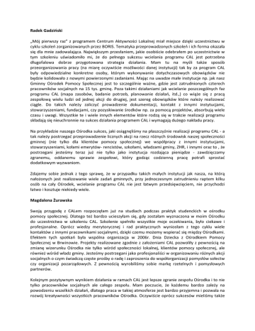 Radek Gadziński „Mój pierwszy raz” z programem Centrum Aktywności Lokalnej miał miejsce dzięki uczestnictwu w cyklu szkoleń zorganizowanych przez BORIS. Tematyka przeprowadzonych szkoleń i ich forma okazała się dla mnie zadowalająca. Największym przesłaniem, jakie osobiście odebrałem po uczestnictwie w tym szkoleniu uświadomiło mi, że do pełnego sukcesu wcielania programu CAL jest potrzebna długofalowa dobrze przygotowana strategia działania. Mam tu na myśli także sposób przeorganizowania pracy (na miarę oczywiście możliwości danej instytucji) tak by za program CAL były odpowiedzialne konkretne osoby, którym wykonywanie dotychczasowych obowiązków nie będzie kolidowało z nowymi powierzonymi zadaniami. Mając na uwadze małe instytucje np. jak nasz Gminny Ośrodek Pomocy Społecznej jest to szczególnie ważne, gdzie jest zatrudnionych czterech pracowników socjalnych na 15 tys. gminę. Poza takimi działaniami jak wcielanie poszczególnych faz programu CAL (mapa zasobów, badanie potrzeb, planowanie działań, itd.,) co wiąże się z pracą zespołową wielu ludzi od jednej akcji do drugiej, jest szereg obowiązków które należy realizować ciągle. Do takich należy zaliczyć prowadzenie dokumentacji, kontakt z innymi instytucjami, stowarzyszeniami, fundacjami, czy pozyskiwanie środków np. za pomocą projektów, absorbują wiele czasu i uwagi. Wszystkie te i wiele innych elementów które rodzą się w trakcie realizacji programu składają się nieuchronnie na sukces działania programem CAL i wymagają dużego nakładu pracy. Na przykładzie naszego Ośrodka sukces, jaki osiągnęliśmy na płaszczyźnie realizacji programu CAL - a tak należy postrzegać przeprowadzenie licznych akcji na rzecz różnych środowisk naszej społeczności gminnej (nie tylko dla klientów pomocy społecznej) we współpracy z innymi instytucjami, stowarzyszeniami, kołami emerytów- rencistów, szkołami, władzami gminy, ZHR, i innymi oraz to , że postrzegani jesteśmy teraz już nie tylko jako instytucja rozdająca pieniądze - zawdzięczamy zgranemu, oddanemu sprawie zespołowi, który godząc codzienną pracę potrafi sprostać dodatkowym wyzwaniom. Zdajemy sobie jednak z tego sprawę, że w przypadku takich małych instytucji jak nasza, na którą nałożonych jest realizowanie wiele zadań gminnych, przy jednoczesnym zatrudnieniu raptem kilku osób na cały Ośrodek, wcielanie programu CAL nie jest łatwym przedsięwzięciem, nie przychodzi łatwo i kosztuje niekiedy wiele. Magdalena Żurawska Swoją przygodę z CALem rozpoczęłam już na studiach podczas praktyk studenckich w ośrodku pomocy społecznej. Dlatego też bardzo ucieszyłam się, gdy zostałam wyznaczona w moim Ośrodku do uczestnictwa w szkoleniu CAL. Szkolenie spełniło wszystkie moje oczekiwania, było ciekawe i profesjonalne. Oprócz wiedzy merytorycznej i rad praktycznych wyniosłam z tego cyklu wiele kontaktów z innymi pracownikami socjalnymi, dzięki czemu możemy wspierać się między Ośrodkami. Efektem tych spotkań była wspólna organizacja w 2006r. Dnia Dziecka z Ośrodkiem Pomocy Społecznej w Brwinowie. Projekty realizowane zgodnie z założeniami CAL pozwoliły z pewnością na zmianę wizerunku Ośrodka nie tylko wśród społeczności lokalnej, klientów pomocy społecznej, ale również wśród władz gminy. Jesteśmy postrzegani jako profesjonaliści w organizowaniu różnych akcji socjalnych o czym świadczą częste prośby o radę i zaproszenia do współorganizacji pomysłów sołectw czy organizacji pozarządowych. Z pewnością wyrobiliśmy sobie markę rzetelnych i pomysłowych partnerów. Kolejnym pozytywnym wynikiem działania w ramach CAL jest lepsze zgranie zespołu Ośrodka i to nie tylko pracowników socjalnych ale całego zespołu. Mam poczucie, że każdemu bardzo zależy na powodzeniu wszelkich działań, dlatego praca w takiej atmosferze jest bardzo przyjemna i pozwala na rozwój kreatywności wszystkich pracowników Ośrodka. Oczywiście oprócz sukcesów mieliśmy także problemy przy realizacji programu, jednak z każdym miesiącem i każdą kolejną akcją „docieramy się” i lepiej rozdzielamy zadania poznając swoje talenty i możliwości. Każda zakończona akcja i podziękowania ze strony jej uczestników dają nam satysfakcję i siłę na kolejne miesiące z CALem w Ośrodku, a raczej Ośrodkiem jako CAL. Jolanta Jachna Dzięki uczestnictwie w szkoleniu „Cal w pigułce” , mogłam bardziej szczegółowo poznać założenia programu. Wcześniejsze informacje uzyskiwałam od Kierownika Ośrodka i pracowników socjalnych. Szkolenie „cal w pigułce” było jednym z ciekawszych, czytelniejszych i udanych szkoleń. Atmosfera wśród trenerów i uczestników była bardzo sympatyczna. Działając tą metodą nasz Ośrodek stał się bardziej widoczny na terenie Gminy. Dużym sukcesem jest również zmiana wizerunku naszego Ośrodka wśród władz Gminy oraz innych jednostek gminnych. Także nasi klienci zaczęli obdarzać nas większym zaufaniem. Zaakceptowali i chętnie uczestniczą w naszych projektach. Cieszy mnie zadowolenie naszych dzieci z organizowanych przez nas imprez i widzę większą integrację i współpracę z rodzinami. Nie odbierają nas jako sztywnych urzędników ale jako ludzi otwartych i przychylnych im. W związku z tym obecne moje rozmowy z klientami mają bardziej partnerski charakter .Zauważam również lepszą współprace i większe chęci do pomocy w organizowaniu różnych przedsięwzięć. Mam nadzieje, że przyjdzie moment w którym to sami klienci przy naszej niewielkiej pomocy będą pomysłodawcami i realizatorami projektów. Powyższa zmiana zarówno władz Gminny jak również mieszkańców stanowi dla mnie ogromny sukces całego zespołu Ośrodka. Dzięki zmianie wizerunku Ośrodka na instytucję otwartą, aktywną i solidną cieszymy się większym zaufaniem i autorytetem. Cieszy mnie to ,że jesteśmy pos