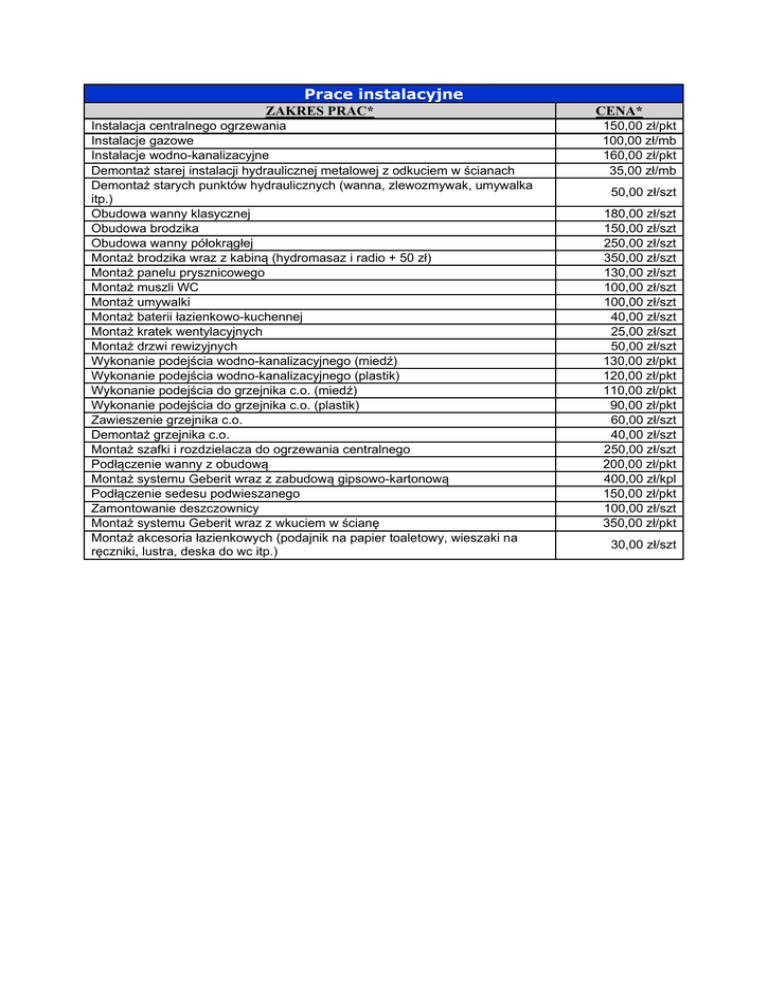 Prace instalacyjne ZAKRES PRAC* Instalacja centralnego ogrzewania Instalacje gazowe Instalacje wodno-kanalizacyjne Demontaż starej instalacji hydraulicznej metalowej z odkuciem w ścianach Demontaż starych punktów hydraulicznych (wanna, zlewozmywak, umywalka itp.) Obudowa wanny klasycznej Obudowa brodzika Obudowa wanny półokrągłej Montaż brodzika wraz z kabiną (hydromasaz i radio + 50 zł) Montaż panelu prysznicowego Montaż muszli WC Montaż umywalki Montaż baterii łazienkowo-kuchennej Montaż kratek wentylacyjnych Montaż drzwi rewizyjnych Wykonanie podejścia wodno-kanalizacyjnego (miedź) Wykonanie podejścia wodno-kanalizacyjnego (plastik) Wykonanie podejścia do grzejnika c.o. (miedź) Wykonanie podejścia do grzejnika c.o. (plastik) Zawieszenie grzejnika c.o. Demontaż grzejnika c.o. Montaż szafki i rozdzielacza do ogrzewania centralnego Podłączenie wanny z obudową Montaż systemu Geberit wraz z zabudową gipsowo-kartonową Podłączenie sedesu podwieszanego Zamontowanie deszczownicy Montaż systemu Geberit wraz z wkuciem w ścianę Montaż akcesoria łazienkowych (podajnik na papier toaletowy, wieszaki na ręczniki, lustra, deska do wc itp.) CENA* 150,00 zł/pkt 100,00 zł/mb 160,00 zł/pkt 35,00 zł/mb 50,00 zł/szt 180,00 zł/szt 150,00 zł/szt 250,00 zł/szt 350,00 zł/szt 130,00 zł/szt 100,00 zł/szt 100,00 zł/szt 40,00 zł/szt 25,00 zł/szt 50,00 zł/szt 130,00 zł/pkt 120,00 zł/pkt 110,00 zł/pkt 90,00 zł/pkt 60,00 zł/szt 40,00 zł/szt 250,00 zł/szt 200,00 zł/pkt 400,00 zł/kpl 150,00 zł/pkt 100,00 zł/szt 350,00 zł/pkt 30,00 zł/szt