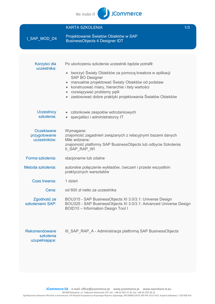 KARTA SZKOLENIA I_SAP_MOD_D4 Korzyści dla uczestnika: Uczestnicy szkolenia: Oczekiwane przygotowanie uczestników: Forma szkolenia: Metoda szkolenia: Czas trwania: Cena: 1/3 Projektowanie Światów Obiektów w SAP BusinessObjects 4 Designer IDT Po ukończeniu szkolenia uczestnik będzie potrafił: tworzyć Światy Obiektów za pomocą kreatora w aplikacji SAP BO Designer manualnie projektować Światy Obiektów od podstaw konstruować miary, hierarchie i listy wartości rozwiązywać problemy pętli zastosować dobre praktyki projektowania Światów Obiektów członkowie zespołów wdrożeniowych specjaliści i administratorzy IT Wymagane: znajomość zagadnień związanych z relacyjnymi bazami danych Mile widziane: znajomość platformy SAP BusinessObjects lub odbycie Szkolenia II_SAP_RAP_WI stacjonarne lub zdalne autorskie połączenie wykładów, ćwiczeń i przede wszystkim praktycznych warsztatów 1 dzień od 600 zł netto za uczestnika Zgodność ze szkoleniami SAP: BOU315 - SAP BusinessObjects XI 3.0/3.1: Universe Design BOU325 - SAP BusinessObjects XI 3.0/3.1: Advanced Universe Design BOID10 – Information Design Tool I Rekomendowane szkolenia uzupełniające: III_SAP_RAP_A - Administracja platformą SAP BusinessObjects JCommerce SA e-mail: [email protected] www.jcommerce.pl www.nearshore-it.eu 40-600 Katowice, ul. Tadeusza Kościuszki 227, tel.: +48 32 201 15 32, fax: +48 32 255 36 15 Sąd Rejonowy Katowice-Wschód w Katowicach, VIII Wydział Gospodarczy Krajowego Rejestru Sądowego, KRS 0000312679, NIP 945-20-27-657, Kapitał zakładowy 1 220 000 PLN KARTA SZKOLENIA I_SAP_MOD_D4 Program szkolenia: 2/3 Projektowanie Światów Obiektów w SAP BusinessObjects 4 Designer IDT 1. Wprowadzenie do projektowania Światów Obiektów SAP BusinessObjects Designer 1.1. Światy Obiektów 1.2. Logowanie do aplikacji 2. Tworzenie Światów Obiektów 2.1. Prosty Świat za pomocą kreatora 2.2. Świat Obiektów manualnie 2.2.1. Nowy Świat 2.2.2. Dodawanie tabel 2.2.3. Dodawanie połączeń między tabelami i ich rodzaje 2.2.4. Sprawdzanie poprawności 2.2.5. Tworzenie klas 2.2.6. Dodawanie obiektów i rodzaje obiektów 2.2.7. Konstrukcja miar 2.2.8. Tworzenie hierarchii 2.2.9. Dodawanie i nakładanie filtrów 2.2.10. Eksport i import Świata Obiektów 2.2.11. Listy wartości i pliki LOV 2.2.12. Dokumentowanie Świata Obiektów 2.2.13. Nakładanie ograniczeń dostępu i zarządzanie nimi 3. Rozwiązywanie problemów z pętlami 3.1. Definicja pętli 3.2. Tworzenie kontekstów 3.3. Aliasy i tabele pochodne 3.4. Tworzenie złącz skrótu 4. Dobre praktyki wspomagające tworzenie Świata Obiektów 5. Wprowadzenie do projektowania Światów Obiektów SAP BusinessObjects Information Design Tool 5.1. Światy Obiektów 5.2. Logowanie do aplikacji 6. Praca z projektem 7. Konwersja z UNV do UNX JCommerce SA e-mail: [email protected] www.jcommerce.pl www.nearshore-it.eu 40-600 Katowice, ul. Tadeusza Kościuszki 227, tel.: +48 32 201 15 32, fax: +48 32 255 36 15 Sąd Rejonowy Katowice-Wschód w Katowicach, VIII Wydział Gospodarczy Krajowego Rejestru Sądowego, KRS 0000312679, NIP 945-20-27-657, Kapitał zakładowy 1 220 000 PLN KARTA SZKOLENIA I_SAP_MOD_D4 3/3 Projektowanie Światów Obiektów w SAP BusinessObjects 4 Designer IDT 8. Warstwa danych 8.1. Połączenia 8.2. Dodawanie warstwy danych oraz tabel 8.3. Dodawanie połączeń 8.4. Sprawdzanie poprawności 8.5. Problem pętli 9. Warstwa biznesowa 9.1. Dodawanie warstwy biznesowej 9.2. Obiekty warstwy biznesowej 9.3. Ścieżki nawigacyjne 9.4. Filtry 10. Publikowanie Świata obiektów 11. Bezpieczeństwo JCommerce SA e-mail: [email protected] www.jcommerce.pl www.nearshore-it.eu 40-600 Katowice, ul. Tadeusza Kościuszki 227, tel.: +48 32 201 15 32, fax: +48 32 255 36 15 Sąd Rejonowy Katowice-Wschód w Katowicach, VIII Wydział Gospodarczy Krajowego Rejestru Sądowego, KRS 0000312679, NIP 945-20-27-657, Kapitał zakładowy 1 220 000 PLN