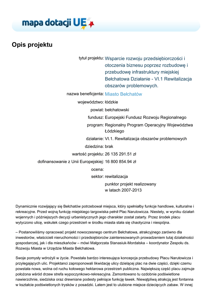 Opis projektu tytuł projektu: Wsparcie rozwoju przedsiębiorczości i otoczenia biznesu poprzez rozbudowę i przebudowę infrastruktury miejskiej Bełchatowa Działanie - VI.1 Rewitalizacja obszarów problemowych. nazwa beneficjenta: Miasto Bełchatów województwo: łódzkie powiat: bełchatowski fundusz: Europejski Fundusz Rozwoju Regionalnego program: Regionalny Program Operacyjny Województwa Łódzkiego działanie: VI.1. Rewitalizacja obszarów problemowych dziedzina: brak wartość projektu: 26 135 291.51 zł dofinansowanie z Unii Europejskiej: 16 800 854.94 zł ocena: sektor: rewitalizacja punktor projekt realizowany w latach 2007-2013 Dynamicznie rozwijający się Bełchatów potrzebował miejsca, który spełniałby funkcje handlowe, kulturalne i rekreacyjne. Przed wojną funkcję miejskiego targowiska pełnił Plac Narutowicza. Niestety, w wyniku działań wojennych i późniejszych decyzji urbanistycznych jego charakter został zatarty. Przez środek placu wytyczono ulicę, wskutek czego przestrzeń w środku miasta stała się chaotyczna i niespójna. – Postanowiliśmy opracować projekt nowoczesnego centrum Bełchatowa, atrakcyjnego zarówno dla inwestorów, właścicieli nieruchomości i przedsiębiorców zainteresowanych prowadzeniem tutaj działalności gospodarczej, jak i dla mieszkańców – mówi Małgorzata Stanasiuk-Mordalska – koordynator Zespołu ds. Rozwoju Miasta w Urzędzie Miasta Bełchatowa. Swoje pomysły wdrożyli w życie. Powstała bardzo interesująca koncepcja przebudowy Placu Narutowicza i przylegających ulic. Projektanci zaproponowali likwidację ulicy dzielącej plac na dwie części, dzięki czemu powstała nowa, wolna od ruchu kołowego hektarowa przestrzeń publiczna. Największą część placu zajmuje położona wśród drzew strefa wypoczynkowo-rekreacyjna. Zamontowano tu ozdobnie podświetlone nawierzchnie, siedziska oraz drewniane podesty pełniące funkcję ławek. Niewątpliwą atrakcją jest fontanna w kształcie podświetlonych trysków z posadzki. Latem jest to ulubione miejsce dziecięcych zabaw. W innej części skweru urządzono plac zabaw dla dzieci, a obok placyk do rekreacji osób starszych. Znajdują się tu szachownice terenowe i stoliki do gier. Z kolei plac przed Miejskim Centrum Kultury stanowi doskonałą przestrzeń do organizacji imprez kulturalnych, sportowych i promocyjnych. – Obserwujemy, że atrakcyjne centrum zachęca do inwestowania i mobilizuje właścicieli nieruchomości do większej dbałości o estetykę – mówi Małgorzata Stanasiuk-Mordalska. – Miasto im w tym pomaga, oferując zwolnienie z podatku od nieruchomości. Na terenie objętym programem rewitalizacji powstało już 11 nowych kamienic mieszkalnych z lokalami usługowymi, a właściciele starych budynków gruntownie wyremontowali 19 obiektów. Zwieńczeniem programu odnowy centrum Bełchatowa jest nowy budynek centrum kultury wraz z salą teatralną na 500 osób oraz ekspozycją „Giganty Mocy”. Przy użyciu multimediów zwiedzający mogą poznawać historię i teraźniejszość przemysłu górniczego i energetycznego.