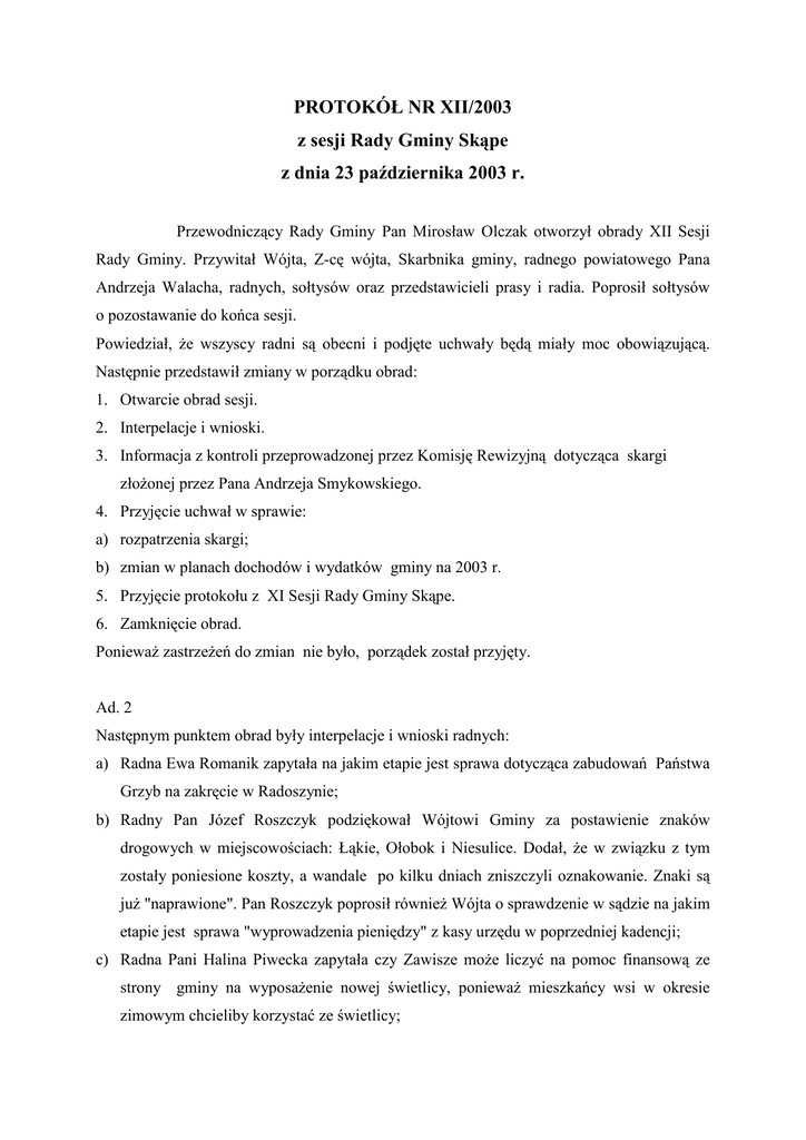 PROTOKÓŁ NR XII/2003 z sesji Rady Gminy Skąpe z dnia 23 października 2003 r. Przewodniczący Rady Gminy Pan Mirosław Olczak otworzył obrady XII Sesji Rady Gminy. Przywitał Wójta, Z-cę wójta, Skarbnika gminy, radnego powiatowego Pana Andrzeja Walacha, radnych, sołtysów oraz przedstawicieli prasy i radia. Poprosił sołtysów o pozostawanie do końca sesji. Powiedział, Ŝe wszyscy radni są obecni i podjęte uchwały będą miały moc obowiązującą. Następnie przedstawił zmiany w porządku obrad: 1. Otwarcie obrad sesji. 2. Interpelacje i wnioski. 3. Informacja z kontroli przeprowadzonej przez Komisję Rewizyjną dotycząca skargi złoŜonej przez Pana Andrzeja Smykowskiego. 4. Przyjęcie uchwał w sprawie: a) rozpatrzenia skargi; b) zmian w planach dochodów i wydatków gminy na 2003 r. 5. Przyjęcie protokołu z XI Sesji Rady Gminy Skąpe. 6. Zamknięcie obrad. PoniewaŜ zastrzeŜeń do zmian nie było, porządek został przyjęty. Ad. 2 Następnym punktem obrad były interpelacje i wnioski radnych: a) Radna Ewa Romanik zapytała na jakim etapie jest sprawa dotycząca zabudowań Państwa Grzyb na zakręcie w Radoszynie; b) Radny Pan Józef Roszczyk podziękował Wójtowi Gminy za postawienie znaków drogowych w miejscowościach: Łąkie, Ołobok i Niesulice. Dodał, Ŝe w związku z tym zostały poniesione koszty, a wandale po kilku dniach zniszczyli oznakowanie. Znaki są juŜ "naprawione". Pan Roszczyk poprosił równieŜ Wójta o sprawdzenie w sądzie na jakim etapie jest sprawa "wyprowadzenia pieniędzy" z kasy urzędu w poprzedniej kadencji; c) Radna Pani Halina Piwecka zapytała czy Zawisze moŜe liczyć na pomoc finansową ze strony gminy na wyposaŜenie nowej świetlicy, poniewaŜ mieszkańcy wsi w okresie zimowym chcieliby korzystać ze świetlicy; d) Mieszkaniec wsi Ołobok - Pan Tadeusz Wijatyk, zapytał czy uzyska odpowiedź na pytanie zadane na poprzedniej sesji. Po wysłuchaniu interpelacji Wójt powiedział, Ŝe na pytanie Pana Wijatyka odpowiedzi udzieli w najbliŜszym czasie, poniewaŜ pytania zadane na sesji zostają przekazane poszczególnym referatom. W odpowiedzi na pytanie Pani Romanik Wójt powiedział, Ŝe w listopadzie 2002 r. Dyrektor Zarządu Dróg Wojewódzkich poinformował, iŜ podejmie działania dotyczące wykupu posesji Państwa Grzyb. Do końca lipca posesja miała być wykupiona, lecz do wykupu nie doszło. Dyrektor ZDW zapytał, czy Gmina Skąpe moŜe wejść jako strona w tej sprawie i przeznaczyć grunt na ten cel. Wójt dodał, Ŝe poinformował Państwa Grzyb o moŜliwości przekazania im działki, którzy zgodzili się z propozycją Wójta. Na dzień dzisiejszy sprawa nie jest załatwiona do końca. W nawiązaniu do interpelacji Pana Roszczyka, powiedział, Ŝe podobna sytuacja jest w Węgrzynicach, gdzie została zniszczona tabliczka przy wysypisku śmieci. W sprawie wyprowadzenia pieniędzy z Urzędu Gminy radczyni poinformowała, Ŝe została złoŜona apelacja i decyzja będzie podjęta przez sąd wyŜszej instancji. W sprawie świetlicy w Zawiszu Wójt powiedział, Ŝe sytuacja budŜetu gminy jest lepsza niŜ w ubiegłym czasie i w miarę moŜliwości gmina będzie mogła tej wsi pomóc. Dodał, Ŝe przewodniczącą GKRPA - Pani Wolniewicz poinformowała, iŜ ze środków GKRPA będzie mogła finansować zatrudnienie opiekuna dla dzieci w świetlicach. Obecnie komisja oświaty zakończyła wizytację świetlic wiejskich. Wójt złoŜył wniosek do komisji oświaty, aby podjęli decyzję dotyczącą funkcjonowania świetlic. W okresie międzysesyjnym podejmowane były prace: 1) związane z oświetleniem ulicznym w gminie. Na dzisiaj koszty utrzymania oświetlenia wynoszą ok. 100 000 zł, koszty eksploatacji około 50 000 zł. Powodem tak wysokich sum jest to, Ŝe oświetlenie jest stare (ma około 30 lat). Od stycznia 2004 r. będzie to zadanie własne gminy. 2) odbyło się spotkanie z Prezesem Wojewódzkiego Funduszu Ochrony Środowiska. Powodem spotkania były dwa cele: złoŜenie wniosku o poŜyczkę na inwestycję wodociągu w Skąpem i wspólna inwestycja trzech gmin: Lubrza, Świebodzin i Skąpe. Inwestycja ta ma dotyczyć skanalizowania miejscowości połoŜonych przy jeziorze Niesłysz pod kątem wpisania jej do tzw. funduszu spójności. Byłaby to trzecia inwestycja na poziomie województwa. 2 3) odbyło się spotkanie dyrektorów szkół w Urzędzie Gminy z okazji Dnia Edukacji Narodowej; 4) związane z planem zagospodarowania przestrzennego Niesulic. Obecnie wiadomo, Ŝe plan będzie kosztował 20 000 zł., ekofizjografia równieŜ około 20 000 zł. termin do 12 listopada; Do momentu wejścia w Ŝycie ustawy nie były podejmowane Ŝadne decyzje. Ustawa obowiązuje od lipca br., ale nie ma jeszcze aktów wykonawczych. 5) związane z wodociągiem w Pałcku, były rozmowy wstępne z wykonawcą, w piątek zostanie podpisana umowa. Prace trwają tak długo, poniewaŜ mamy do wyboru 2 opcje: 1) czy na bazie przesyłu ze Skąpego, 2) czy modernizacja stacji uzdatniania w Pałcku i odwiert studni; 6) zakończono temat pionów gazowych. Wykonawca wystąpił z wnioskiem, Ŝe Gmina Skąpe nie zapłaciła 21 000 zł, po przeanalizowaniu dokumentów suma ta wyniosła 8 000 zł.; 7) odbyło się zebranie w Urzędzie Gminy z Panią Skarbnik i Panią Kosińską - inspektorem ds. podatków i opłat lokalnych w sprawie umorzenia podatku rolnego. NaleŜności na dzień dzisiejszy umorzono 18 rolnikom na łączną kwotę 9 000 zł. Ad. 3 Kolejnym punktem porządku obrad były wyjaśnienia dotyczące skargi złoŜonej przez Pana Marka Smykowskiego. Radny Pan Roszczyk odczytał tekst pisma skierowanego do Urzędu Gminy przez Prokuraturę Rejonową w Świebodzinie. Pismo dotyczy nieprawidłowości zaistniałych w Urzędzie Gminy: (Załącznik nr 1): 1) nieodpłatnego udostępnienia wodociągu Mirosławowi Kusiowi na terenie Podłej Góry, 2) rozpoczęcia przez gminę w roku 2003 budowy plaŜy nad jeziorem Trzeboch w miejscowości Łą