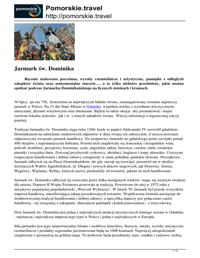 Pomorskie.travel http://pomorskie.travel Jarmark św. Dominika Ręcznie malowana porcelana, wyroby rzemieślnicze i artystyczne, pamiątki z odległych zakątków świata oraz sentymentalne starocie…, a to tylko niektóre przedmioty, jakie można spotkać podczas Jarmarku Dominikańskiego na licznych stoiskach i kramach. 30 lipca, po raz 756, koncertem na największym bębnie świata, zainaugurowany zostanie najstarszy jarmark w Polsce. Na 23 dni Stare Miasto w Gdańsku wypełnią stoiska z wyrobami artystycznymi, starociami, płytami winylowymi oraz ubraniami. Będzie to także okazja aby posmakować i kupić zarówno lokalne jedzenie, jak i te z innych zakątków świata. Wiecej informacji o tegorocznej edycji poniżej. Tradycja Jarmarku św. Dominika sięga roku 1260, kiedy to papież Aleksander IV zezwolił gdańskim Dominikanom na udzielanie studniowych odpustów w dniu święta ich założyciela. Z uroczystościami odpustowymi związano jarmark handlowy. Na sierpniowe Jarmarki do gdańskiego portu zawijało ponad 400 okrętów z najróżniejszymi dobrami. Pośród nich znajdowały się francuskie i hiszpańskie wina, jedwab, konfitury, przyprawy korzenne, cyna, angielskie sukna, bursztyn, czeskie szkło, toruńskie pierniki i rosyjskie futra. Zewsząd przybywali cyrkowcy, akrobaci, kuglarze i trupy aktorskie. Uroczyste rozpoczęcie handlowania i dobrej zabawy oznajmiały w samo południe gdańskie dzwony. Początkowo Jarmark odbywał się na Placu Dominikańskim, ale gdy zaczął się rozwijać, przeniósł się w okolice dzisiejszych Wałów Jagiellońskich, ul. Długiej i nowych placów targowych, jak Drzewny, Sienny, Węglowy, Wąchany, Rybny, których nazwy pochodziły od towarów, jakimi na nich handlowano. Jarmark św. Dominika odbywał się corocznie przez kilka następnych wieków, stając się ważnym świętem dla miasta. Dopiero II Wojna Światowa przerwała tę tradycję. Powrócono do niej w 1972 roku z inicjatywy popularnej popołudniówki „Wieczór Wybrzeża”. W latach 70. Jarmark był przede wszystkim imprezą handlową, umożliwiającą zakup poszukiwanych towarów. Współczesna formuła nawiązuje do średniowiecznej tradycji handlowania i dobrej zabawy, a specyfiką imprezy jest połączenie części handlowej - tej związanej z zakupami, zbieraniem pamiątek i kolekcjonowaniem - z rozrywkową. Dziś Jarmark św. Dominika jest jedną z największych atrakcji turystycznych letniego sezonu w Gdańsku - najstarszą i największą imprezą tego typu w Polsce i jedną z największych w Europie. Siłą jarmarku jest jego niepowtarzalny klimat i osobliwa atmosfera. Starocie, antyki, wyroby artystyczne, rzemieślnicze i produkty regionalne prezentowane będą na 1000 kramach. Najwięcej niespodzianek znajdziemy z pewnością na pchlim targu. Tu królować będą przedmioty stare, rzadkie i ciekawe: srebra, 1/2 Pomorskie.travel http://pomorskie.travel platery, wyroby z cyny, mosiądzu, żyrandole, lampy bufetowe, samowary, barometry, kominkowe zegary, stare szyldy i monety, a nawet kufle rezerwistów z okresu I wojny światowej. Choć tak na dobrą sprawę, wszystkie te skarby w pełnej krasie objawią się dopiero, kiedy jarmark ruszy. U artystów znajdziemy ręcznie malowane kupony jedwabiu, ręcznie szyte zabawki, ręcznie lepioną i toczoną na kole ceramikę i biżuterię najróżniejszej maści: ze srebra, bursztynu, miedzi, szkła, skóry, muszli, meteorytów, lnu, nici jedwabnych, filcu, lin żeglarskich i… siatki tytanowej. I będzie czym zapełniać domowe spiżarnie. Od pomorskich specjałów, przez wędzone ryby z jezior mazurskich, tradycyjne półgęski, domowe konfitury, aż po litewskie wędliny, turecką melasę i węgierskie langosze (pieczone na oleju placki podawane z czosnkiem i śmietaną). Zapraszamy na stronę organizatora. Daria Grabska 2/2 Powered by TCPDF (www.tcpdf.org)