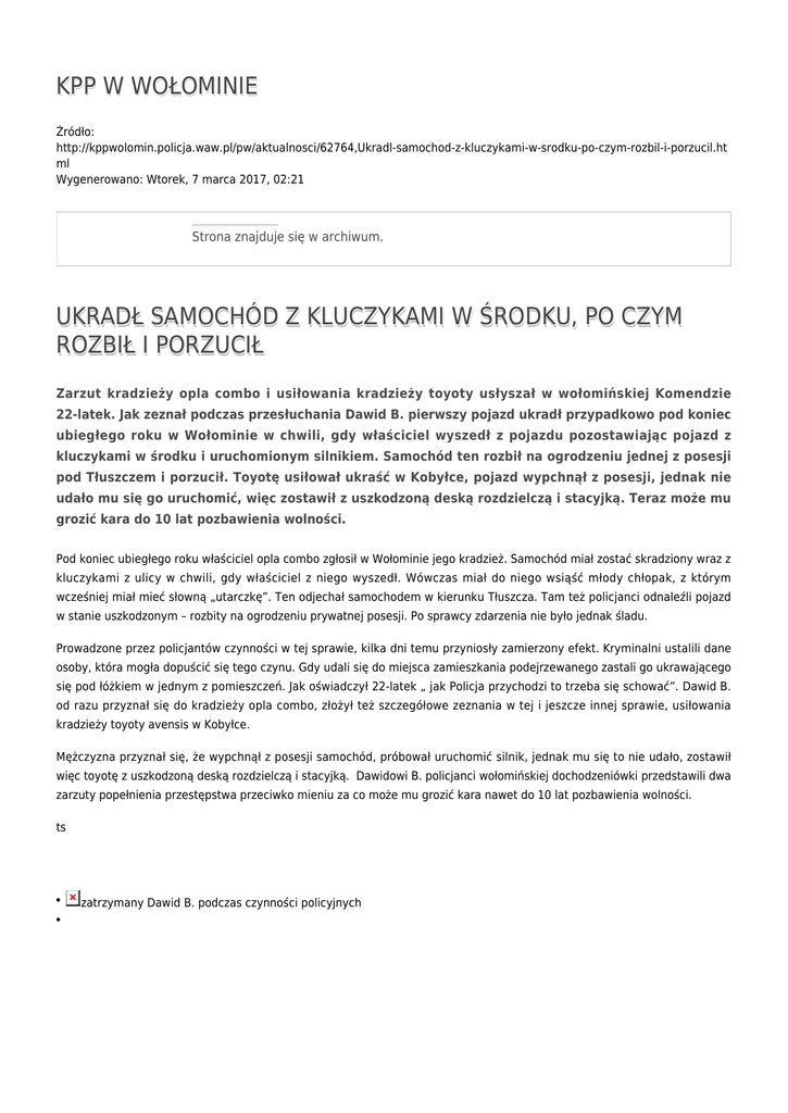 KPP W WOŁOMINIE Źródło: http://kppwolomin.policja.waw.pl/pw/aktualnosci/62764,Ukradl-samochod-z-kluczykami-w-srodku-po-czym-rozbil-i-porzucil.ht ml Wygenerowano: Wtorek, 7 marca 2017, 02:21 Strona znajduje się w archiwum. UKRADŁ SAMOCHÓD Z KLUCZYKAMI W ŚRODKU, PO CZYM ROZBIŁ I PORZUCIŁ Zarzut kradzieży opla combo i usiłowania kradzieży toyoty usłyszał w wołomińskiej Komendzie 22-latek. Jak zeznał podczas przesłuchania Dawid B. pierwszy pojazd ukradł przypadkowo pod koniec ubiegłego roku w Wołominie w chwili, gdy właściciel wyszedł z pojazdu pozostawiając pojazd z kluczykami w środku i uruchomionym silnikiem. Samochód ten rozbił na ogrodzeniu jednej z posesji pod Tłuszczem i porzucił. Toyotę usiłował ukraść w Kobyłce, pojazd wypchnął z posesji, jednak nie udało mu się go uruchomić, więc zostawił z uszkodzoną deską rozdzielczą i stacyjką. Teraz może mu grozić kara do 10 lat pozbawienia wolności. Pod koniec ubiegłego roku właściciel opla combo zgłosił w Wołominie jego kradzież. Samochód miał zostać skradziony wraz z kluczykami z ulicy w chwili, gdy właściciel z niego wyszedł. Wówczas miał do niego wsiąść młody chłopak, z którym wcześniej miał mieć słowną „utarczkę”. Ten odjechał samochodem w kierunku Tłuszcza. Tam też policjanci odnaleźli pojazd w stanie uszkodzonym – rozbity na ogrodzeniu prywatnej posesji. Po sprawcy zdarzenia nie było jednak śladu. Prowadzone przez policjantów czynności w tej sprawie, kilka dni temu przyniosły zamierzony efekt. Kryminalni ustalili dane osoby, która mogła dopuścić się tego czynu. Gdy udali się do miejsca zamieszkania podejrzewanego zastali go ukrawającego się pod łóżkiem w jednym z pomieszczeń. Jak oświadczył 22-latek „ jak Policja przychodzi to trzeba się schować”. Dawid B. od razu przyznał się do kradzieży opla combo, złożył też szczegółowe zeznania w tej i jeszcze innej sprawie, usiłowania kradzieży toyoty avensis w Kobyłce. Mężczyzna przyznał się, że wypchnął z posesji samochód, próbował uruchomić silnik, jednak mu się to nie udało, zostawił więc toyotę z uszkodzoną deską rozdzielczą i stacyjką. Dawidowi B. policjanci wołomińskiej dochodzeniówki przedstawili dwa zarzuty popełnienia przestępstwa przeciwko mieniu za co może mu grozić kara nawet do 10 lat pozbawienia wolności. ts ● ● zatrzymany Dawid B. podczas czynności policyjnych Ocena: 0/5 (0) Tweetnij