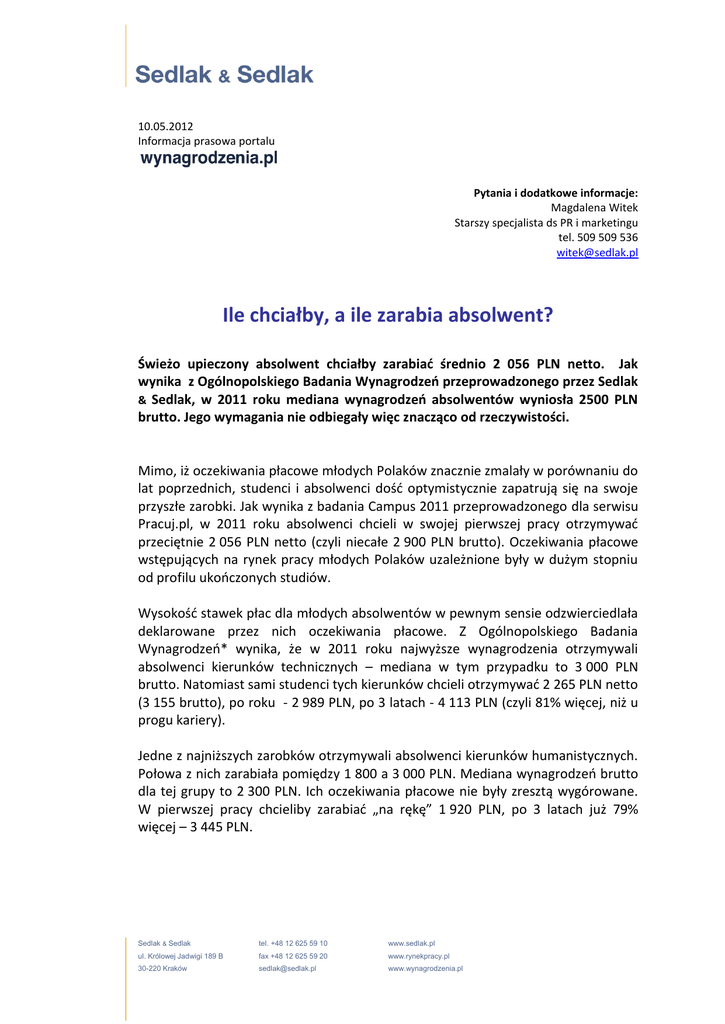10.05.2012 Informacja prasowa portalu Pytania i dodatkowe informacje: Magdalena Witek Starszy specjalista ds PR i marketingu tel. 509 509 536 [email protected] Ile chciałby, a ile zarabia absolwent? Świeżo upieczony absolwent chciałby zarabiać średnio 2 056 PLN netto. Jak wynika z Ogólnopolskiego Badania Wynagrodzeń przeprowadzonego przez Sedlak & Sedlak, w 2011 roku mediana wynagrodzeń absolwentów wyniosła 2500 PLN brutto. Jego wymagania nie odbiegały więc znacząco od rzeczywistości. Mimo, iż oczekiwania płacowe młodych Polaków znacznie zmalały w porównaniu do lat poprzednich, studenci i absolwenci dość optymistycznie zapatrują się na swoje przyszłe zarobki. Jak wynika z badania Campus 2011 przeprowadzonego dla serwisu Pracuj.pl, w 2011 roku absolwenci chcieli w swojej pierwszej pracy otrzymywać przeciętnie 2 056 PLN netto (czyli niecałe 2 900 PLN brutto). Oczekiwania płacowe wstępujących na rynek pracy młodych Polaków uzależnione były w dużym stopniu od profilu ukończonych studiów. Wysokość stawek płac dla młodych absolwentów w pewnym sensie odzwierciedlała deklarowane przez nich oczekiwania płacowe. Z Ogólnopolskiego Badania Wynagrodzeń* wynika, że w 2011 roku najwyższe wynagrodzenia otrzymywali absolwenci kierunków technicznych – mediana w tym przypadku to 3 000 PLN brutto. Natomiast sami studenci tych kierunków chcieli otrzymywać 2 265 PLN netto (3 155 brutto), po roku - 2 989 PLN, po 3 latach - 4 113 PLN (czyli 81% więcej, niż u progu kariery). Jedne z najniższych zarobków otrzymywali absolwenci kierunków humanistycznych. Połowa z nich zarabiała pomiędzy 1 800 a 3 000 PLN. Mediana wynagrodzeń brutto dla tej grupy to 2 300 PLN. Ich oczekiwania płacowe nie były zresztą wygórowane. W pierwszej pracy chcieliby zarabiać „na rękę” 1 920 PLN, po 3 latach już 79% więcej – 3 445 PLN. Sedlak & Sedlak tel. +48 12 625 59 10 www.sedlak.pl ul. Królowej Jadwigi 189 B fax +48 12 625 59 20 www.rynekpracy.pl 30-220 Kraków [email protected] www.wynagrodzenia.pl Czy warto więc studiować „modne kierunki”? - Lista najpopularniejszych kierunków studiów pozwala opisać strukturę podaży absolwentów na rynku pracy. Nie daje natomiast żadnej informacji o popycie na konkretne kwalifikacje. Mówiąc wprost: modny kierunek nie zapewnia dobrze płatnej pracy – ocenia Gabriela Jabłońska z portalu rynekpracy.pl. – Poza ukończonym kierunkiem studiów, bardzo istotnym czynnikiem wpływającym na zarobki absolwentów była branża zatrudnienia – ocenia Teresa Hantz z firmy Sedlak & Sedlak. W 2011 roku najwyższe wynagrodzenia otrzymywali absolwenci zatrudnieni w telekomunikacji i IT – 3 000 PLN brutto. Nie bez znaczenia była także wielkość firmy, w jakiej zatrudnił się absolwent lub absolwentka. Generalnie, im większe przedsiębiorstwo, tym potencjalnie wyższe zarobki. Pensje rosną. Zobacz czy twoje też! Weź udział w Ogólnopolskim Badaniu Wynagrodzeń i porównaj swoje zarobki z innymi. Wypełnij ankietę! * Ogólnopolskie Badanie Wynagrodzeń to największe w Polsce, niepubliczne badanie płac. W badaniu dominują ludzie młodzi (68,1% ma nie więcej niż 35 lat) oraz osoby z wykształceniem wyższym (77,2%). Sprawia to, że respondenci zajmują bardziej specjalistyczne stanowiska, a ich wynagrodzenia są wyższe niż przeciętnych osób. Dane liczbowe prezentowane są głównie za pomocą mediany, gdyż miara ta lepiej niż średnia charakteryzuje badaną populację. Mediana jest wartością dzielącą badaną populację na pół. Redakcja portalu wynagrodzenia.pl Więcej informacji prasowych portalu wynagrodzenia.pl znajdą Państwo w zakładce Dla mediów. Wszystko o wynagrodzeniach. Profesjonalna wiedza dla pracodawców i pracowników. Raporty, analizy, opracowania. Niezależne badania wynagrodzeń w Polsce. Sedlak & Sedlak tel. +48 12 625 59 10 www.sedlak.pl ul. Królowej Jadwigi 189 B fax +48 12 625 59 20 www.rynekpracy.pl 30-220 Kraków [email protected] www.wynagrodzenia.pl