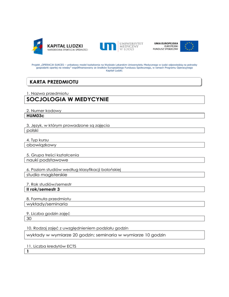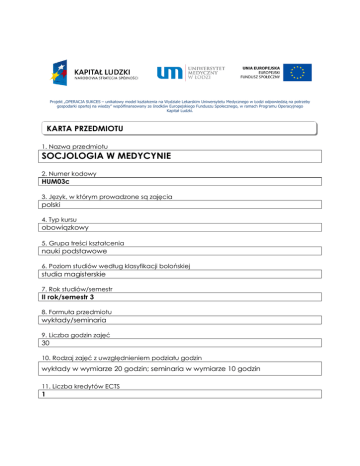 Projekt „OPERACJA SUKCES – unikatowy model kształcenia na Wydziale Lekarskim Uniwersytetu Medycznego w Łodzi odpowiedzią na potrzeby gospodarki opartej na wiedzy” współfinansowany ze środków Europejskiego Funduszu Społecznego, w ramach Programu Operacyjnego Kapitał Ludzki. KARTA PRZEDMIOTU 1. Nazwa przedmiotu SOCJOLOGIA W MEDYCYNIE 2. Numer kodowy HUM03c 3. Język, w którym prowadzone są zajęcia polski 4. Typ kursu obowiązkowy 5. Grupa treści kształcenia nauki podstawowe 6. Poziom studiów według klasyfikacji bolońskiej studia magisterskie 7. Rok studiów/semestr II rok/semestr 3 8. Formuła przedmiotu wykłady/seminaria 9. Liczba godzin zajęć 30 10. Rodzaj zajęć z uwzględnieniem podziału godzin wykłady w wymiarze 20 godzin; seminaria w wymiarze 10 godzin 11. Liczba kredytów ECTS 1 12. Jednostka dydaktyczna prowadząca przedmiot Zakład Socjologii Katedra Nauk Humanistycznych 13. Imię i nazwisko osoby egzaminującej lub zaliczającej przedmiot dr hab. n. hum. prof. nadzw. Mieczysław Gałuszka 14. Imię i nazwisko osoby prowadzącej wykłady dr hab. n. hum. prof. nadzw. Mieczysław Gałuszka 15. Osoby prowadzące zajęcia dr hab. n. hum. prof. nadzw. Mieczysław Gałuszka, dr n. hum. Magdalena Wieczorkowska, mgr Dorota Jołkiewicz, mgr Bożena Walerjan 16. Wymagania wstępne i wymagania równoległe znajomość podstawowych problemów z zakresu przedmiotu „Wiedza o społeczeństwie” 17. Zaliczenie przedmiotu jest wymagane przed rozpoczęciem zajęć z: nie dotyczy 18. Cele i założenia nauczania przedmiotu Kształcenie w zakresie socjologii medycyny dotyczy rozumienia i wyjaśniania przyczyn procesów i zjawisk społecznych, gromadzenia, strukturalizowania i wykorzystywania informacji dla tworzenia diagnoz społecznych przydatnych w medycynie i opiece zdrowotnej, umiejętności społecznych i interpersonalnych takich jak np. praca w zespole, komunikowanie się z pacjentami i personelem medycznym, wsparcie społeczne, wrażliwość na potrzeby innych, umiejętność rozwiązywania konfliktów. Wiedza z zakresu socjologii medycyny stanowi komplementarny składnik wiedzy społecznej i medycznej niezbędnej dla wykonywania zawodu lekarza. Cele dotyczące wiedzy: • Zintegrowana znajomość wiedzy, teorii i praktyki socjologicznej przydatnej do analizy i interpretacji przemian współczesnego świata, zwłaszcza w zakresie medycyny i opieki zdrowotnej; • Opanowanie umiejętności łączenia wiedzy społecznej z wiedzą medyczną oraz konceptualizacji dyskursu biomedycznego z rozwijanym w naukach humanistycznych, dotyczącym postępu biotechnologicznego i rozwoju społeczeństwa opartego na wiedzy; • Większe rozumienie świata i człowieka, opanowanie kompendium wiedzy na temat istotnych zjawisk i procesów społecznych występujących we współczesnym świecie. Cele dotyczące umiejętności: • Opanowanie umiejętności podejmowania działań odpowiadających na potrzeby pozamedyczne pacjentów: posługiwania się pojęciami i językiem nauk społecznych do opisu zjawisk z zakresu zdrowia, choroby, niepełnosprawności, starzenia się i poprawy jakości życia; • Umiejętność interpretacji danych urzędowych dotyczących problemów systemu zdrowotnego oraz gromadzenia danych o środowisku społecznym w którym żyje pacjent i jego rodzina; • Umiejętność szukania różnych źródeł informacji społecznych i kulturowych przyczyniających się do wyjaśniania procesów zmiany w medycynie i opiece zdrowotnej. Cele dotyczące postaw: • Internalizacja wartości, wzorów i norm społecznych niezbędnych do realizacji zadań profesji lekarskiej w zmieniającym się świecie; • Przełamywanie barier w komunikowaniu społecznym i nabycie kompetencji w zakresie komunikacji interpersonalnej lekarza z pacjentem; • Rozwijanie etosu zawodowego i atrybutów profesji lekarskiej w zakresie wiedzy, umiejętności, kwalifikacji, jako celowych i systematycznych działań budujących kompetencje praktyczne do wykonywania zawodu. 19. Metody dydaktyczne Prezentacja multimedialna, praca grupowa, prezentacje indywidualne, studium przypadku, dyskusja moderowana, dyskusja panelowa. Podstawą pracy ze studentami na seminariach są wskazane do przeczytania teksty. 20. Wykaz literatury podstawowej i uzupełniającej Literatura podstawowa: − Wybrane elementy socjologii zdrowia i choroby. Tobiasz-Adamczyk B, Wyd. Uniwersytetu Jagiellońskiego, Kraków 2000; − Zdrowie i choroba. Wybrane problemy socjologii medycyny. Barański J, Piątkowski W, Oficyna Wydawnicza ATUT, Wrocławskie Wyd. Oświatowe, Wrocław 2002; − Socjologia: Płeć kulturowa i seksualność (rozdz. 5), Socjologia ciała – zdrowie, choroba i starzenie się (rozdz. 6), Rodziny (rozdz.7), Przestępczość i dewiacja (rozdz. 8). Giddens A, PWN, Warszawa, 2004. − Komunikowanie się lekarza z pacjentem. Barański J, Waszyński E., Steciwka A. (red.) , Wyd. ASTRUM, Wrocław 2000. Literatura uzupełniająca: − Medical Sociology. Cockerham WH, 9th Edition Pearson Hall, Upper Saddle River, New Jersey, 2004; − Zdrowie. Blaxter M, Wyd. Sic, Warszawa 2009; − Społeczne i kulturowe powinności medycyny. Tożsamość zawodowa i atrofia moralna. Gałuszka M, Wyd. WTN, Wrocław 2003; − Zdrowie i choroba w społeczeństwie ryzyka biomedycznego. Gałuszka M (red.), Wyd. Uniwersytetu Medycznego w Łodzi, Łódź 2008; − Patologie społeczne. Pospiszyl I, PWN, Warszawa 2008. 21. Forma i warunki zaliczenia przedmiotu, w tym zasady dopuszczenia do egzaminu Zaliczenie z oceną: test jednokrotnego wyboru obejmujący problematykę omawianą na wykładach i seminariach. Końcowa ocena z przedmiotu uwzględnia także aktywny udział studentów w zajęciach: przygotowanie referatów, prezentacja problemów, udział w dyskusji, aktywność studenta w wykonywaniu zadań grupowych, obecność na wykładach i ćwiczeniach. 22. Treści merytoryczne budujące wiedzę Wykłady: Socjologia zdrowia, choroby i medyc
