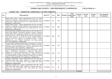 5 Wojskowy Szpital Kliniczny z Polikliniką – Samodzielny Publiczny Zakład Opieki Zdrowotnej w Krakowie Nr sprawy 50/5WSzKzP SP-ZOZ/2007 Prawo zamówień publicznych – Przetarg nieograniczony powyżej 137.000 euro ------------------------------------------------------------------------------------------------------------------------------------------------------- FORMULARZ CENOWY – OPIS PRZEDMIOTU ZAMÓWIENIA ZAŁĄCZNIK nr 1 PAKIET NR 1 – ODZIEŻ DLA PERSONELU SŁUŻBY ZDROWIA L.p. 1. 2. 3. 4. 5. 6. 7. Opis preparatu Płaszcz biały, męski – tkanina elanobawełna 67% PE, 33% BW; kołnierzyk, zapinanie na napy nierdzewne, kieszonka górna i dwie dolne, gram. 165g/m², kurczliwość 3-4%, temp. prania 60°. Szew pojedynczy z endlowaniem Płaszcz biały, damski – tkanina elanobawełna 67% PE, 33% BW; kołnierzyk, zapinanie na napy nierdzewne, kieszonka górna i dwie dolne, gram. 165g/m², kurczliwość 3-4%, temp. prania 60°. Szew pojedynczy z endlowaniem Garsonka lekarki, pielęgniarki tkanina poliester 65% bawełna 35%, kolor biały, błękitne wykończenie rękawów, kieszeni i dekoltu. Wykończenie pod szyją okrągłe z pęknięciami z przodu i lamówką, długość bluzy do ½ bioder, krótki rękaw. Kieszenie: jedna górna i dwie dolne. Zapinana na nierdzewne springi; spódnica błękitna, długość 60-70 cm, zapinana na nierdzewne springi i zamek błyskawiczny; gram. 180g/m², kurczliwość 3-4%, temp. prania 60°. Szew pojedynczy z endlowaniem Ubranie lekarza, tkanina elanobawełna 67% bawełna 33%; bluza i spodnie, kolor biały, długi rękaw, kołnierzyk, zapinanie na guziki, kieszonka górna i dwie dolne; gram. 165 g/m², kurczliwość 3-4%, temp. prania 60°. Szew pojedynczy z endlowaniem Garsonka pielęgniarki: tkanina poliester 65%, bawełna 35%; kolor biały z pistacjowymi lamówkami i kołnierzem, długi rękaw, długość do 1/2 bioder, kieszonka górna i dwie dolne, zapinana na nierdzewne springi. Spodnie: kolor pistacjowy, zapięcie na springi i zamek błyskawiczny, gumki na bokach, kurczliwość 3-4%, gram. 180g/ m², temp. prania 60°. Szew pojedynczy z endlowaniem Sukienka sanitariuszki, tkanina elanobawełna 67% PE, 33% BW; niebieska, krótki rękaw, stójka, zapinanie na springi nierdzewne; gram. 165 g/m², kurczliwość 3-4%, temp. prania 60°. Szew pojedynczy z endlowaniem Sukienka kuchenkowych, tkanina elanobawełna 67% PE, 33% BW; biała, krótki rękaw, stójka, zapinanie na springi nierdzewne; gram. 165 g/m², kurczliwość 3-4%, temp. prania 60°. Szew pojedynczy z endlowaniem Kod CPV J. m. Ilość 18111000-0 Szt. 200 18111000-0 Szt. 200 18111000-0 Kpl. 330 18111000-0 Kpl. 250 18111000-0 Kpl. 370 18111000-0 Szt. 80 18111000-0 Szt. 20 Cena Rozmiary jednostkowa Netto Stawka VAT RAZEM: 9 Wartość netto Wartość brutto Nazwa handlowa nr katalogowy 5 Wojskowy Szpital Kliniczny z Polikliniką – Samodzielny Publiczny Zakład Opieki Zdrowotnej w Krakowie Nr sprawy 50/5WSzKzP SP-ZOZ/2007 Prawo zamówień publicznych – Przetarg nieograniczony powyżej 137.000 euro ------------------------------------------------------------------------------------------------------------------------------------------------------.................................................................................................................... (podpis, pieczęć imienna upełnomocnionego przedstawiciela Wykonawcy) PAKIET NR 2 – ODZIEŻ ROBOCZA L.p. 1. 2. Opis preparatu Kod CPV Ubranie robocze – tkanina 100% bawełna, kolor granatowy, bluza robocza zapinana na guziki, długi rękaw kołnierzyk, kieszenie: górna i dwie dolne, spodnie ogrodniczki z dwiema kieszeniami z przodu i po jednej kieszeni bocznej na każdej nogawce na 18131000-6 wysokości kolan; zapięcie z tworzywa sztucznego, regulowane szelki, rozporek zapinany na guziki gram. 273g/m², kurczliwość 34%; temp. prania 60°.Szew pojedynczy z endlowaniem Ubranie kierowcy, sanitariusza, w kolorze czerwonym, spodnietkanina 35% elanobawełna, 65% poliester, gram. 195g/m², zapinanie standard, gumka do regulacji, dwie kieszenie boczne zapinane na rzep, taśma odblaskowa na nogawkach. Bluza na stójce, długi rękaw, trzy kieszenie zapinane na rzep, taśma odblaskowa, na prawej klapie eskulap. Kurtka ortalion, 100% poliester na stójce, kaptur chowany w stójce, rękaw długi z regulacją na rzep, trzy kieszenie zewnętrzne zapinane na zamek, plisa na rzep, taśma odblaskowa na przedramieniu, z tyłu eskulap, zasuwana kieszeń wewnętrzna na lewej piersi, kieszeń boczna ściągana sznurkiem zapinana na rzep. 18131000-6 Spodnie ortalion 100% poliester, kolor czerwony, zapinanie standard, gumka do regulacji, dwie kieszenie boczne zapinane na rzep, taśma odblaskowa na nogawkach. Kurtka z polaru, 100% poliester, 300g/m2, kolor czerwony, zapinana na suwak, ściągana na dole na gumie z regulacją; stójka, taśma odblaskowa na rękawie (przedramię), emblemat aesculap z przodu po lewej stronie. Czapka welurowa z daszkiem, regulacja na rzep, nad daszkiem eskulap. Koszulka polo zapinana na guziki, tkanina 30 % bawełna, 70 % elanobawełna. T – shirt, długi rękaw, nadruk biały eskulap, tkanina 100% bawełna, temp. prania 60 º J. m. Ilość Kpl. 65 Kpl 14 Cena Rozmiary jednostkowa netto Stawka VAT Wartość netto Wartość brutto Nazwa handlowa nr katalogowy RAZEM: .................................................................................................................... (podpis, pieczęć imienna upełnomocnionego przedstawiciela Wykonawcy) 10 5 Wojskowy Szpital Kliniczny z Polikliniką – Samodzielny Publiczny Zakład Opieki Zdrowotnej w Krakowie Nr sprawy 50/5WSzKzP SP-ZOZ/2007 Prawo zamówień publicznych – Przetarg nieograniczony powyżej 137.000 euro ------------------------------------------------------------------------------------------------------------------------------------------------------- PAKIET NR 3 – ODZIEŻ PERSONELU BLOKU OPERACYJNEGO L.p. 1. 2. 3. 4. 5. 6. 7. Opis preparat