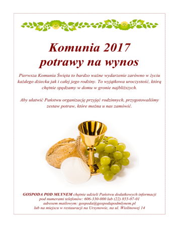Komunia 2017 potrawy na wynos Pierwsza Komunia Święta to bardzo ważne wydarzenie zarówno w życiu każdego dziecka jak i całej jego rodziny. To wyjątkowa uroczystość, którą chętnie spędzamy w domu w gronie najbliższych. Aby ułatwić Państwu organizację przyjęć rodzinnych, przygotowaliśmy zestaw potraw, które można u nas zamówić. GOSPODA POD MŁYNEM chętnie udzieli Państwu dodatkowych informacji pod numerami telefonów: 606-330-000 lub (22) 855-07-01 adresem mailowym: [email protected] lub na miejscu w restauracji na Ursynowie, na ul. Wiolinowej 14 MENU Bufet zimny • • • • Wędliny i mięsa pieczone ........................................................... Schab po warszawsku ................................................................. Wybór pasztetów ......................................................................... Tatar wołowy ............................................................................. 56 zł /półmisek (10 porcji) 65 zł /półmisek (10 porcji) 70 zł /półmisek (10 porcji) 122,50 zł /półmisek (10 porcji) • • • • • Indyk na musie z tuńczyka .......................................................... Indyk na musie z brzoskwiń z imbirem ....................................... Rolada z kurczaka z pistacjami .................................................. Galaretki z kurczaka (tymbaliki) ................................................ Pierś z kaczki na musie żurawinowym ....................................... 68 zł /półmisek (10 porcji) 68 zł /półmisek (10 porcji) 68 zł /półmisek (10 porcji) 45 zł /półmisek (10 porcji) 80 zł /półmisek (10 porcji) • • • • • • • • • • • Śledzie na 3 sposoby ................................................................... Śledź po polsku z cebulką w oleju .............................................. Tatar śledziowy ........................................................................... Filet z łososia w galarecie .......................................................... Tatar z łososia wędzonego ......................................................... Roladki z łososia wędzonego z kozim serem i kaparami ............ Sandacz w galarecie z chrzanem ................................................ Sandacz (lub łosoś) w galarecie z owocami morza .................... Rolada z sandacza i łososia w galarecie .................................... Węgorz wędzony na sałatce jajecznej ........................................ Ryby wędzone (pstrąg, łosoś, makrela, węgorz) ........................ 45 zł /półmisek (10 porcji) 35 zł /półmisek (10 porcji) 45 zł /półmisek (10 porcji) 70 zł /półmisek (10 porcji) 95 zł /półmisek (10 porcji) 65 zł /półmisek (10 porcji) 70 zł /półmisek (10 porcji) 105 zł /półmisek (10 porcji) 75 zł /półmisek (10 porcji) 120 zł /półmisek (10 porcji) 80 zł /półmisek (10 porcji) • • • • • Jajka z pastą jajeczną z łososiem, oliwką i rzodkiewką ............. Jajka faszerowane pieczarkami................................................... Jajka faszerowane musem chrzanowym z szynką ....................... Jajka faszerowane z łososiem wędzonym ................................... Jajka faszerowane tuńczykiem i kaparami ................................. 45 zł /półmisek (10 porcji) 48 zł /półmisek (10 porcji) 48 zł/półmisek (10 porcji) 55 zł/półmisek (10 porcji) 48 zł/półmisek (10 porcji) • • • • • • • • Sałatka jarzynowa ...................................................................... Sałatka śledziowa z jajkiem ........................................................ Sałatka ziemniaczana ................................................................. Sałatka po hawajsku z kurczakiem ............................................. Sałatka warstwowa z serem, kurczakiem i sosem czosnkowym .. Sałatka z cukinią, mozzarellą i pomidorkami cherry ................. Sałata z gruszką i serem dor blue w dressingu miodowym ........ Sałata z fetą i oliwkami w dressingu ziołowym .......................... 37 zł /miska (10 porcji) 37 zł /miska (10 porcji) 34 zł /miska (10 porcji) 37 zł /miska (10 porcji) 45 zł /miska (10 porcji) 45 zł /miska (10 porcji) 37 zł /miska (10 porcji) 37 zł /miska (10 porcji) GOSPODA POD MŁYNEM ul. Wiolinowa 14, 02-785 Warszawa tel. (22) 855-07-01, tel. kom. 606-330-000 e-mail: [email protected] www.gospodapodmlynem.pl Nr konta: 03 1020 1169 0000 8102 0175 9752 Bufet gorący • • • • • • • • Rosół z makaronem .......................................................................................... Tradycyjna zupa pomidorowa z makaronem ................................................... Staropolski żur z kiełbasą i jakiem .................................................................. Krem z pomidorów ........................................................................................... Zupa borowikowa ............................................................................................ Zupa kurkowa .................................................................................................. Barszczyk czerwony z pasztecikiem z kapustą i grzybami ............................... Zupa gulaszowa ............................................................................................... 8 zł /1 porcja 10 zł /1 porcja 10 zł /1 porcja 10 zł /1 porcja 10 zł /1 porcja 10 zł /1 porcja 10 zł /1 porcja 10 zł /1 porcja • • 18,50 zł /1 porcja • • • • • • • • • • • • • • • • Pierś z kurczaka w sosie kurkowym ................................................................. Roladki z kurczaka z suszonymi pomidorami i serem pleśniowym w sosie tymiankowym ................................................................................................... Pierś z kurczka faszerowan grillowanymi warzywami