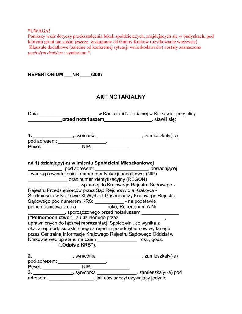 Poniższy wzór dotyczy przekształcenia lokali spółdzielczych, znajdujących się w budynkach, pod