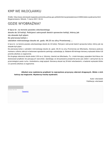 KMP WE WŁOCŁAWKU Źródło: http://www.wloclawek.kujawsko-pomorska.policja.gov.pl/kb4/informacje/wiadomosci/13000,Gdzie-wyobraznia.html Wygenerowano: Wtorek, 7 marca 2017, 02:21 GDZIE WYOBRAŹNIA? 6 lipca br. na terenie powiatu włocławskiego doszło do 10 kolizji. Policjanci zatrzymali dwóch sprawców kolizji, którzy jak się okazało byli pijani. Do pierwszej kolizji z udziałem nietrzeźwego doszło ok. godz. 00.25 na ulicy Promiennej ... 6 lipca br. na terenie powiatu włocławskiego doszło do 10 kolizji. Policjanci zatrzymali dwóch sprawców kolizji, którzy jak się okazało byli pijani. Do pierwszej kolizji z udziałem nietrzeźwego doszło ok. godz. 00.25 na ulicy Promiennej we Włocławku. Kierowca podczas manewru cofania uderzył w betonowe ogrodzenie parkingu uszkadzając je. Badanie 60-letniego kierowcy wykazało blisko 0,8 promila alkoholu w organizmie. Do drugiego zdarzenia doszło około 3:30 na ul. Wroniej, również we Włocławku. Tu z kolei kierujący pojazdem ford fokus nie dostosował prędkości do panujących warunków. Zjeżdżając ze skrzyżowania przejechał przez pas zieleni i zatrzymał się na przeciwległym pasie ruchu. Uszkodzeniu uległ pojazd. Kierowcą okazał się 20-letni włocławianin, a badanie wykazało blisko 2,5 promila alkoholu w organizmie. Alkohol oraz nadmierna prędkość to najczęstsze przyczyny zdarzeń drogowych. Wiele z nich kończy się tragicznie. Wystarczy trochę wyobraźni. Autor: wloclawek Publikacja: wloclawek Ocena: 0/5 (0) Tweetnij