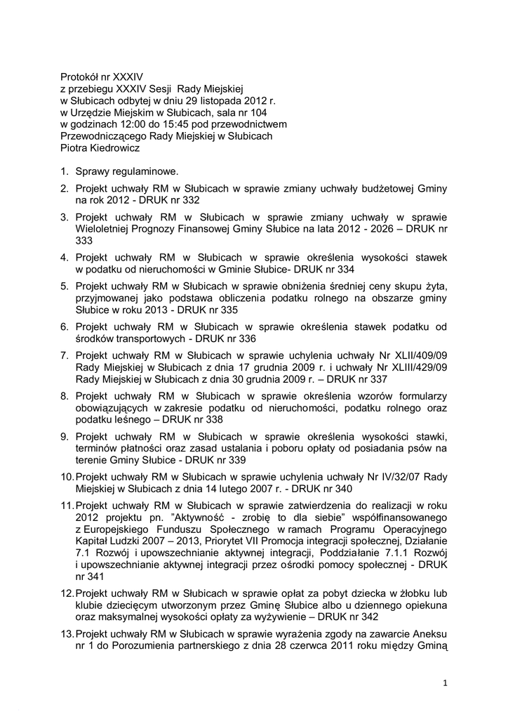 Protokół nr XXXIV z przebiegu XXXIV Sesji Rady Miejskiej w Słubicach odbytej w dniu 29 listopada 2012 r. w Urzędzie Miejskim w Słubicach, sala nr 104 w godzinach 12:00 do 15:45 pod przewodnictwem Przewodniczącego Rady Miejskiej w Słubicach Piotra Kiedrowicz 1. Sprawy regulaminowe. 2. Projekt uchwały RM w Słubicach w sprawie zmiany uchwały budżetowej Gminy na rok 2012 - DRUK nr 332 3. Projekt uchwały RM w Słubicach w sprawie zmiany uchwały w sprawie Wieloletniej Prognozy Finansowej Gminy Słubice na lata 2012 - 2026 – DRUK nr 333 4. Projekt uchwały RM w Słubicach w sprawie określenia wysokości stawek w podatku od nieruchomości w Gminie Słubice- DRUK nr 334 5. Projekt uchwały RM w Słubicach w sprawie obniżenia średniej ceny skupu żyta, przyjmowanej jako podstawa obliczenia podatku rolnego na obszarze gminy Słubice w roku 2013 - DRUK nr 335 6. Projekt uchwały RM w Słubicach w sprawie określenia stawek podatku od środków transportowych - DRUK nr 336 7. Projekt uchwały RM w Słubicach w sprawie uchylenia uchwały Nr XLII/409/09 Rady Miejskiej w Słubicach z dnia 17 grudnia 2009 r. i uchwały Nr XLIII/429/09 Rady Miejskiej w Słubicach z dnia 30 grudnia 2009 r. – DRUK nr 337 8. Projekt uchwały RM w Słubicach w sprawie określenia wzorów formularzy obowiązujących w zakresie podatku od nieruchomości, podatku rolnego oraz podatku leśnego – DRUK nr 338 9. Projekt uchwały RM w Słubicach w sprawie określenia wysokości stawki, terminów płatności oraz zasad ustalania i poboru opłaty od posiadania psów na terenie Gminy Słubice - DRUK nr 339 10. Projekt uchwały RM w Słubicach w sprawie uchylenia uchwały Nr IV/32/07 Rady Miejskiej w Słubicach z dnia 14 lutego 2007 r. - DRUK nr 340 11. Projekt uchwały RM w Słubicach w sprawie zatwierdzenia do realizacji w roku 2012 projektu pn. ”Aktywność - zrobię to dla siebie” współfinansowanego z Europejskiego Funduszu Społecznego w ramach Programu Operacyjnego Kapitał Ludzki 2007 – 2013, Priorytet VII Promocja integracji społecznej, Działanie 7.1 Rozwój i upowszechnianie aktywnej integracji, Poddziałanie 7.1.1 Rozwój i upowszechnianie aktywnej integracji przez ośrodki pomocy społecznej - DRUK nr 341 12. Projekt uchwały RM w Słubicach w sprawie opłat za pobyt dziecka w żłobku lub klubie dziecięcym utworzonym przez Gminę Słubice albo u dziennego opiekuna oraz maksymalnej wysokości opłaty za wyżywienie – DRUK nr 342 13. Projekt uchwały RM w Słubicach w sprawie wyrażenia zgody na zawarcie Aneksu nr 1 do Porozumienia partnerskiego z dnia 28 czerwca 2011 roku między Gminą 1 Słubice (Rzeczpospolita Polska) a Miastem Frankfurt nad Odrą (Republika Federalna Niemiec) w ramach Programu Operacyjnego Współpracy Transgranicznej Polska (Województwo Lubuskie) –Brandenburgia 2007-2013 na realizację projektu nr WTBR.01.03.00-52-010/09 pt. Wzmocnienie międzygminnej współpracy w Europejskim Dwumieście Słubice-Frankfurt nad Odrą oraz stworzenie polsko-niemieckiego Centrum Kompetencji i Kooperacji (K&K) jako wzoru nowej generacji współpracy transgranicznej oraz upoważnienia Burmistrza do jego podpisania – Druk nr 343 14. Projekt uchwały RM w Słubicach w sprawie nadania Honorowych Wyróżnień Gminy Słubice - DRUK nr 344 15. Projekt uchwały RM w Słubicach w sprawie nadania Honorowych Wyróżnień Gminy Słubice – DRUK nr 345 16. Projekt uchwały RM w Słubicach w sprawie przyjęcia Rocznego Programu Współpracy Gminy Słubice z organizacjami pozarządowymi, podmiotami prowadzącymi działalność pożytku publicznego i stowarzyszeniami jednostek samorządu terytorialnego- DRUK nr 346 17. Projekt uchwały RM w Słubicach w sprawie mieszkaniowego w Słubicach – DRUK nr 347 nadania nazwy osiedla 18. Projekt uchwały RM w Słubicach w sprawie wyrażenia zgody na nabycie nieruchomości w drodze zamiany - DRUK nr 348 19. Projekt uchwały RM w Słubicach w sprawie wyrażenia zgody na zawarcie kolejnych umów dzierżaw na nieruchomości gminne – DRUK nr 349. 20. Projekt uchwały RM w Słubicach o przystąpieniu do sporządzenia zmiany studium uwarunkowań i kierunków zagospodarowania przestrzennego miasta i gminy Słubice - DRUK nr 350 21. Projekt uchwały RM w Słubicach w sprawie zatwierdzenia taryfy za zbiorowe zaopatrzenie w wodę i zbiorowe odprowadzenie ścieków na rok 2013- DRUK nr 351 22. Projekt uchwały RM w Słubicach w sprawie udzielenia odpowiedzi na skargę wniesioną do Wojewódzkiego Sądu Administracyjnego w Gorzowie Wlkp. na uchwałę Rady Miejskiej w Słubicach z dnia 27 września 2012r. nr XXX/240/2012 – DRUK nr 352 23. Projekt uchwały RM w Słubicach w sprawie wyrażenia poparcia dla uchwały Rady Miejskiej Inowrocławia w sprawie skierowania do Trybunału Konstytucyjnego wniosku o stwierdzenie niezgodności z Konstytucją Rzeczypospolitej Polskiej przepisów ustawy o utrzymaniu czystości i porządku w gminach- DRUK nr 353 . 24. Projekt uchwały RM w Słubicach w sprawie uchwalenia Regulaminu utrzymania czystości i porządku na terenie Gminy Słubice- DRUK nr 354 25. Projekt uchwały RM w Słubicach w sprawie metody ustalenia opłaty za gospodarowanie odpadami komunalnymi oraz stawki op łaty - DRUK nr 355 26. Projekt uchwały RM w Słubicach w sprawie terminu, częstotliwości i trybu uiszczania opłat za gospodarowanie odpadami komunalnymi - DRUK nr 356 2 27. Projekt uchwały RM w Słubicach w sprawie wzoru deklaracji o wysokości opłaty za gospodarowanie odpadami komunalnymi składanej przez właścicieli nieruchomości – DRUK nr 357 28. Projekt uchwały RM w Słubicach w sprawie górnych stawek opłat ponoszonych przez właścicieli nieruchomości za usługi w zakresie pozbywania się zebranych na terenie nieruchomości odpadów komunalnych oraz nieczystości ciekłych DRUK nr 358 29. Projekt uchwały RM w Słubicach w sprawie szczegółowego sposobu i zakresu świadczenia usług w zakresie odbierania odpadów komunalnych od właścicie