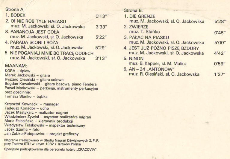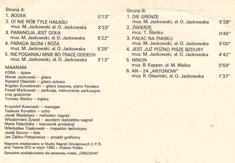 StronaA: 1.BODEK 0'13" 2. O! NIEROBTYLEHALASU muz.M. Jackowskist.O.Jackowska 3,33B. PARANOJA JESTGOt.A muz.M. Jackowski, sl.O.Jackowska S'22" 4. PARADAST.ONI I ROZA muz.M. Jackowski,sl.O.Jackowska S'29" 5. NtEPOGANTAJ MNIEBOTRACE ODDECH muz.M. Jackowski, sl.O.Jackowska 3'13MAANAM: KORA- Spiew MarekJackowski* gitara RyszardOlesifiski- gitarasolowa - gitarabasowa,pianoFendera BogdanKowalewski PawetMarkowski- perkusja,instrumenty perkusyjne orazgo5cinnie: TomaszStafiko- trqbka KrzysztofKownacki- manager TadeuszKonador- ucho JacekMastykarz- realizatornagraf WlodzimierzZywiol- asystentrealizatdranagrafi - kierownikprodukcji MariaFalacifiska - inspektorteChniczny WladystawTr:askowski JacekSzumc- foto - projektgraficzny Jan Zabko.Potopowicz Nagraniezrealizowanow Studiu Nagrafi D2wigkowychZ.p.R, przy TeatrzeSTU w lutym 1982 r. Krak6w Polbka Specjalnepodziqkowaniadla personeluhotelu,,CRACOVIA" StrcrnaB: 1 . D I EG R E N Z E muz.M. Jackowski,sl. O.Jackowska 2. ZWTERZE muz.T. Stafiko 3. PAI.ACNA PIASKU muz.M. Jackowski, sl.O.Jackowska 4. JESTJUZ PoZNOPISZEBZDURY muz.M. Jackowski, sl.O.Jackowska 5. NINON muz.B.Kapper,sl.M. Malicz 6. AN - 24 ,,ANTONOW" muz.R.Olesiriski, sl.O.Jackowska 5',28" o'45" 5',oo" 4'42" o'59" 1',37"