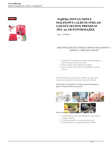 www.abfoto.pl Aparaty fotograficzne cyfrowe i kompaktowe FujiFilm INSTAX MINI 8 MALINOWY+ALBUM+WKŁAD 1x20 SZT+KUPON PREMIUM -50% na AB FOTOKSIĄŻKĘ Cena: 359.00 zł BOX ŚWIĄTECZNY INSTAX MINI 8 MALINOWY + ALBUM + WKŁAD 1x20 SZT Atrakcyjny i kompaktowy korpus aparatu dostępny w pięciu wersjach kolorystycznych! Prosta obsługa i natychmiastowe zdjęcia Łatwo możesz robić zdjęcia wyróżniające się jasną tonacją Aparat fotograficzny, który daje radność i emocje, jakie towarzyszą natychmiastowemu powstawaniu odbitek Atrakcyjny i kompaktowy korpus aparatu dostępny w pięciu wersjach kolorystycznych! Prosta obsługa i natychmiastowe odbitki 1. (1) Naciśnij przycisk obok obiektywu, aby włączyć zasilanie aparatu. 2. (2) Ustaw pokrętło w świecącej się pozycji. 3. (3)Zrób zdjęcie i uzyskaj natychmiast odbitki. 1/2 www.abfoto.pl Aparaty fotograficzne cyfrowe i kompaktowe Pokrętło regulacji jasności Aparat instax mini 8 automatycznie określa najlepszy poziom jasności dla zrobienia zdjęcia i informuje użytkownika o odpowiednim ustawieniu poprzez zaświecenie lampki. Obróć pokrętło regulacji jasności do pozycji świecącej się lampki. Możesz łatwo robić zdjęcia o jasnej tonacji. Ustawienie pokrętła regulacji jasności na znak trybu jasnej tonacji pozwoli na uzyskiwanie zdjęć, które będą charakteryzowały się miękkim odwzorowaniem obrazu. 2/2 Powered by TCPDF (www.tcpdf.org)