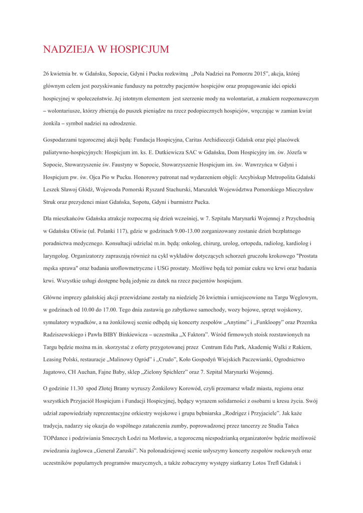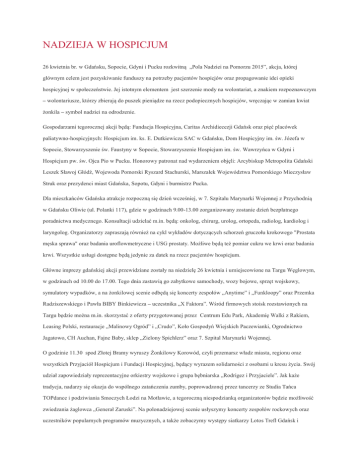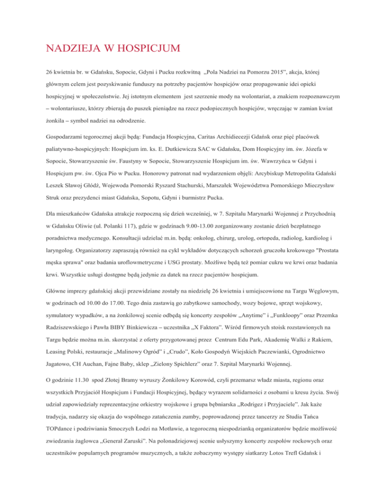 NADZIEJA W HOSPICJUM ziei, fundacja hospicyjna pola nadziei n 26 kwietnia br. w Gdańsku, Sopocie, Gdyni i Pucku rozkwitną „Pola Nadziei na Pomorzu 2015”, akcja, której głównym celem jest pozyskiwanie funduszy na potrzeby pacjentów hospicjów oraz propagowanie idei opieki hospicyjnej w społeczeństwie. Jej istotnym elementem jest szerzenie mody na wolontariat, a znakiem rozpoznawczym – wolontariusze, którzy zbierają do puszek pieniądze na rzecz podopiecznych hospicjów, wręczając w zamian kwiat żonkila – symbol nadziei na odrodzenie. Gospodarzami tegorocznej akcji będą: Fundacja Hospicyjna, Caritas Archidiecezji Gdańsk oraz pięć placówek paliatywno-hospicyjnych: Hospicjum im. ks. E. Dutkiewicza SAC w Gdańsku, Dom Hospicyjny im. św. Józefa w Sopocie, Stowarzyszenie św. Faustyny w Sopocie, Stowarzyszenie Hospicjum im. św. Wawrzyńca w Gdyni i Hospicjum pw. św. Ojca Pio w Pucku. Honorowy patronat nad wydarzeniem objęli: Arcybiskup Metropolita Gdański Leszek Sławoj Głódź, Wojewoda Pomorski Ryszard Stachurski, Marszałek Województwa Pomorskiego Mieczysław Struk oraz prezydenci miast Gdańska, Sopotu, Gdyni i burmistrz Pucka. Dla mieszkańców Gdańska atrakcje rozpoczną się dzień wcześniej, w 7. Szpitalu Marynarki Wojennej z Przychodnią w Gdańsku Oliwie (ul. Polanki 117), gdzie w godzinach 9.00-13.00 zorganizowany zostanie dzień bezpłatnego poradnictwa medycznego. Konsultacji udzielać m.in. będą: onkolog, chirurg, urolog, ortopeda, radiolog, kardiolog i laryngolog. Organizatorzy zapraszają również na cykl wykładów dotyczących schorzeń gruczołu krokowego "Prostata męska sprawa" oraz badania uroflowmetryczne i USG prostaty. Możliwe będą też pomiar cukru we krwi oraz badania krwi. Wszystkie usługi dostępne będą jedynie za datek na rzecz pacjentów hospicjum. Główne imprezy gdańskiej akcji przewidziane zostały na niedzielę 26 kwietnia i umiejscowione na Targu Węglowym, w godzinach od 10.00 do 17.00. Tego dnia zastawią go zabytkowe samochody, wozy bojowe, sprzęt wojskowy, symulatory wypadków, a na żonkilowej scenie odbędą się koncerty zespołów „Anytime” i „Funkloopy” oraz Przemka Radziszewskiego i Pawła BIBY Binkiewicza – uczestnika „X Faktora”. Wśród firmowych stoisk rozstawionych na Targu będzie można m.in. skorzystać z oferty przygotowanej przez Centrum Edu Park, Akademię Walki z Rakiem, Leasing Polski, restauracje „Malinowy Ogród” i „Crudo”, Koło Gospodyń Wiejskich Paczewianki, Ogrodnictwo Jagatowo, CH Auchan, Fajne Baby, sklep „Zielony Spichlerz” oraz 7. Szpital Marynarki Wojennej. O godzinie 11.30 spod Złotej Bramy wyruszy Żonkilowy Korowód, czyli przemarsz władz miasta, regionu oraz wszystkich Przyjaciół Hospicjum i Fundacji Hospicyjnej, będący wyrazem solidarności z osobami u kresu życia. Swój udział zapowiedziały reprezentacyjne orkiestry wojskowe i grupa bębniarska „Rodrigez i Przyjaciele”. Jak każe tradycja, nadarzy się okazja do wspólnego zatańczenia zumby, poprowadzonej przez tancerzy ze Studia Tańca TOPdance i podziwiania Smoczych Łodzi na Motławie, a tegoroczną niespodzianką organizatorów będzie możliwość zwiedzania żaglowca „Generał Zaruski”. Na polonadziejowej scenie usłyszymy koncerty zespołów rockowych oraz uczestników popularnych programów muzycznych, a także zobaczymy występy siatkarzy Lotos Trefl Gdańsk i gdańskich Wikingów, czyli drużyny futbolu amerykańskiego. W Sopocie „Pola Nadziei” rozpoczną się o 13.00 żonkilowym pochodem ul. Monte Cassino (od kościoła św. Jerzego), z udziałem Władz Miasta oraz Pracowników Hospicjum, jego Przyjaciół i Wolontariuszy, który dotrze na Skwer Kuracyjny, gdzie odbywać się będą wszystkie przewidziane na ten dzień atrakcje. Na scenie wystąpią m.in.: zespół bębniarski „Kukakike”, Chór Sceny Muzycznej Gdańsk oraz Zespół Pieśni i Tańca UG „Jantar”. Gdynia zaprasza w kilka miejsc. W godzinach od 11.00 do 15.00 w okolice Skweru Arki Gdynia i Bulwaru Nadmorskiego, gdzie po przemarszu żonkilowej parady (od 11.30) w godzinach od 12.00 do 15.00 odbędzie się Festyn Rodzinny, pełen niespodzianek artystycznych oraz ciekawych propozycji dla najmłodszych. Warto zaznaczyć, że organizatorzy gdyńskiej odsłony Pól postanowili połączyć hospicyjne święto z dniem dawcy szpiku. Natomiast od 16.00 do 19.00 w Centrum Waterfront będzie grać muzyka... Wystąpią m.in. zespoły: „Gasp”, „Dry”, „Zespół z Ameryki”, studio wokalne „Joko” oraz zespół „Farba”. Puck w ramach obchodów „Pól Nadziei” przygotował tradycyjnie wspaniały koncert. Zaraz po Mszy św. o 10.30, mniej więcej godzinę później, rozpocznie się koncert „Wiosenne inspiracje Krystyny Gedzik”. Warto dodać, że z Pucka ruszy motocyklowa sztafeta, która podobnie jak przed rokiem, połączy miasta-gospodarzy hospicyjnej akcji. Na Polach Nadziei na Pomorzu znowu będzie się dziać. To trzeba zobaczyć! Tam trzeba być! PRZEKAŻ 1% PODATKU UŚMIECH DZIECKA 2015 FUNDACJA HOSPICYJNA Konto 72 1540 1098 2001 5562 4727 0001 KRS 0000 201 002 KSIĘGARNIA