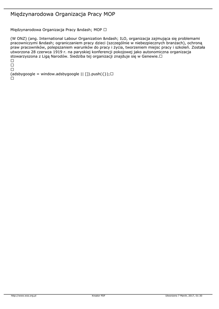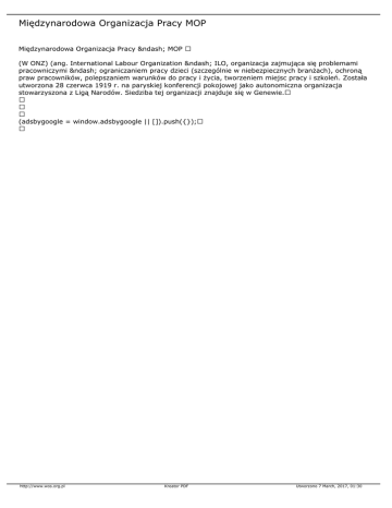 Międzynarodowa Organizacja Pracy – MOP (W ONZ) (ang. International Labour Organization – ILO, organizacja zajmująca się problemami