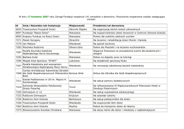 W dniu 17 kwietnia 2007 roku Zarząd Fundacji rozpatrzył 141 wniosków o darowizny. Pozytywnie rozpatrzone zostały następujące wnioski: Id Miejscowość Przedmiot/cel darowizny 6833 Towarzystwo Przyjaciół Dzieci Oborniki Śląskie Na organizację letnich kolonii zdrowotnych 6957 Fundacja "Nasze Dzieci" Warszawa Na wyjazd kolonijny dzieci leczonych w Centrum Zdrowia Dziecka 6993 Krajowy Fundusz na Rzecz Dzieci Warszawa Pomoc dla wybitnie zdolnych uczniów 7271 Marek Szczęsny Zbrachlin Na leczenie i rehabilitację dzieci Moniki i Daniela 7279 Jan Makson Włocławek Na aparat słuchowy 7283 Placówka Rodzinna Oliwna Góra Paliwo dla Placówki i na leczenie wychowanków Włocławek Wsparcie finansowe na prowadzenie kuchni dla bezdomnych i ubogich 7292 Barbara Kuliś Warszawa Paliwo na dojazdy syna na treningi 7295 Miejski Klub Sportowy "START" Lubraniec Na działalność sportową Klubu 7287 7307 Imię i Nazwisko lub Instytucja Parafia Rzymsko-Katolicka Najświętszego Serca Jezusowego Parafia Katedralna pod wezwaniem Włocławek Wniebowzięcia Najświętszej Maryi Panny Caritas Archidiecezji Katowickiej Ośrodek 7308 dla Osób Niepełnosprawnych Miłosierdzie Borowa Wieś BoŜe Na renowację zabytkowej bazyliki katedralnej Paliwo dla Ośrodka dla Osób Niepełnosprawnych 7311 Szkoła Podstawowa nr 20 im. Majora H. Sucharskiego Włocławek Na zakup pomocy dydaktycznych 7319 Komenda Wojewódzka Państwowej StraŜy PoŜarnej Toruń Na refinansowanie XI Międzynarodowych Mistrzostw Polski w Dwuboju PoŜarniczym 7325 Gimnazjum nr 12 Włocławek Na zakup wyposaŜenia edukacyjnego 7333 Publiczne Gimnazjum Krojczyn Na sztandar szkolny 7335 Rodzinny Dom Dziecka Bartoszyce Na zakup podręczników dla dzieci 7336 Towarzystwo Przyjaciół Dzieci Włocławek Na wypoczynek letni dzieci 7363 Rodzinny Dom Dziecka Paulina Paliwo do transportu dzieci do lekarzy 7373 Stowarzyszenie Societas Christiana Warszawa Na obozy letnie dla dzieci i młodzieŜy z najbiedniejszych środowisk 7388 Kamila Król Lublin Na pomoc dla rodziny zmarłego pracownika stacji paliw 7399 Harcerska Grupa Ratownicza Starachowice Defibrylator 7405 Beata Grekowicz Szczecin Na rehabilitację niewidomych córek Kamili i Jagody Kraków Paliwo na dowóz wychowanków do szkół i na zajęcia pozalekcyjne Węgorzewo Dofinansowanie XII Międzynarodowego Festiwalu Dziecięcych Zespołów Folklorystycznych Mniejszości Narodowych. 7406 Rodzinny Dom Dziecka Towarzystwa Przyjaciół Dzieci Stowarzyszenie Integracji i Rozwoju 7409 Kulturalnego Mniejszości Narodowych w Polsce "Czeremosz"