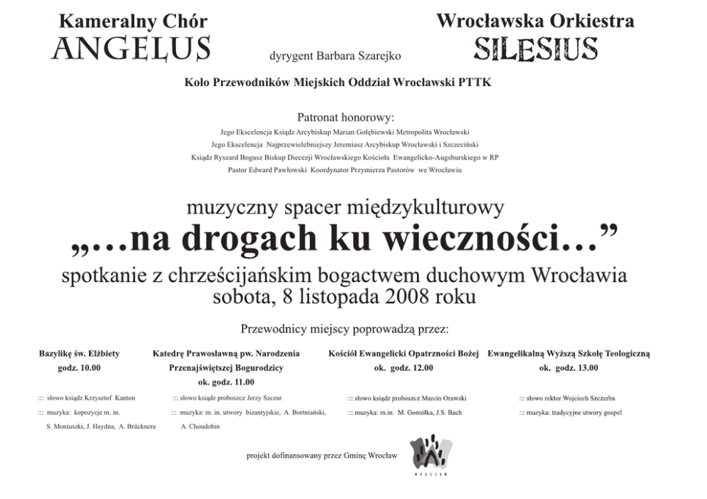 dyrygent Barbara Szarejko Ko³o Przewodników Miejskich Oddzia³ Wroc³awski PTTK Patronat honorowy: Jego Ekscelencja Ksi¹dz Arcybiskup Marian Go³êbiewski Metropolita Wroc³awski Jego Ekscelencja Najprzewielebniejszy Jeremiasz Arcybiskup Wroc³awski i Szczeciñski Ksi¹dz Ryszard Bogusz Biskup Diecezji Wroc³awskiego Koœcio³a Ewangelicko-Augsburskiego w RP Pastor Edward Paw³owski Koordynator Przymierza Pastorów we Wroc³awiu ::: s³owo ksi¹dz Krzysztof Kanton ::: s³owo ksi¹dz proboszcz Jerzy Szczur ::: muzyka: kopozycje m. in. ::: muzyka: m. in. utwory bizantyjskie, A. Bortniañski, S. Moniuszki, J. Haydna, A. Brücknera A. Choudobin dyrygent Barbara Szarejko Ko³o Przewodników Miejskich Oddzia³ Wroc³awski PTTK Patronat honorowy: Jego Ekscelencja Ksi¹dz Arcybiskup Marian Go³êbiewski Metropolita Wroc³awski Jego Ekscelencja Najprzewielebniejszy Jeremiasz Arcybiskup Wroc³awski i Szczeciñski Ksi¹dz Ryszard Bogusz Biskup Diecezji Wroc³awskiego Koœcio³a Ewangelicko-Augsburskiego w RP Pastor Edward Paw³owski Koordynator Przymierza Pastorów we Wroc³awiu muzyczny spacer miêdzykulturowy „…na drogach ku wiecznoœci…” spotkanie z chrzeœcijañskim bogactwem duchowym Wroc³awia sobota, 8 listopada 2008 roku Przewodnicy miejscy poprowadz¹ przez: Bazylikê œw. El¿biety Katedrê Prawos³awn¹ pw. Narodzenia godz. 10.00 Przenajœwiêtszej Bogurodzicy Koœció³ Ewangelicki Opatrznoœci Bo¿ej Ewangelikaln¹ Wy¿sz¹ Szko³ê Teologiczn¹ ok. godz. 12.00 ok. godz. 13.00 ok. godz. 11.00 ::: s³owo ksi¹dz Krzysztof Kanton ::: s³owo ksi¹dz proboszcz Jerzy Szczur ::: s³owo ksi¹dz proboszcz Marcin Orawski ::: s³owo rektor Wojciech Szczerba ::: muzyka: kopozycje m. in. ::: muzyka: m. in. utwory bizantyjskie, A. Bortniañski, ::: muzyka: m.in. M. Gomó³ka, J.S. Bach ::: muzyka: tradycyjne utwory gospel S. Moniuszki, J. Haydna, A. Brücknera A. Choudobin projekt dofinansowany przez Gminê Wroc³aw