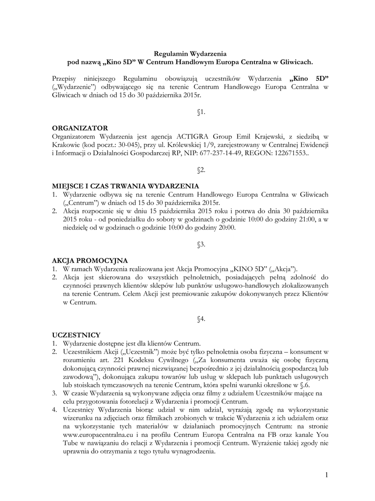 Regulamin Wydarzenia pod nazwą „Kino 5D” W Centrum Handlowym Europa Centralna w Gliwicach. Przepisy niniejszego Regulaminu obowiązują uczestników Wydarzenia „Kino 5D” („Wydarzenie”) odbywającego się na terenie Centrum Handlowego Europa Centralna w Gliwicach w dniach od 15 do 30 października 2015r. §1. ORGANIZATOR Organizatorem Wydarzenia jest agencja ACTIGRA Group Emil Krajewski, z siedzibą w Krakowie (kod poczt.: 30-045), przy ul. Królewskiej 1/9, zarejestrowany w Centralnej Ewidencji i Informacji o Działalności Gospodarczej RP, NIP: 677-237-14-49, REGON: 122671553.. §2. MIEJSCE I CZAS TRWANIA WYDARZENIA 1. Wydarzenie odbywa się na terenie Centrum Handlowego Europa Centralna w Gliwicach („Centrum”) w dniach od 15 do 30 października 2015r. 2. Akcja rozpocznie się w dniu 15 października 2015 roku i potrwa do dnia 30 października 2015 roku - od poniedziałku do soboty w godzinach o godzinie 10:00 do godziny 21:00, a w niedzielę od w godzinach o godzinie 10:00 do godziny 20:00. §3. AKCJA PROMOCYJNA 1. W ramach Wydarzenia realizowana jest Akcja Promocyjna „KINO 5D” („Akcja”). 2. Akcja jest skierowana do wszystkich pełnoletnich, posiadających pełną zdolność do czynności prawnych klientów sklepów lub punktów usługowo-handlowych zlokalizowanych na terenie Centrum. Celem Akcji jest premiowanie zakupów dokonywanych przez Klientów w Centrum. §4. UCZESTNICY 1. Wydarzenie dostępne jest dla klientów Centrum. 2. Uczestnikiem Akcji („Uczestnik”) może być tylko pełnoletnia osoba fizyczna – konsument w rozumieniu art. 221 Kodeksu Cywilnego („Za konsumenta uważa się osobę fizyczną dokonującą czynności prawnej niezwiązanej bezpośrednio z jej działalnością gospodarczą lub zawodową”), dokonująca zakupu towarów lub usług w sklepach lub punktach usługowych lub stoiskach tymczasowych na terenie Centrum, która spełni warunki określone w §.6. 3. W czasie Wydarzenia są wykonywane zdjęcia oraz filmy z udziałem Uczestników mające na celu przygotowania fotorelacji z Wydarzenia i promocji Centrum. 4. Uczestnicy Wydarzenia biorąc udział w nim udział, wyrażają zgodę na wykorzystanie wizerunku na zdjęciach oraz filmikach zrobionych w trakcie Wydarzenia z ich udziałem oraz na wykorzystanie tych materiałów w działaniach promocyjnych Centrum: na stronie www.europacentralna.eu i na profilu Centrum Europa Centralna na FB oraz kanale You Tube w nawiązaniu do relacji z Wydarzenia i promocji Centrum. Wyrażenie takiej zgody nie uprawnia do otrzymania z tego tytułu wynagrodzenia. 1 §5. 1. W Akcji nie mogą brać udziału pracownicy/współpracownicy Organizatora, pracownicy/współpracownicy Apsys Polska S. A. nr KRS: 447244 oraz Apsys Management Sp. z o.o. nr KRS 99267, pracownicy/współpracownicy podmiotów współorganizujących Akcje, pracownicy/współpracownicy wszystkich Punktów Sprzedaży oraz pracownicy/współpracownicy firmy ochroniarskiej i serwisu sprzątającego Centrum. 2. Uczestnictwo w Akcji jest dobrowolne. §6. ZASADY AKCJI PROMOCYJNEJ 1. Aby wziąć udział w Akcji Uczestnik musi: a. Dokonać zakupów w czasie trwania Akcji, w dowolnym Punkcie Sprzedaży z wykluczeniem placówek bankowych oraz kantorów wymiany walut na terenie Centrum za kwotę minimum 50 zł brutto. Akceptowane są wyłącznie paragony z bieżącego dnia Akcji, z wyłączeniem artykułów alkoholowych w rozumieniu ustawy z dnia 26 października 1982 r. o wychowaniu w trzeźwości i przeciwdziałaniu alkoholizmowi, wyrobów tytoniowych, produktów leczniczych oraz wydatków na gry losowe, zakłady wzajemne lub gry na automatach i transakcji kantorowych oraz doładowań telefonów. b. Zarejestrować paragony na Stoisku Promocyjnym Akcji zlokalizowanym na terenie centrum, gdzie hostessa weryfikuje paragony i podbija je pieczątką, aby wyeliminować powtórne wykorzystanie tych samych paragonów. c. Paragony na kwotę minimalną 50,00 zł (słownie: pięćdziesiąt złotych) upoważniają do otrzymania jednego biletu do Kina d. Wartość paragonów można łączyć – maksymalnie 3 paragony, przy czym każdy paragon musi być z innego sklepu. e. Stosowana jest zasada wielokrotności - każde 50 zł na paragonie/paragonach upoważnia do otrzymania jednego biletu do Kina, jednak nie więcej niż 2 (dwa) bilety na jeden paragon. f. Jeden uczestnik może otrzymać maksymalnie 4 (cztery) bilety w trakcie jednego dnia akcji. g. Akceptowane są paragony z hipermarketu Tesco, jednak jeden paragon z Tesco na kwotę co najmniej 50 zł upoważnia do otrzymania tylko jednego biletu do Kina, bez względu na wartość paragonu. W przypadku paragonów z hipermarketu Tesco nie stosuje się wielokrotności kwoty 50 zł. h. W przypadku uzasadnionego podejrzenia, że przedstawiony paragon nie jest własnością osoby, która dokonała zakupu, hostessa może odmówić rejestracji paragonów celem ich weryfikacji. §7. BILETY I SEANSE 1. W ramach Akcji po spełnieniu przez Uczestnika warunków opisanych w paragrafie 6. Uczestnikowi przysługuje nieodpłatnie prawo do otrzymania biletu lub biletów do kina, aż do wyczerpania puli dnia. 2. Organizator zapewnia 9600 biletów - po 600 szt. biletów na każdy dzień akcji. 3. Bilety wydawane są w cyklach godzin: a. godz. 10.00 – 12.00 – 100 szt. b. godz. 12.00 – 14.00 – 125 szt. c. godz. 14.00 – 16.00 – 125 szt. 2 d. godz. 16.00 – 18.00 – 125 szt. e. godz. 18.00 – 20.30 – 125 szt. 4. Bilety niewykorzystane w cyklu godzin nie zasilają puli biletów kolejnych cykli. 5. O otrzymaniu biletu do kina, na podstawie okazanego paragonu, decyduje kolejność zgłoszeń. 6. Bilety nie są wymienialne na gotówkę ani nie mają żadnej innej wartości. 7. Bilet jest ważny tylko w dniu jego wydania w trakcie dostępnych seansów i wolnych miejsc na tych seansach. 8. Seanse odbywają się co 15 minut, po 4 seanse w ciągu godziny począwszy od pełnej godziny, przy czym ostatni seans danego dnia
