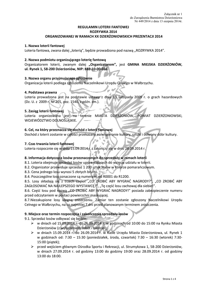 Załącznik nr 1 do Zarządzenia Burmistrza Dzierżoniowa Nr 449/2014 z dnia 13 sierpnia 2014r. REGULAMIN LOTERII FANTOWEJ ROZRYWKA 2014 ORGANIZOWANEJ W RAMACH XX DZIERŻONIOWSKICH PREZENTACJI 2014 1. Nazwa loterii fantowej Loteria fantowa, zwana dalej „loterią”, będzie prowadzona pod nazwą „ROZRYWKA 2014”. 2. Nazwa podmiotu organizującego loterię fantową Organizatorem loterii, zwanym dalej „Organizatorem”, jest GMINA MIEJSKA DZIERŻONIÓW, ul. Rynek 1, 58-200 Dzierżoniów, NIP: 882-10-00-034. 3. Nazwa organu przyjmującego zgłoszenie Organizacja loterii podlega zgłoszeniu Naczelnikowi Urzędu Celnego w Wałbrzychu. 4. Podstawa prawna Loteria prowadzona jest na podstawie ustawy z dnia 19 listopada 2009 r. o grach hazardowych (Dz. U. z 2009 r. Nr 201, poz. 1540, z późn. zm.). 5. Zasięg loterii fantowej Loteria organizowana jest na terenie MIASTA DZIERŻONIÓW, POWIAT DZIERŻONIOWSKI, WOJEWÓDZTWO DOLNOŚLĄSKIE. 6. Cel, na który przeznacza się dochód z loterii fantowej Dochód z loterii zostanie w całości przekazany na wspieranie kultury, sztuki i ochrony dóbr kultury. 7. Czas trwania loterii fantowej Loteria rozpocznie się w dniu 15.09.2014 r. i zakończy się w dniu 28.09.2014 r. 8. Informacja dotycząca losów przeznaczonych do sprzedaży w ramach loterii 8.1. Loteria obejmuje sprzedaż losów uprawniających do wzięcia udziału w loterii. 8.2. Organizator przewiduje sprzedaż 1 200 sztuk losów w kolorze pomarańczowym. 8.3. Cena jednego losu wynosi 5 złotych brutto. 8.4. Poszczególne losy oznaczone są numerami od R0001 do R1200. 8.5. Losy składają się z trzech części: „CO ZROBIĆ ABY WYGRAĆ NAGRODY?”, „CO ZROBIĆ ABY ZAGŁOSOWAĆ NA NAJLEPSZEGO WYSTAWCĘ?”, „Tę część losu zachowaj dla siebie!”. 8.6. Część losu pod nazwą „CO ZROBIĆ ABY WYGRAĆ NAGRODY!” posiada zabezpieczenie numeru przed odczytaniem w postaci powierzchni maskującej. 8.7.Niezakupione losy ulegną zniszczeniu. Zamiar ten zostanie zgłoszony Naczelnikowi Urzędu Celnego w Wałbrzychu, na co najmniej 7 dni przed planowanym terminem zniszczenia. 9. Miejsce oraz termin rozpoczęcia i zakończenia sprzedaży losów 9.1. Sprzedaż losów odbywać się będzie: w dniach od 15.09.2014 r. do 26.09.2014 r. w godzinach od 10:00 do 15:00 na Rynku Miasta Dzierżoniów (z wyłączeniem sobót i niedziel); w dniach 15.09.2014 r. do 26.09.2014 r. w Kasie Urzędu Miasta Dzierżoniowa, ul. Rynek 1 w godzinach od: 7:30 – 15:30 (poniedziałek, środa, czwartek) 7:30 – 16:30 (wtorek) 7:3015:00 (piątek); przed wejściem głównym Ośrodka Sportu i Rekreacji, ul. Strumykowa 1, 58-200 Dzierżoniów, w dniach 27.09.2014 r. od godziny 13:00 do godziny 19:00 oraz 28.09.2014 r. od godziny 13:00 do 18:00. Strona 1 z 4 Załącznik nr 1 do Zarządzenia Burmistrza Dzierżoniowa Nr 449/2014 z dnia 13 sierpnia 2014r. 10. Uczestnicy loterii fantowej 10.1. W loterii może uczestniczyć każda osoba, która akceptuje warunki regulaminu. 10.2. W loterii nie mogą brać udziału: członkowie zespołu ds. organizacji XX Dzierżoniowskich Prezentacji 2014 powołanego przez Burmistrza Dzierżoniowa Pismem Okólnym nr 47/2014 z dnia 9 maja 2014 roku a także osoby bezpośrednio współpracujące przy organizacji i obsłudze oraz członkowie ich najbliższej rodziny. Przez członków najbliższej rodziny należy rozumieć: żonę, męża, dzieci, matkę, ojca oraz rodzeństwo. 10.3. Przystąpienie uczestnika do loterii poprzez nabycie losu jest równoznaczne: z zapoznaniem się z regulaminem i akceptacją jego postanowień oraz ze zobowiązaniem się uczestnika do przestrzegania zawartych w nim zasad; z wyrażeniem zgody na przetwarzanie danych osobowych na potrzeby niniejszej loterii zgodnie z ustawą z dnia 29 sierpnia 1997 r. o ochronie danych osobowych (Dz. U. z 2002 r. Nr 101, poz. 926 z późn. zm.). 11. Zasady organizacji loterii fantowej 11.1. Warunkiem uczestnictwa w loterii jest: a) zakup losu za kwotę 5 zł brutto za sztukę w miejscach, o których mowa w punkcie 9 regulaminu; b)wrzucenie odpowiedniej części losu do zabezpieczonej i oznakowanej pomarańczowej urny stojącej na stanowisku Organizatora – TU WRZUĆ LOS na terenie hali OSiR, (na wprost wejścia na halę) ul. Strumykowa 1 w Dzierżoniowie; 11.2. Każdy z uczestników loterii ma prawo do nabycia nieograniczonej liczby losów. 12. Nagrody loterii fantowej 12.1. Nagrodami loterii są: 1. Tablet LENOVO YOGA „8” w ilości 1 sztuka, po 599,00 złotych brutto. 2. Konsola XBOX 360 + KINECT + 3 GRY w ilości 1 sztuka, po 1 279,99 złotych brutto. 3. Konsola SONY PLAYSTATION 4 + GRA w ilości 1 sztuka, po 1 842,99 złotych brutto. Łączna wartość puli nagród wynosi 3 721,98 złotych brutto. 12.2. Procentowa wartość nagród w stosunku do łącznej ceny przeznaczonych do sprzedaży losów wynosi 62,03 %. 12.3. Fundatorem nagród jest Organizator. 12.4. Oferowane przez Organizatora nagrody są rzeczami fabrycznie nowymi. 12.5. Zwycięzca ze względu na wartość nagród nie przekraczających 2 280,00 złotych brutto nie uiszcza podatku dochodowego od osób fizycznych. 13. Miejsce, termin i sposób losowania nagród 13.1. Losowanie nagród odbędzie się w dniu 28.09.2014 r. na scenie plenerowej Ośrodka Sportu i Rekreacji, ul. Strumykowa 1, 58-200 Dzierżoniów około godz. 19:10. 13.2. Losowanie odbędzie się spośród wszystkich losów wrzuconych do urny koloru pomarańczowego o nazwie „ROZRYWKA 2014” . 13.3. Omyłkowo wrzucone losy z innych loterii nie będą uwzględniane. 13.4. Losowanie poszczególnych nagród zostanie przeprowadzone przez osoby wchodzące w skład Komisji Loterii „ROZRYWKA 2014” powołanej Zarządzeniem Burmistrza Dzierżoniowa z dnia…, której przewodniczyć będzie osoba posiadająca znajomość przepisów ustawy z dnia 19 listopada 2009 r. o grach hazardowych w zakresie loterii fantowych. 13.5. Kolejność losowania nagród odbędzie się według punktu 12.1. 13.6. Prowadzący lo