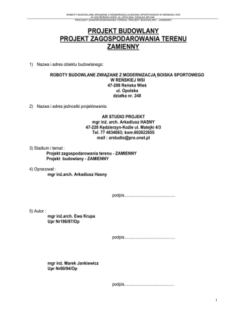 ROBOTY BUDOWLANE ZWIĄZANE Z MODERNIZACJĄ BOISKA SPORTOWEGO W REŃSKIEJ WSI 47-208 REŃSKA WIEŚ; UL.OPOLSKA; DZIAŁKA NR.248 PRZOJEKT ZAGOSPODAROWANIA TERENU, PROJEKT BUDOWLANY - ZAMIENNY PROJEKT BUDOWLANY PROJEKT ZAGOSPODAROWANIA TERENU ZAMIENNY 1) Nazwa i adres obiektu budowlanego: ROBOTY BUDOWLANE ZWIĄZANE Z MODERNIZACJĄ BOISKA SPORTOWEGO W REŃSKIEJ WSI 47-208 Reńska Wieś ul. Opolska działka nr. 248 2) Nazwa i adres jednostki projektowania: AR STUDIO PROJEKT mgr inż. arch. Arkadiusz HASNY 47-220 Kędzierzyn-Koźle ul. Matejki 4/3 Tel. 77 4834063; kom.602622655 mail : [email protected] 3) Stadium i temat : Projekt zagospodarowania terenu - ZAMIENNY Projekt budowlany - ZAMIENNY 4) Opracował : mgr inż.arch. Arkadiusz Hasny podpis............................................. 5) Autor : mgr inż.arch. Ewa Krupa Upr Nr186/87/Op podpis............................................. mgr inż. Marek Jankiewicz Upr Nr80/94/Op podpis............................................ 1 ROBOTY BUDOWLANE ZWIĄZANE Z MODERNIZACJĄ BOISKA SPORTOWEGO W REŃSKIEJ WSI 47-208 REŃSKA WIEŚ; UL.OPOLSKA; DZIAŁKA NR.248 PRZOJEKT ZAGOSPODAROWANIA TERENU, PROJEKT BUDOWLANY - ZAMIENNY 1. SPIS ZAWARTOŚCI OPRACOWANIA 1. 2. 3. 4. 5. nr strony 2 2 2 7 12 Spis zawartości opracowania Spis rysunków Opis zagospodarowania terenu Opis techniczny Zaświadczenia , oświadczenia, atesty 2. SPIS RYSUNKÓW Nr ZT1/z K12/z K13/z K14/z I3/z I4/z Nazwa rysunku Zagospodarowanie terenu Trybuny sportowe – układ Trybuny – układ, przekroje A_A Trybuny – układ, przekroje B-B Kanalizacja deszczowa - profil Kanalizacja deszczowa – studzienka chłonna Skala 1 : 250 1 : 50 1 : 20 1 : 20 1:1000/1:100 1 : 25 3. ZAGOSPODAROWANIE TERENU 3.1. PODSTAWA OPRACOWANIA : 3.1.1 Zlecenie Inwestora . URZĄD GMINY REŃSKA WIEŚ 47-208 Reńska Wieś ul. Pawłowicka 1 3.1.2. Wytyczne Inwestora 3.1.3. Uzgodnienia koncepcyjne 3.1.4. Wizja lokalna 3.1.5. Koncepcja architektoniczna zaakceptowana przez Inwestora. 3.1.6. Pozostałe dokumenty np. uzgodnienia itp. 3.1.7. Akty prawne 3.2. OPIS ZAGOSPODAROWANIA TERENU 3.2.1. PRZEDMIOT INWESTYCJI. Przedmiotem inwestycji są roboty budowlane związane z modernizacją istniejącego boiska sportowego zlokalizowanego w Reńskiej Wsi przy ul.Opolskiej, działka nr 248. Zakres inwestycji obejmuje modernizację boiska piłkarskiego wraz z okalającą ja infrastrukturą lekkoatletyczną. W miejsce dotychczasowej, szutrowej bieżni lekkoatletycznej zaprojektowano nowoczesną, czterotorową bieżnię poliuretanową 2 ROBOTY BUDOWLANE ZWIĄZANE Z MODERNIZACJĄ BOISKA SPORTOWEGO W REŃSKIEJ WSI 47-208 REŃSKA WIEŚ; UL.OPOLSKA; DZIAŁKA NR.248 PRZOJEKT ZAGOSPODAROWANIA TERENU, PROJEKT BUDOWLANY - ZAMIENNY wraz z infrastrukturą umożliwiającą rozgrywanie zawodów i mitingów lekkoatletycznych o charakterze międzywojewódzkim. Istniejące , zdezelowane trybuny zastąpiono nowymi, żelbetowymi, mogącymi pomieścić w wygodnych fotelikach 640 – stu kibiców. Całość założenia uzupełnia szereg elementów służących rekreacji codziennej dzieci, młodzieży i mieszkańców gminy w skład których wchodzą: zewnętrzne atlasy (5szt.) czy zewnętrzny stół do ping ponga. Dokumentacja zamienna zakłada wieloetapowość realizacji zadania. Etapy realizacji i ich zakres określany jest każdorazowo dla danej transzy pozyskanych środków. Zakłada się jednorazową, całościową realizację poszczególnych elementów zadania np.: 1. Bieżnie, 2. Trybuny, 3. Odwodnienie, 4. Komunikacja piesza, 5. Komunikacja kołowa, 6. Oświetlenie, 7. Ogrodzenie, 8. Wyposażenie . Nie wyklucza się realizacji poszczególnych fragmentów zadania stanowiących logiczny ciąg realizacyjny. Zakres zmian obejmuje : zmianę przebiegu wewnętrznej drogi dojazdowej (istniejącym wjazdem od ul Sportowej ), poszerzenie przejścia pomiędzy trybunami zewnętrznymi w części wschodniej, zmianę lokalizacji studni chłonnych wraz z zmianą przekroi i kierunków spływu wody deszczowej, przesunięcie placu zabaw w północną część kompleksu, wygospodarowanie miejsca parkingowego dla autobusu w obrębie pierwotnego parkingu, przesunięcie ogrodzenia od ul. Sportowej. Całość zespołu posiada sztuczne oświetlenie zewnętrznej drogi dojazdowej. Infrastruktura techniczna objęta zadaniem obejmuje: a. wykonanie przyłączy: kanalizacji deszczowej, energii elektrycznej b. wykonanie sieci zewnętrznych i instalacji wewnętrznych wraz z drenażem opaskowym placów gry Program inwestycji obejmuje wykonanie ogrodzenia wokół projektowanego kompleksu rekreacyjno sportowego oraz wyposażenie w stałe elementy małej architektury, jak: piłko chwyty ,ławeczki, stojaki na rowery, kosze na śmieci oraz stałe i ruchome elementy wyposażenia sportowego, plac zabaw dla dzieci. W obrębie projektowanego kompleksu sportowego przewidziano miejsca parkingowe dla osób korzystających z obiektu, lokując je w miejscu istniejącego, niezorganizowanego placu postojowego. Program przedsięwzięcia wymaga wyburzenia elementów kolidujących z realizacją obiektów: budynku stróżówki, magazynowej wiaty stalowej, podestu tanecznego, ogrodzenia. Dostęp do działki pozostawiono w miejscu istniejącym, nadając mu jednak nową formę przez zastosowanie systemowych rozwiązań ogrodzeń. Inwestycja przeznaczona jest do celów wypoczynku i rekreacji, służyć ma aktywacji sportowej mieszkańców Gminy Reńska Wieś. Przewiduje się wieloetapową realizację zadania. 3.2.2. ISTNIEJĄCY STAN ZAGOSPODAROWANIA TERENU. Bz. 3.2.3. PROJEKTOWANE ZAGOSPODAROWANIE TERENU. Projekt zagospodarowania terenu obejmuje swym zakresem modernizację istniejącego obiektu sportowego wraz z jego infrastrukturą stałą i ruchomą, składającego się z : 3 ROBOTY BUDOWLANE ZWIĄZANE Z MODERNIZACJĄ BOISKA SPORTOWEGO W REŃSKIEJ WSI 47-208 REŃSKA WIEŚ; UL.OPOLSKA; DZIAŁKA NR.248 PRZOJEKT ZAGOSPODAROWANIA TERENU, PROJEKT BUDOWLANY - ZAMIENNY - Boiska do piłki nożnej 68/10