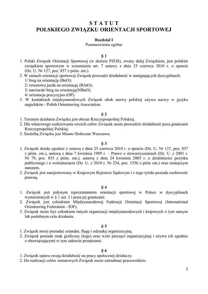 STATUT POLSKIEGO ZWIĄZKU ORIENTACJI SPORTOWEJ Rozdział I Postanowienia ogólne §1 1. Polski Związek Orientacji Sportowej (w skrócie PZOS), zwany dalej Związkiem, jest polskim związkiem sportowym w rozumieniu art. 7 ustawy z dnia 25 czerwca 2010 r. o sporcie (Dz. U. Nr 127, poz. 857 z późn. zm.). 2. W ramach orientacji sportowej Związek prowadzi działalność w następujących dyscyplinach: 1/ bieg na orientację (BnO); 2/ rowerowa jazda na orientację (RJnO); 3/ narciarski bieg na orientację(NBnO); 4/ orientacja precyzyjna (OP). 3. W kontaktach międzynarodowych Związek obok nazwy polskiej używa nazwy w języku angielskim - Polish Orienteering Association. §2 1. Terenem działania Związku jest obszar Rzeczypospolitej Polskiej. 2. Dla właściwego realizowania swoich celów Związek może prowadzić działalność poza granicami Rzeczypospolitej Polskiej. 3. Siedzibą Związku jest Miasto Stołeczne Warszawa. §3 1. Związek działa zgodnie z ustawą z dnia 25 czerwca 2010 r. o sporcie (Dz. U. Nr 127, poz. 857 z późn. zm.), ustawą z dnia 7 kwietnia 1989 r. – Prawo o stowarzyszeniach (Dz. U. z 2001 r. Nr 79, poz. 855 z późn. zm.), ustawą z dnia 24 kwietnia 2003 r. o działalności pożytku publicznego i o wolontariacie (Dz. U. z 2010 r. Nr 234, poz. 1536 z późn zm.) oraz niniejszym statutem. 2. Związek jest zarejestrowany w Krajowym Rejestrze Sądowym i z tego tytułu posiada osobowość prawną. §4 1. Związek jest jedynym reprezentantem orientacji sportowej w Polsce w dyscyplinach wymienionych w § 1 ust. 2 i poza jej granicami. 2. Związek jest członkiem Międzynarodowej Federacji Orientacji Sportowej (International Orienteering Federation - IOF). 3. Związek może być członkiem innych organizacji międzynarodowych i krajowych o tym samym lub podobnym celu działania. §5 1. Związek może posiadać sztandar, flagę i odznakę organizacyjną. 2. Związek posiada znak graficzny (logo) oraz wzór pieczęci organizacyjnej i używa ich zgodnie z obowiązującymi w tym zakresie przepisami. §6 1. Związek opiera swoją działalność na pracy społecznej działaczy. 2. Do realizacji celów statutowych Związek może zatrudniać pracowników. 1 3.Członkowie Zarządu i Komisji Rewizyjnej mogą otrzymywać z tytułu pełnienia funkcji zwrot uzasadnionych kosztów lub wynagrodzenie w wysokości nie wyższej niż określone w stosownych przepisach. §7 Minister właściwy do spraw kultury fizycznej jest organem nadzorującym działalność Związku. Rozdział II Cele i sposoby ich realizacji §8 Celami Związku są: 1/ wspieranie i upowszechnianie kultury fizycznej; 2/ organizacja i prowadzenie szkolenia i współzawodnictwa w dyscyplinach orientacji sportowej; 3/ wspieranie działalności w obszarze kultury fizycznej osób niepełnosprawnych; 4/ wspieranie i organizowanie działalności edukacyjnej i wychowawczej oraz wypoczynku dzieci i młodzieży; 5/ promowanie ekologii, ochrony zwierząt oraz ochrony dziedzictwa przyrodniczego; 6/ wspieranie działalności na rzecz integracji europejskiej, współpracy między społeczeństwami; 7/ reprezentowanie interesów dyscypliny w organizacjach krajowych i międzynarodowych; 8/ popularyzacja orientacji sportowej wśród dzieci, młodzieży szkolnej i akademickiej. §9 Związek realizuje swoje cele poprzez: 1/ zrzeszanie stowarzyszeń prowadzących działalność w zakresie biegu na orientację, rowerowej jazdy na orientację, narciarskiego biegu na orientację i orientacji precyzyjnej; 2/ opracowywanie kierunków rozwoju dyscyplin orientacji sportowej; 3/ opracowywanie i uchwalanie: a/ przepisów wszystkich dyscyplin orientacji sportowej; b/ zasad współzawodnictwa sportowego; c/ przepisów dotyczących nadawania i pozbawiania licencji klubom sportowym, zawodnikom, trenerom i sędziom; d/ regulaminu zasad i trybu zmiany przynależności klubowej; e/ regulaminu dyscyplinarnego i zasad postępowania z nim związanych, wewnątrz związkowych regulacji antydopingowych; 4/ nadawanie i pozbawianie licencji klubom sportowym uprawniających do udziału we współzawodnictwie sportowym; 5/ nadawanie i pozbawianie licencji zawodnikom, trenerom, sędziom, budowniczym tras, kartografom i topografom sportowym; 6/ organizację ogólnokrajowego systemu współzawodnictwa, w tym rozgrywek mistrzowskich mających na celu wyłonienie mistrzów Polski w określonych kategoriach i grupach wiekowych; 7/ organizowanie zawodów i imprez sportowych o zasięgu krajowym i międzynarodowym; 8/ powoływanie kadry narodowej, przygotowanie, ustalanie i zgłaszanie reprezentacji narodowej do udziału w imprezach mistrzowskich europejskich i światowych; 9/ organizowanie oraz współudział w szkoleniu kadr trenersko-instruktorskich, animatorów oraz sędziów i innych specjalności związanych z dyscyplinami orientacji sportowej; 10/ rozstrzyganie sporów powstałych między członkami Związku w wyniku ich statutowej działalności w orientacji sportowej; 11/ nakładanie kar dyscyplinarnych i sankcji regulaminowych na członków Związku, zawodników, trenerów, instruktorów, sędziów i działaczy dopuszczających się naruszenia postanowień 2 niniejszego statutu oraz regulaminów, uchwał, przepisów i zasad obowiązujących w dyscyplinach orientacji sportowej; 12/ prowadzenie ewidencji, statystyki, dokumentacji, zasobów archiwalnych oraz wydawanie sprawozdań rocznych i materiałów informacyjnych dotyczących działalności Związku; 13/ utrzymywanie stałych kontaktów z mediami oraz promowanie dyscypliny w środkach masowego przekazu; 14/ prowadzenie i inicjowanie działalności propagandowej, informacyjnej i wydawniczej; 15/ wspieranie działalności uczniowskich klubów sportowych oraz innych stowarzyszeń prowadzących sportową działalność z dziećmi, młodzieżą szkolną i akademicką; 16/ wnioskowanie i opiniowanie potrzeb w zakresie tworzenia bazy szkoleniowej; 17/ organizowanie imprez popularyzacyjnych i rekreacyjnych; 18/ pode