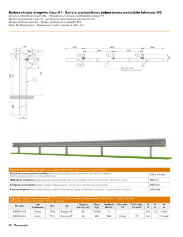 Bariera skrajna drogowa klasa H1 - Bariera wysięgnikowa jednostronna podwójnie falowana W3 Боковые ограждения класса H1 - Одинарные 2-волновые отбойники класса W3 Пътна мантинела, клас H1 - Двувълнова едностранна мантинела W3 Parapet de drum clasa H1 - Parapet de drum cu 2 ondulaţii W3 Klasa H1 Bordi anësor - Barriera me 2 valë e veçantë në reliev W3 205 4000 4000 4 4000 2000 2 2 2 205 5 310 105 3 2000 1 5 3 1 4 770 720 1700 Kierunek ruchu Направление движения 980 2 120 Dane techniczne Характеристики, Характеристики, Caracteristici, Karakteristika Wysokość ponad poziom podłoża Высота над уровнем земли, Височина над нивото на земята, 770 ± 10 mm Înălţimea deasupra solului, Lartësia jashtë tokës Głębokość osadzenia Глубина проникновения, Дълбочина на проникване, Adâncimea penetrării, Thellësia e nguljes 980 mm Szerokość zewnętrzna Общая ширина, Обща ширина, Lăţimea generală, Përmasat transversale 205l mm Rozstaw słupków Расстояние между столбами, Разстояние между стълбчетата, Spaţierea în spate, Interaksi i shtyllave 2000 mm Raporty z testów zderzeniowych, Отчеты по испытаниям столкновением, Резултати от краш тестове Rapoartele testului de impact, Raporti i provës Nr testu Lab. badawcze Test Typ Długość bariery (m) Masa (kg) Prędkość (km/h) PROVA 939 Aisico TB42 Boczny 15° 68 10.000 70 PROVA 941 Aisico TB11 Boczny 20° 68 900 100 30 Marcegaglia ASI maks. THIV maks. 1.4 33 km/h 0,8=A 27 D m Vi m W m 0,8 1,3 1=W3 0,6 0,7=W2 n. AISICO 281/2131/CPD/2012 2 1 2 4 3 5 2 3 O Ц dci ен ne тр k O ś Ко dci аль rod n на ko нц ek я w ев k ча y ая oń с ча cow ть ст y ь 1 5 2 6 4 2 3 5 3 5 4 3 5 3 5 Componenti Components, Bauteile, Composants, Elementos Opis - Odcinek środkowy Materiał Kod Описание - Центральная часть Материал Обозначение 5 Śruba z nakrętką i podkładką Болт с гайкой и шайбой, Болт с гайка и шайба, M12x50 mm Classe 8.8 63800857 4 Şuru cu piuliţă şi şaibă, Bulon komplet me dado dhe rondele M16x30 mm Classe 8.8 63800012 3 Płytka maskująca gniazdo Пластина-крышка для паза, Покриваща пластина за отвори, Placă de acoperire pentru fante, Piastër mbuluese shlize 100x40x4 mm S 275 JR 59600127 2 Słupek “C” Столб “С”, С-образно стълбче, Stâlp C, Shtyllë “C” 120x55x30 Th=4 H=1700mm S 275 JR 59400866 1 Profil podwójnie falowany 2-волновой профиль, Двувълнов профил, Lisă cu 2 ondulaţii, Fashë 2 valë L=4316 Th=2 mm S 355 JR 59300502 S 275 JR 59400866 Opis - Odcinek końcowy Описание - Концевая часть 2 Słupek “C” Столб “С”, С-образно стълбче, Stâlp C, Shtyllë “C” 120x55x30 Th=4 H=1700mm 5 Śruba z nakrętką i podkładką Болт с гайкой и шайбой, Болт с гайка и шайба, M12x50 mm Classe 8.8 63800857 4 Şuru cu piuliţă şi şaibă, Bulon komplet me dado dhe rondele M16x30 mm Classe 8.8 63800012 3 6 1 Płytka maskująca gniazdo Пластина-крышка для паза, Покриваща пластина за отвори, Placă de acoperire pentru fante, Piastër mbuluese shlize Profil poprzeczny Поперечная рейка, Напречна пластина, Placa transversala, Pllakë tërthore Podwójnie falowany odcinek końcowy w kształcie płetwy 2-волновое с раструбом, Двувълнов с формата на рибешка опашка, Coadă de peşte, 2 ondulaţii, Terminal në formë freskoreje me 2 valë 100x40x4 mm S 275 JR 59600127 70x5 mm S 275 JR 59603594 S 235 JR 59600134 Marcegaglia 31