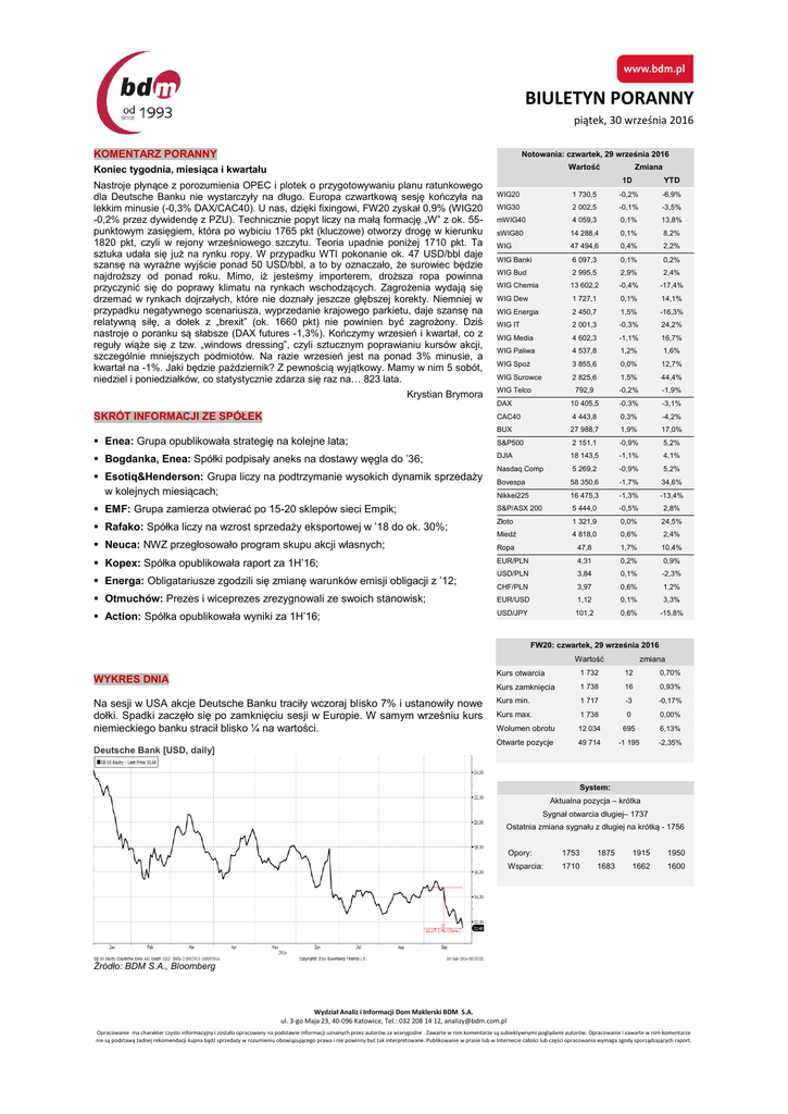 BIULETYN PORANNY piątek, 30 września 2016 KOMENTARZ PORANNY Notowania: czwartek, 29 września 2016 Wartość Koniec tygodnia, miesiąca i kwartału Nastroje płynące z porozumienia OPEC i plotek o przygotowywaniu planu ratunkowego dla Deutsche Banku nie wystarczyły na długo. Europa czwartkową sesję kończyła na lekkim minusie (-0,3% DAX/CAC40). U nas, dzięki fixingowi, FW20 zyskał 0,9% (WIG20 -0,2% przez dywidendę z PZU). Technicznie popyt liczy na małą formację „W” z ok. 55punktowym zasięgiem, która po wybiciu 1765 pkt (kluczowe) otworzy drogę w kierunku 1820 pkt, czyli w rejony wrześniowego szczytu. Teoria upadnie poniżej 1710 pkt. Ta sztuka udała się już na rynku ropy. W przypadku WTI pokonanie ok. 47 USD/bbl daje szansę na wyraźne wyjście ponad 50 USD/bbl, a to by oznaczało, że surowiec będzie najdroższy od ponad roku. Mimo, iż jesteśmy importerem, droższa ropa powinna przyczynić się do poprawy klimatu na rynkach wschodzących. Zagrożenia wydają się drzemać w rynkach dojrzałych, które nie doznały jeszcze głębszej korekty. Niemniej w przypadku negatywnego scenariusza, wyprzedanie krajowego parkietu, daje szansę na relatywną siłę, a dołek z „brexit” (ok. 1660 pkt) nie powinien być zagrożony. Dziś nastroje o poranku są słabsze (DAX futures -1,3%). Kończymy wrzesień i kwartał, co z reguły wiąże się z tzw. „windows dressing”, czyli sztucznym poprawianiu kursów akcji, szczególnie mniejszych podmiotów. Na razie wrzesień jest na ponad 3% minusie, a kwartał na -1%. Jaki będzie październik? Z pewnością wyjątkowy. Mamy w nim 5 sobót, niedziel i poniedziałków, co statystycznie zdarza się raz na… 823 lata. Krystian Brymora SKRÓT INFORMACJI ZE SPÓŁEK Zmiana 1D YTD -6,9% WIG20 1 730,5 -0,2% WIG30 2 002,5 -0,1% -3,5% mWIG40 4 059,3 0,1% 13,8% sWIG80 14 288,4 0,1% 8,2% WIG 47 494,6 0,4% 2,2% WIG Banki 6 097,3 0,1% 0,2% WIG Bud 2 995,5 2,9% 2,4% WIG Chemia 13 602,2 -0,4% -17,4% WIG Dew 1 727,1 0,1% 14,1% WIG Energia 2 450,7 1,5% -16,3% WIG IT 2 001,3 -0,3% 24,2% WIG Media 4 602,3 -1,1% 16,7% WIG Paliwa 4 537,8 1,2% 1,6% WIG Spoż 3 855,6 0,0% 12,7% WIG Surowce 2 825,6 1,5% 44,4% 792,9 -0,2% -1,9% DAX 10 405,5 -0,3% -3,1% CAC40 4 443,8 0,3% -4,2% BUX 27 988,7 1,9% 17,0% WIG Telco Enea: Grupa opublikowała strategię na kolejne lata; S&P500 2 151,1 -0,9% 5,2% Bogdanka, Enea: Spółki podpisały aneks na dostawy węgla do ’36; DJIA 18 143,5 -1,1% 4,1% Nasdaq Comp 5 269,2 -0,9% 5,2% Bovespa 58 350,6 -1,7% 34,6% -13,4% Esotiq&Henderson: Grupa liczy na podtrzymanie wysokich dynamik sprzedaży w kolejnych miesiącach; Nikkei225 16 475,3 -1,3% EMF: Grupa zamierza otwierać po 15-20 sklepów sieci Empik; S&P/ASX 200 5 444,0 -0,5% 2,8% Rafako: Spółka liczy na wzrost sprzedaży eksportowej w ’18 do ok. 30%; Złoto 1 321,9 0,0% 24,5% Miedź 4 818,0 0,6% 2,4% Neuca: NWZ przegłosowało program skupu akcji własnych; Ropa 47,8 1,7% 10,4% Kopex: Spółka opublikowała raport za 1H’16; EUR/PLN 4,31 0,2% 0,9% USD/PLN 3,84 0,1% -2,3% 1,2% Energa: Obligatariusze zgodzili się zmianę warunków emisji obligacji z ’12; CHF/PLN 3,97 0,6% Otmuchów: Prezes i wiceprezes zrezygnowali ze swoich stanowisk; EUR/USD 1,12 0,1% 3,3% Action: Spółka opublikowała wyniki za 1H’16; USD/JPY 101,2 0,6% -15,8% FW20: czwartek, 29 września 2016 Wartość WYKRES DNIA Na sesji w USA akcje Deutsche Banku traciły wczoraj blisko 7% i ustanowiły nowe dołki. Spadki zaczęło się po zamknięciu sesji w Europie. W samym wrześniu kurs niemieckiego banku stracił blisko ¼ na wartości. Deutsche Bank [USD, daily] zmiana Kurs otwarcia 1 732 12 Kurs zamknięcia 1 738 16 0,93% Kurs min. 1 717 -3 -0,17% 0,00% 0,70% Kurs max. 1 738 0 Wolumen obrotu 12 034 695 6,13% Otwarte pozycje 49 714 -1 195 -2,35% System: Aktualna pozycja – krótka Sygnał otwarcia długiej– 1737 Ostatnia zmiana sygnału z długiej na krótką - 1756 Opory: 1753 1875 1915 1950 Wsparcia: 1710 1683 1662 1600 Źródło: BDM S.A., Bloomberg Wydział Analiz i Informacji Dom Maklerski BDM S.A. ul. 3-go Maja 23, 40-096 Katowice, Tel.: 032 208 14 12, [email protected] Opracowanie ma charakter czysto informacyjny i zostało opracowany na podstawie informacji uznanych przez autorów za wiarygodne . Zawarte w nim komentarze są subiektywnymi poglądami autorów. Opracowanie i zawarte w nim komentarze nie są podstawą żadnej rekomendacji kupna bądź sprzedaży w rozumieniu obowiązującego prawa i nie powinny być tak interpretowane. Publikowanie w prasie lub w Internecie całości lub części opracowania wymaga zgody sporządzających raport. BIULETYN PORANNY piątek, 30 września 2016 GPW – PODSUMOWANIE Indeksy GPW FW20 (1,732.00, 1,738.00, 1,717.00, 1,738.00, +16.0000) 2000 1950 1900 Open Low High Close WIG20 1 730,7 1 715,8 1 735,5 1 730,5 -0,2% 482 WIG30 2 002,0 1 983,8 2 006,3 2 002,5 -0,1% 685 MWIG40 4 071,4 14 245,6 14 331,9 4 059,3 0,1% 259 SWIG80 14 305,8 4 038,2 4 081,3 14 288,4 0,1% 34 WIG-PL 48 209,6 48 010,7 48 245,9 48 245,9 0,4% 785 WIG 47 554,4 47 203,9 47 644,5 47 494,6 0,4% 806 WIG20 Cena Mkt Cap Alior 1750 1700 1650 21 29 4 11 April 18 25 2 9 May 16 23 30 6 June 13 20 27 4 July 11 18 25 1 8 August 16 22 29 5 12 19 September 26 3 10 October WIG20 (1,730.66, 1,735.49, 1,715.78, 1,730.45, -4.14001) 2000 1950 1900 1850 1800 1750 1700 47,39 zmi ana 1D YTD 6 126 0,2% -12,6% 1850 1800 Zmiana Obrót Indeks Asseco PL 55,15 4 577 -1,6% -2,9% BZ WBK 314,00 31 160 -0,8% 10,6% CCC 180,00 7 043 1,1% 29,9% Cyfrowy P. 25,00 15 989 -1,7% 19,7% Enea 9,00 3 973 1,6% -20,4% Energa 7,60 3 147 1,2% -39,9% Eurocash 42,71 5 941 1,8% -11,9% KGHM 74,20 14 840 1,3% 16,9% Lotos 28,80 5 324 5,1% 6,7% LPP 3 968,00 7 282 -0,1% -28,6% mBANK 346,85 14 665 -0,9% 10,5% Orange 5,94 7 795 0,0% -9,5% Pekao 127,00 33 334 0,6% -11,5% PGE 10,48 19 595 2,3% -18,1% PGNIG 5,15 30 385 0,8% 0,2% PKN Orlen 65,18 27 878 0,9% -3,9% PKOBP 26,38 32 975 -0,5% -3,5% PZU 24,69 21 320 1,5% -27,4% Tauron 2,57 4 50