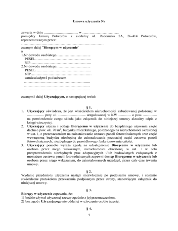Umowa użyczenia Nr zawarta w dniu ...................................... w …………………………. pomiędzy Gminą Potworów z siedzibą: ul. Radomska 2A, reprezentowanym przez: …………………………………………………………… zwanym dalej ”Biorącym w użyczenie” a 1.Nr dowodu osobistego……………………….. PESEL……………………………………….. NIP…………………………………………… 2.Nr dowodu osobistego……………………….. PESEL……………………………………….. NIP…………………………………………… zamieszkałym/i pod adresem ……………………………………………...... ……………………………………………….. ……………………………………………….. 26-414 Potworów, zwanym/i dalej Użyczającym, o następującej treści: § 1. 1. Użyczający oświadcza, że jest właścicielem nieruchomości zabudowanej położonej w ................... przy ul. ............................... uregulowanej w KW .............. o pow. ............... na potwierdzenie czego składa jako załącznik do niniejszej umowy aktualny odpis z księgi wieczystej. 2. Użyczający użycza i oddaje Biorącemu w użyczenie do bezpłatnego używania część dachu o pow. ok. 70 m2, budynku mieszkalnego, położonego na nieruchomości określonej w ust. 1, z przeznaczeniem na zainstalowanie zestawu paneli fotowoltaicznych oraz część wewnętrzną budynku niezbędną do zainstalowania pozostałej część zestawu paneli fotowoltaicznych, niezbędnego do prawidłowego funkcjonowania całości. 3. Użyczający ponadto wyraża zgodę na udostępnienie Biorącemu w użyczenie lub osobom przez niego wskazanym, nieruchomości określonej w ust. 1 w celu przeprowadzenia niezbędnych prac adaptacyjnych i/lub budowlanych związanych z montażem zestawu paneli fotowoltaicznych zapewni dostęp Biorącemu w użyczenie lub osobom przez niego wskazanym, do zainstalowanych urządzeń, przez cały czas trwania umowy. § 2. Wydanie przedmiotu użyczenia nastąpi niezwłocznie po podpisaniu umowy, i zostanie stwierdzone protokołem przekazania podpisanym przez strony, stanowiącym załącznik do niniejszej umowy. § 3. Biorący w użyczenie zapewnia, że: 1) będzie używał użyczonej rzeczy zgodnie z jej przeznaczeniem, 2) bez zgody Użyczającego nie odda jej w użyczenie osobie trzeciej. § 4. 1 1. Umowa zostaje zawarta na czas określony od dnia podpisania umowy do dnia 31 grudnia ……. r. jednak nie dłużej niż do upływu 5 lat od dnia zatwierdzenia końcowego raportu z realizacji przedsięwzięcia pn. „Budowa instalacji fotowoltaicznych na terenie Gminy Potworów”. 2. Umowa użyczenia ulega rozwiązaniu ze skutkiem natychmiastowym w następujących przypadkach: 1) gdy Biorąca w użyczenie Gmina Potworów nie uzyska pozytywnego wyniku na etapie oceny formalnej lub merytorycznej wniosku aplikacyjnego złożonego w 2016 r. w ramach RPO Województwa Mazowieckiego – Działanie 4.1 „Odnawialne źródła energii” o dofinansowanie przedsięwzięcia pod nazwą „Budowa instalacji fotowoltaicznych na terenie Gminy Potworów” obejmującego zakup i instalację zestawów paneli fotowoltaicznych w indywidualnych gospodarstwach domowych mieszkańców Gminy Potworów, 2) gdy nie dojdzie do podpisania umowy o dofinansowanie przedsięwzięcia pod nazwą „Budowa instalacji fotowoltaicznych na terenie Gminy Potworów”, 3) rozwiązania umowy montażu zestawu fotowoltaicznego zawartej pomiędzy tymi samymi stronami. 3. W przypadku wcześniejszego rozwiązania umowy przez Użyczającego, dokona on zwrotu nakładów poniesionych przez Biorącego w użyczenie na zakup i zainstalowanie zestawu paneli fotowoltaicznych, którego szacunkową wartość w dniu podpisania umowy określa się na kwotę 70.000 zł netto. 4. Postanowienia ust. 3 mają zastosowanie w przypadku, zbycia nieruchomości, jeśli nabywca lub następca prawny nie wstąpi w prawa strony niniejszej umowy. § 5. Po zakończeniu użyczenia, Biorący w użyczenie obowiązany jest zwrócić przedmiot umowy w stanie niepogorszonym wraz z zainstalowaną infrastrukturą, bez dodatkowego wezwania ze strony Użyczającego, co zostanie stwierdzone protokołem odbioru podpisanym przez obie strony, jednakże Biorący w użyczenie nie ponosi odpowiedzialności za zużycie rzeczy będące następstwem prawidłowego używania. § 6. Wszelkie zmiany umowy mogą być dokonywane przez strony w formie pisemnej pod rygorem nieważności. § 7. Do spraw nieuregulowanych niniejszą umową zastosowane mają właściwe przepisy Kodeksu Cywilnego. § 8. Umowę sporządzono w dwóch jednobrzmiących egzemplarzach, po jednym dla każdej ze stron. Użyczający: Biorący w użyczenie: 2 UMOWA zawarta w dniu ...................................... w …………………………. pomiędzy Gminą Potworów z siedzibą: ul. Radomska 2A, reprezentowanym przez: …………………………………………………………… zwanym dalej ”Biorącym w użyczenie” a 1.Nr dowodu osobistego……………………….. PESEL……………………………………….. NIP…………………………………………… 2.Nr dowodu osobistego……………………….. PESEL……………………………………….. NIP…………………………………………… zamieszkałym/i pod adresem ……………………………………………...... ……………………………………………….. ……………………………………………….. zwanym/i dalej Właścicielem, o następującej treści: 1. 2. 3. 4. 26-414 Potworów, § 1. Przedmiot umowy Przedmiotem niniejszej umowy jest ustalenie wzajemnych zobowiązań organizacyjnych i finansowych, związanych z montażem zestawu paneli fotowoltaicznych w budynku mieszkalnym Właściciela, realizowanym w ramach projektu „Budowa instalacji fotowoltaic