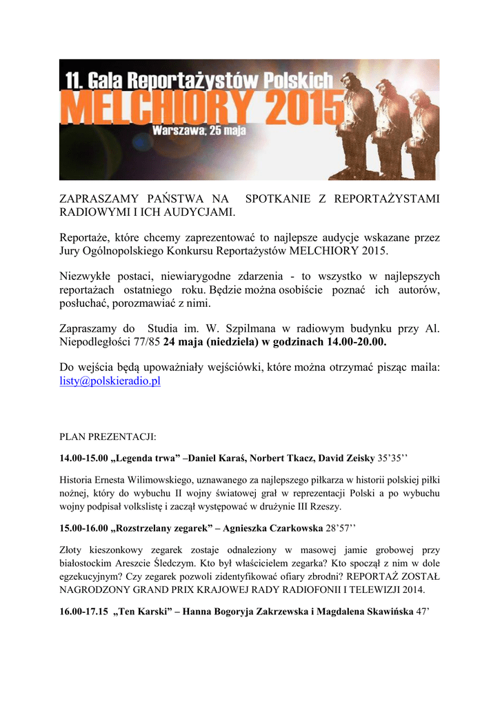 ZAPRASZAMY PAŃSTWA NA SPOTKANIE Z REPORTAŻYSTAMI RADIOWYMI I ICH AUDYCJAMI. Reportaże, które chcemy zaprezentować to najlepsze audycje wskazane przez Jury Ogólnopolskiego Konkursu Reportażystów MELCHIORY 2015. Niezwykłe postaci, niewiarygodne zdarzenia - to wszystko w najlepszych reportażach ostatniego roku. Będzie można osobiście poznać ich autorów, posłuchać, porozmawiać z nimi. Zapraszamy do Studia im. W. Szpilmana w radiowym budynku przy Al. Niepodległości 77/85 24 maja (niedziela) w godzinach 14.00-20.00. Do wejścia będą upoważniały wejściówki, które można otrzymać pisząc maila: [email protected] PLAN PREZENTACJI: 14.00-15.00 „Legenda trwa” –Daniel Karaś, Norbert Tkacz, David Zeisky 35’35’’ Historia Ernesta Wilimowskiego, uznawanego za najlepszego piłkarza w historii polskiej piłki nożnej, który do wybuchu II wojny światowej grał w reprezentacji Polski a po wybuchu wojny podpisał volkslistę i zaczął występować w drużynie III Rzeszy. 15.00-16.00 „Rozstrzelany zegarek” – Agnieszka Czarkowska 28’57’’ Złoty kieszonkowy zegarek zostaje odnaleziony w masowej jamie grobowej przy białostockim Areszcie Śledczym. Kto był właścicielem zegarka? Kto spoczął z nim w dole egzekucyjnym? Czy zegarek pozwoli zidentyfikować ofiary zbrodni? REPORTAŻ ZOSTAŁ NAGRODZONY GRAND PRIX KRAJOWEJ RADY RADIOFONII I TELEWIZJI 2014. 16.00-17.15 „Ten Karski” – Hanna Bogoryja Zakrzewska i Magdalena Skawińska 47’ Młodzi porównują go do Jamesa Bonda. Powstał nawet o nim pierwszy utwór hip-hopowy. Prezydent USA Barack Obama odznaczył go Prezydenckim Medalem Wolności. Legendarny Emisariusz Polskiego Państwa Podziemnego. Z uporem informował świat o Holokauście. 17.15- 18.00 „Wkręceni w Charlottę” – Anna Rębas 25’ - Historia jak z filmu - mówi gdańska malarka Magda Beneda. Zainteresował ją nagrobek na sopockim cmentarzu a pochowana tu dziewczyna, która zmarła w 1923 roku mając 18 lat stała się dla niej inspiracją. Kim była Charlotta? Anna Rębas spotkała się z malarką oraz gdańskim pisarzem Mieczysławem Abramowiczem. 18.00-19.15 „Chcę więcej” - Bartosz Panek 43’ Poruszająca historia Dominika Połońskiego – utalentowanego wiolonczelisty, laureata wielu muzycznych nagród, który po poważnej chorobie może grać na swoim instrumencie tylko jedną ręką. Jak odnalazł siebie w świecie, w którym niemal każda czynność wymaga użycia obu rąk? Jak zmieniła się jego muzyka i sposób gry? REPORTAŻ ZOSTAŁ NAGRODZONY PRIX ITALIA 2014. 19.15 – 20.00 „Ocalona rodzinna historia” - Małgorzata Furga i Magdalena Kolatowska 32’07’’ Historia rodziny z Kresów, którą dotknęły pogromy ukraińskie. Przez długie lata historia tamtych dni przekazywana była ustnie w rodzinnych opowieściach. Niedawno jedna z prawnuczek postanowiła ją zapisać.